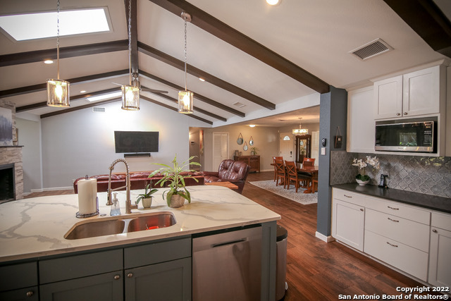Charming 4-Bedroom Ranch-Style Home in Northwood. Beautifully updated one-story home offering 4 bedrooms, 2.5 baths, and a large private backyard, this home is perfect for comfortable living and effortless entertaining. Step inside to an open, airy floor plan featuring three versatile living areas, a dedicated dining space, and a flex room ideal for a home office or playroom. The chef-inspired kitchen is a standout with its oversized island, breakfast bar, and sleek stainless steel appliances-including a refrigerator. The spacious primary suite is tucked away at the back of the home for added privacy and includes direct access to the backyard patio. Secondary bedrooms share an updated full bath with dual vanities, and there's an additional half bath for guests. Enjoy sunny days and starry nights in the fenced backyard, complete with a generous patio and a dog run-perfect for both relaxing and play. A roomy laundry/mudroom provides convenient access to the oversized garage, making it easy to kick off your shoes before heading inside. Located in North East ISD, just minutes from Alamo Heights, great shopping, dining, and Fort Sam Houston.
