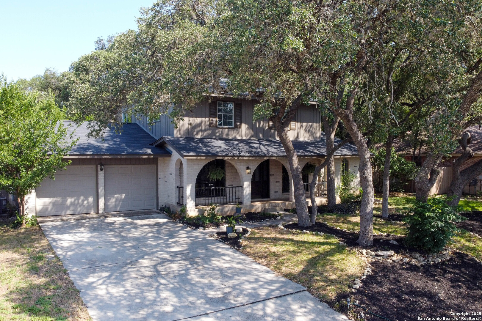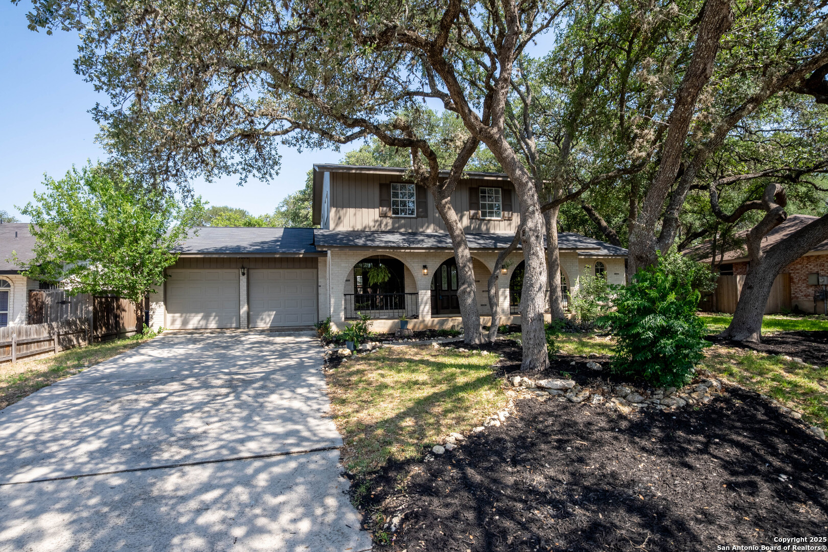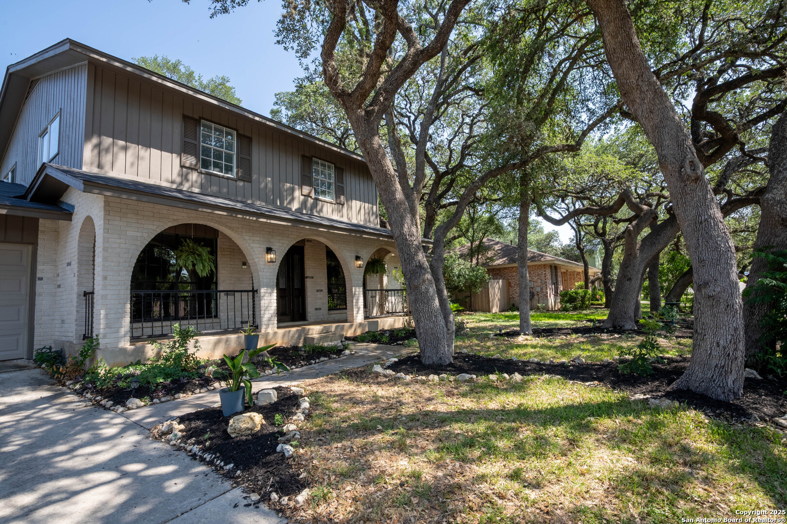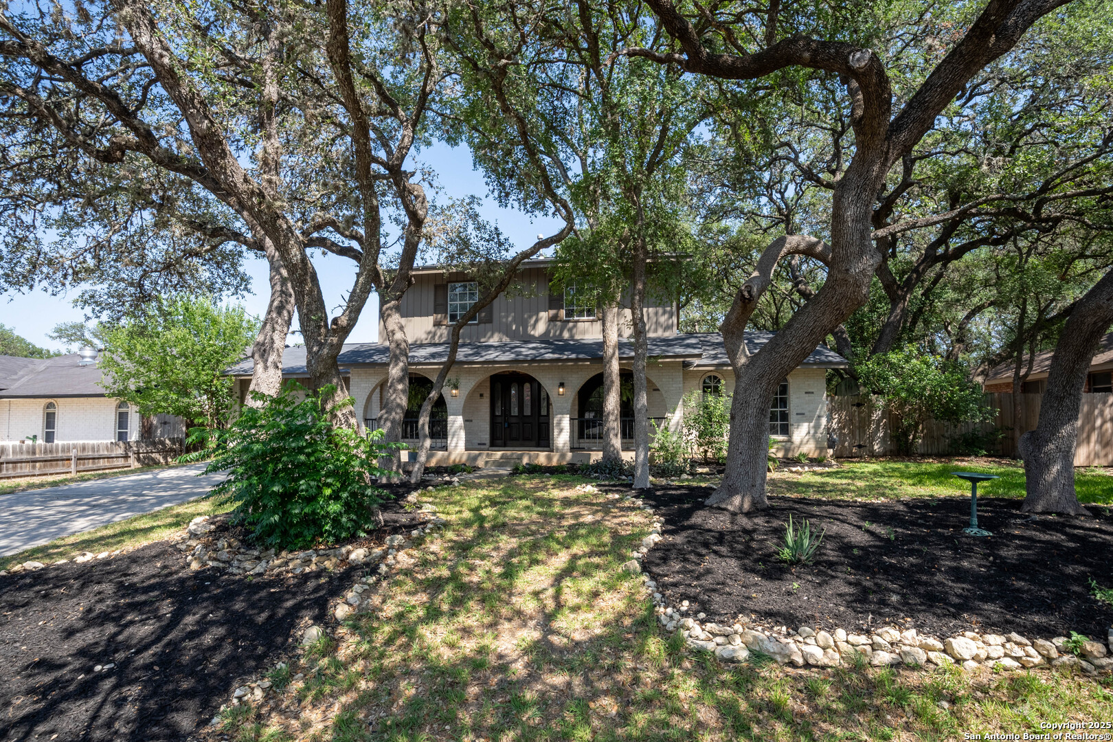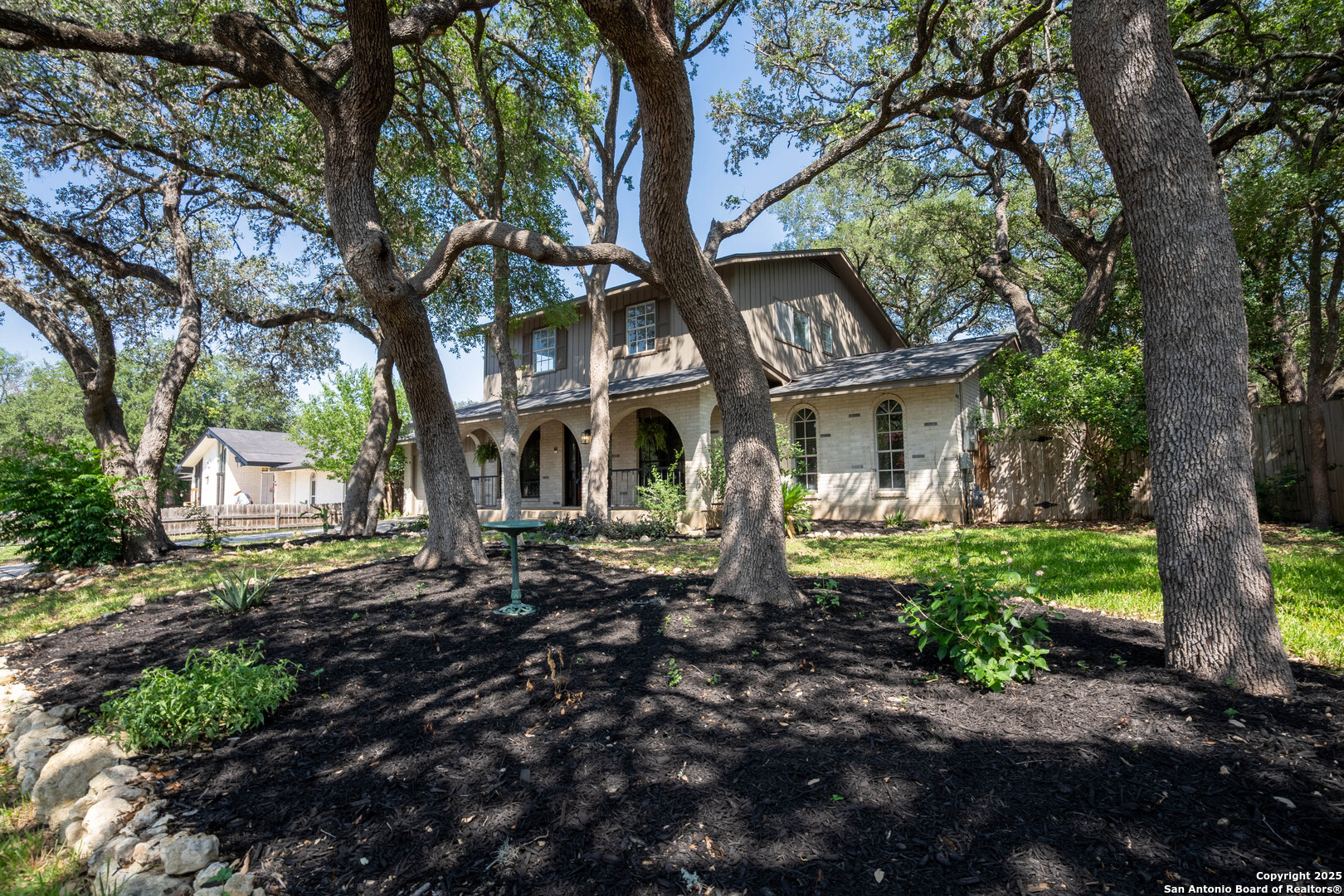 Nestled in the peaceful Charter Oaks neighborhood, this beautifully updated 4-bedroom, 3-bathroom home offers elegant curb appeal with grand arches, wrought iron railings, and mature trees framing oversized front and back yards. Inside, natural light floods the living spaces, highlighting a formal living room that doubles as a study and a striking floor-to-ceiling fireplace in the main living area. The kitchen boasts new quartz countertops, painted solid wood cabinets, and a stainless steel appliance package, while a sunny bay window breakfast nook overlooks the backyard. The spacious downstairs master suite features a designer-finished bath with a frameless glass walk-in shower. Texas-sized secondary bedrooms offer ample space and comfort. Step outside to a covered patio ideal for entertaining, and enjoy the ample parking of an oversized garage with workshop area. With over $100,000 in recent updates-including HVAC system-this home is move-in ready. Located with easy access to major highways, the Medical Center, USAA, and premier shopping and dining destinations like The Rim and The Pearl, convenience is unmatched. No HOA, and the neighborhood offers an optional pool and clubhouse membership. Don't miss the opportunity to own in one of San Antonio's most charming established communities!