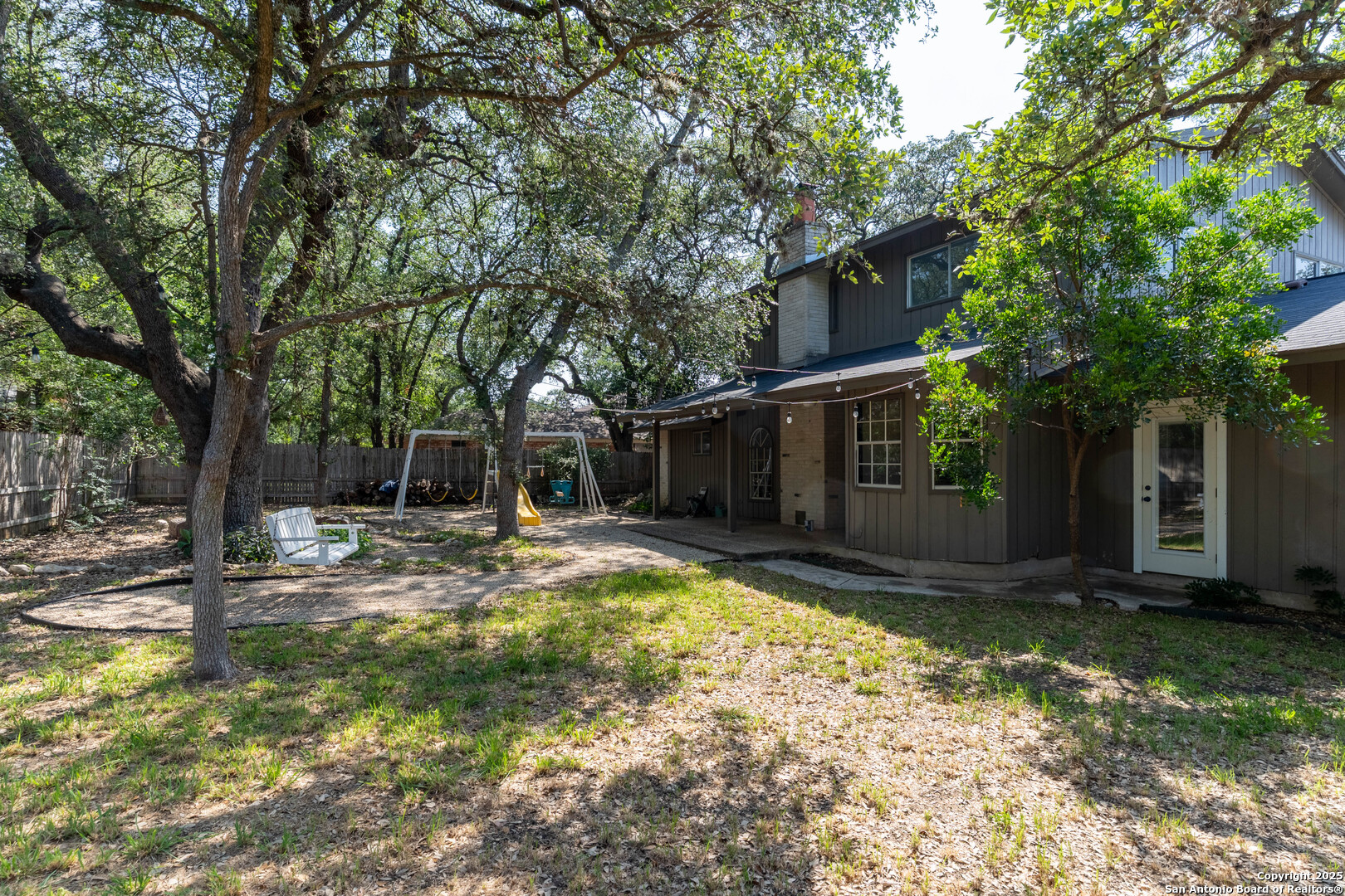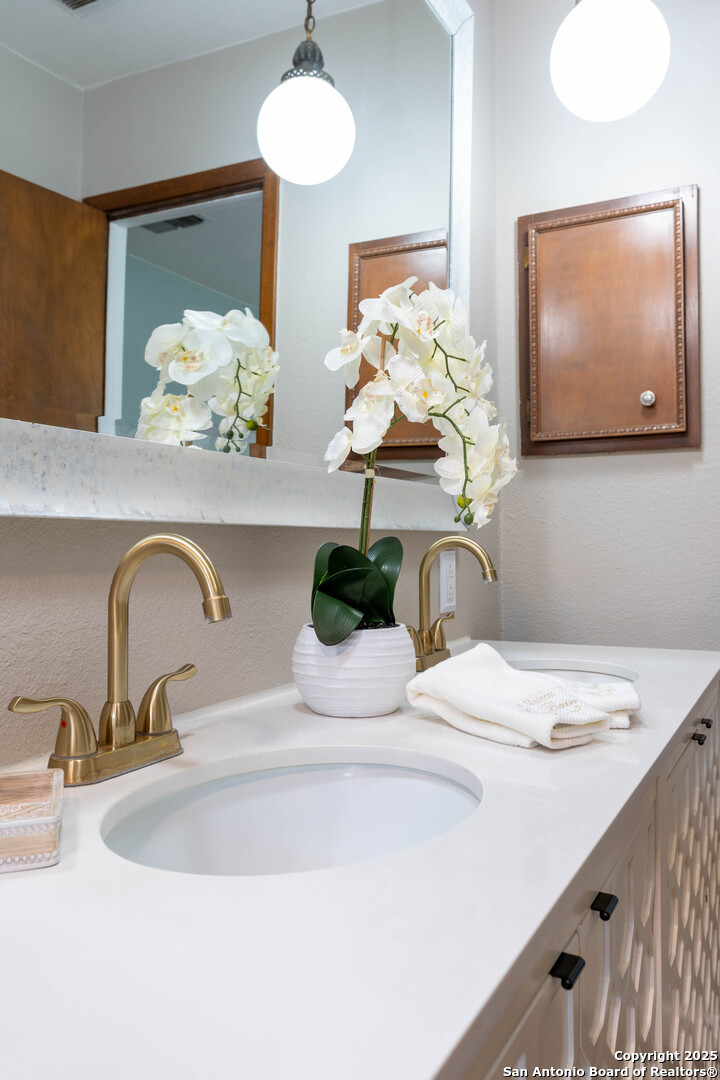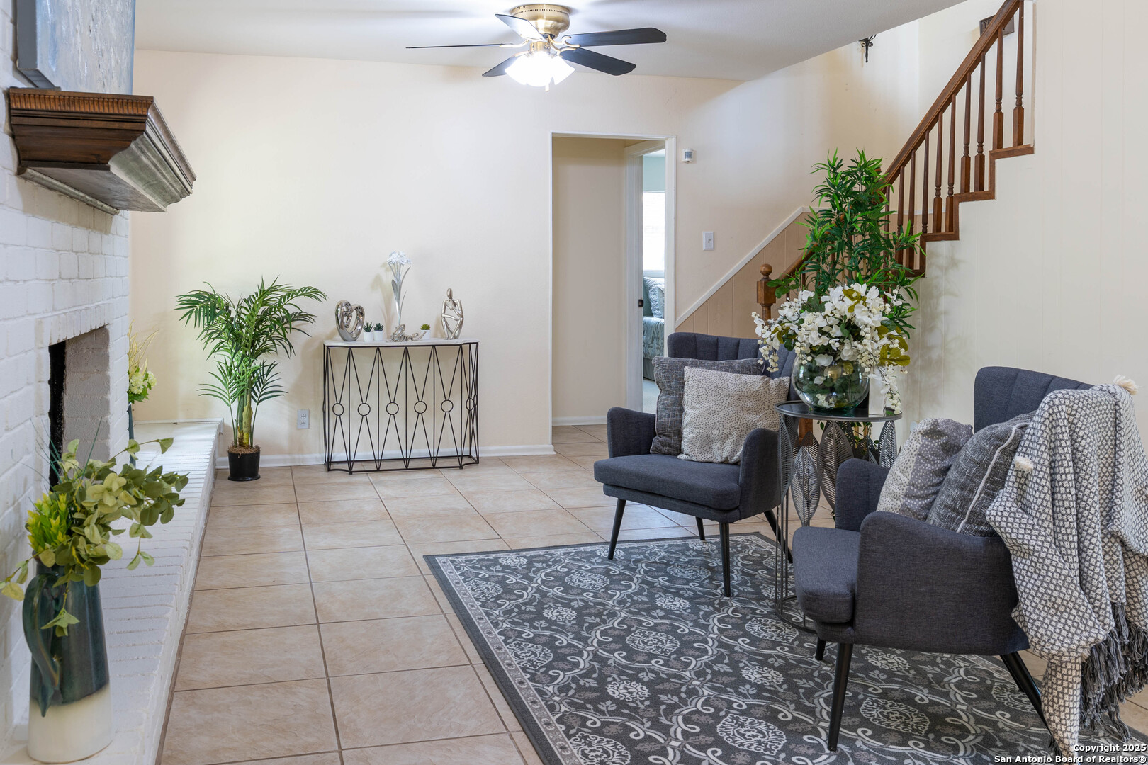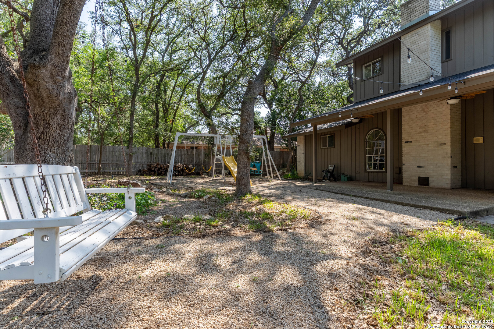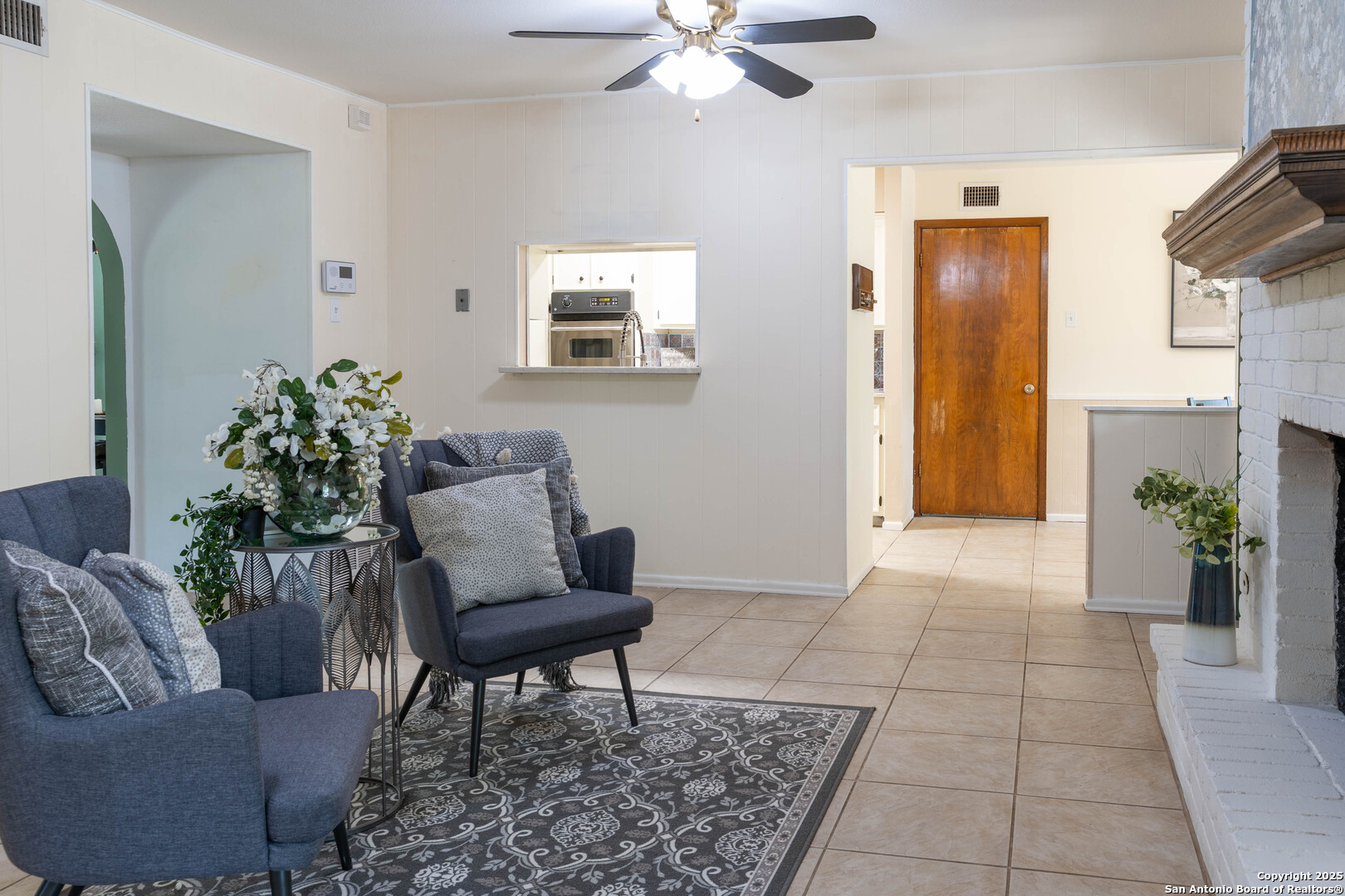 Nestled in the peaceful Charter Oaks neighborhood, this beautifully updated 4-bedroom, 3-bathroom home offers elegant curb appeal with grand arches, wrought iron railings, and mature trees framing oversized front and back yards. Inside, natural light floods the living spaces, highlighting a formal living room that doubles as a study and a striking floor-to-ceiling fireplace in the main living area. The kitchen boasts new quartz countertops, painted solid wood cabinets, and a stainless steel appliance package, while a sunny bay window breakfast nook overlooks the backyard. The spacious downstairs master suite features a designer-finished bath with a frameless glass walk-in shower. Texas-sized secondary bedrooms offer ample space and comfort. Step outside to a covered patio ideal for entertaining, and enjoy the ample parking of an oversized garage with workshop area. With over $100,000 in recent updates-including HVAC system-this home is move-in ready. Located with easy access to major highways, the Medical Center, USAA, and premier shopping and dining destinations like The Rim and The Pearl, convenience is unmatched. No HOA, and the neighborhood offers an optional pool and clubhouse membership. Don't miss the opportunity to own in one of San Antonio's most charming established communities!