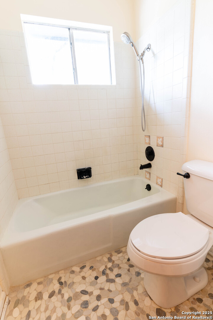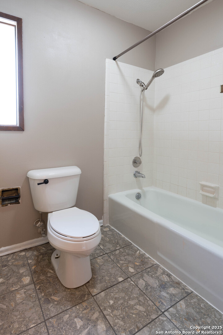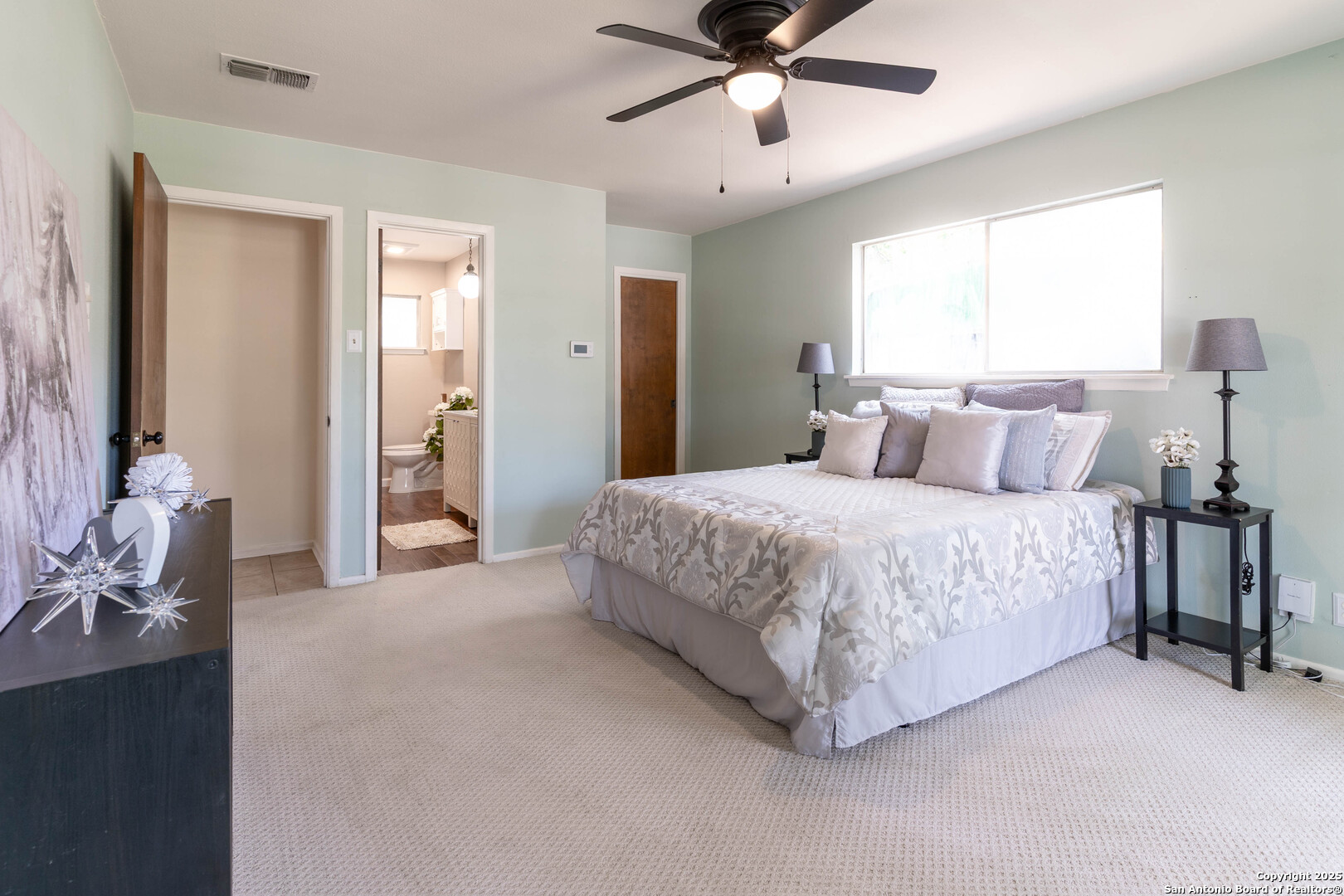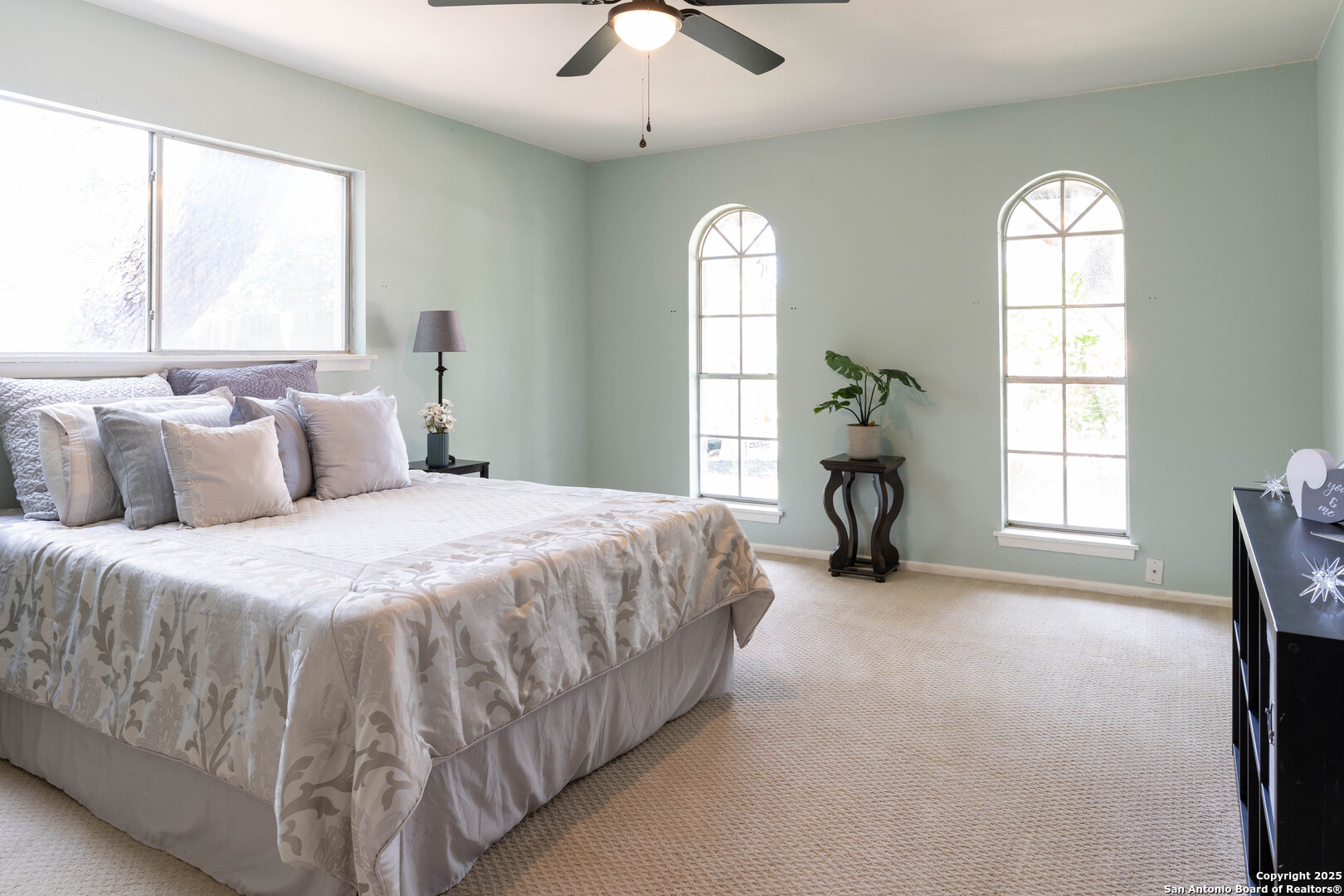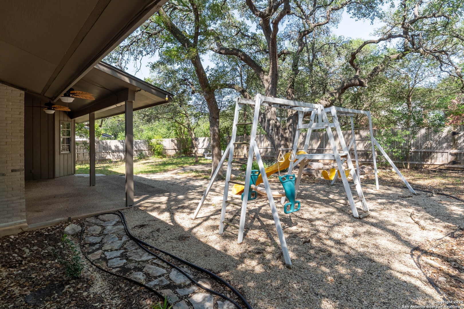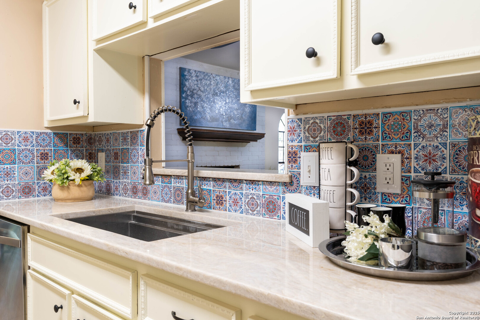 Nestled in the peaceful Charter Oaks neighborhood, this beautifully updated 4-bedroom, 3-bathroom home offers elegant curb appeal with grand arches, wrought iron railings, and mature trees framing oversized front and back yards. Inside, natural light floods the living spaces, highlighting a formal living room that doubles as a study and a striking floor-to-ceiling fireplace in the main living area. The kitchen boasts new quartz countertops, painted solid wood cabinets, and a stainless steel appliance package, while a sunny bay window breakfast nook overlooks the backyard. The spacious downstairs master suite features a designer-finished bath with a frameless glass walk-in shower. Texas-sized secondary bedrooms offer ample space and comfort. Step outside to a covered patio ideal for entertaining, and enjoy the ample parking of an oversized garage with workshop area. With over $100,000 in recent updates-including HVAC system-this home is move-in ready. Located with easy access to major highways, the Medical Center, USAA, and premier shopping and dining destinations like The Rim and The Pearl, convenience is unmatched. No HOA, and the neighborhood offers an optional pool and clubhouse membership. Don't miss the opportunity to own in one of San Antonio's most charming established communities!