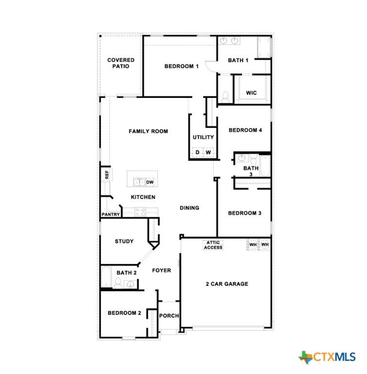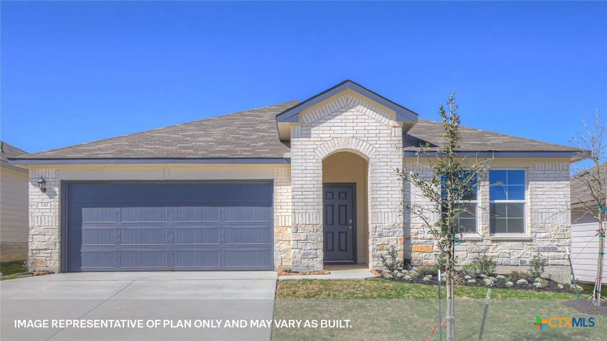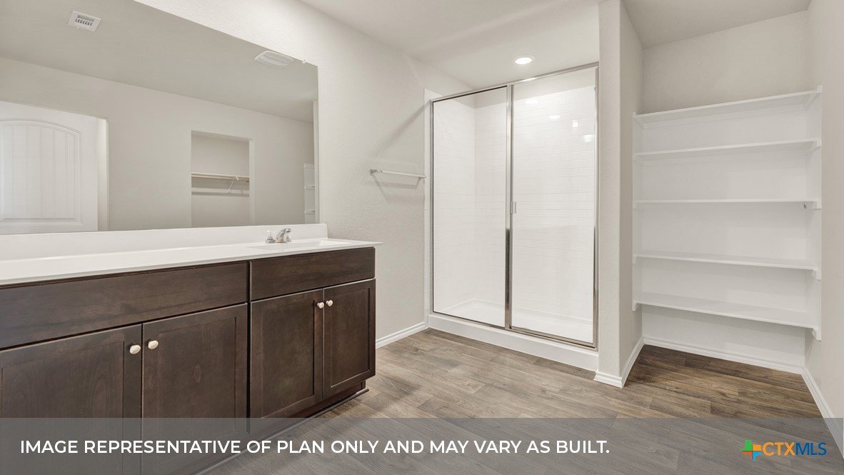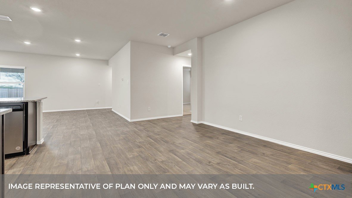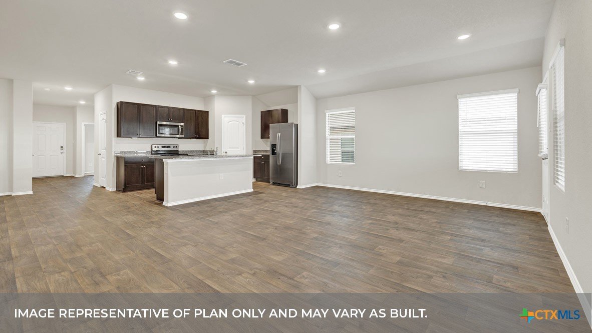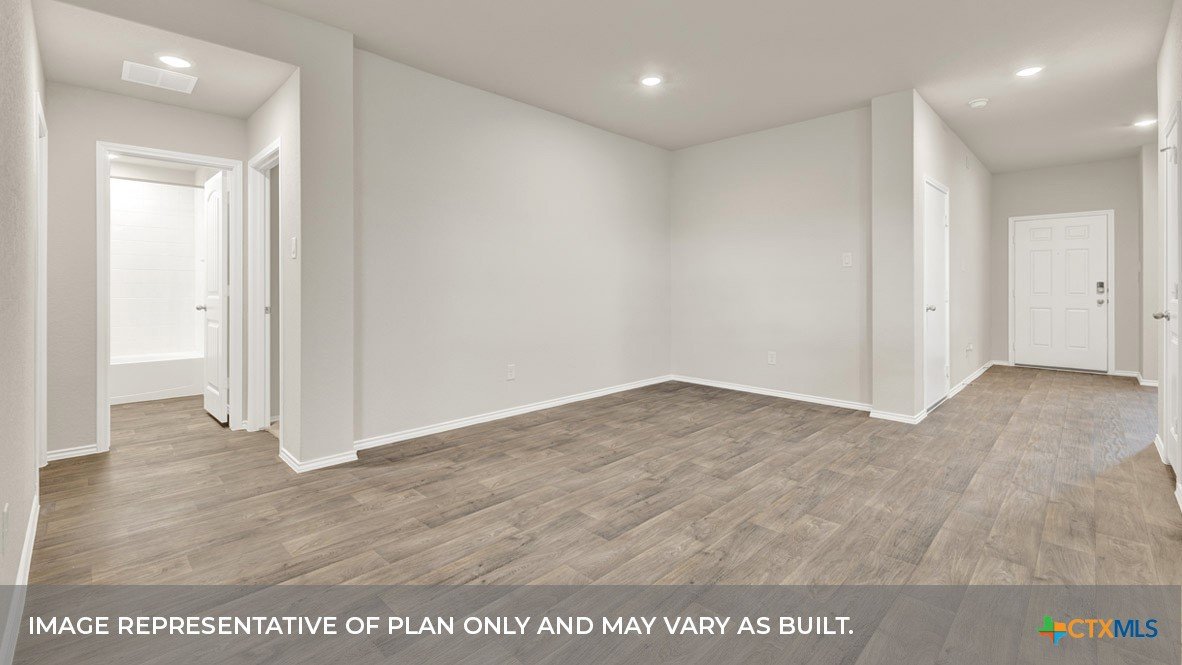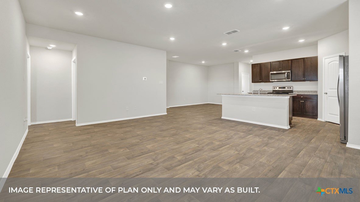 MAY ESTIMATED COMPETION DATE. The Lakeway is our most popular floorplan and is available at Arroyo Ranch in Seguin, Texas. This one-story home offers 2,034 square feet of living space across 4 bedrooms, 3 bathrooms, a study, and 2-car garage. As you enter the home from the covered front porch, you’ll step into the spacious foyer and will find the open study, bathroom 2 and bedroom 2. Use the study as a home office, library, or extra play area for the kids. Stepping further into the home, you’ll discover the dining room, kitchen and family room laid out in an open concept design. Built to make cooking, eating, and entertaining a pleasant experience for family and friends, you’re sure to make many memories in this beautiful space. The kitchen includes granite countertops, a large island facing the family room, a walk-in pantry, stainless-steel appliances and 36’’ upper cabinets. Located privately off the dining room are bedrooms 3 and 4, as well as bathroom 3. The primary bedroom is at the back of the house, off the family room, and includes a private bathroom. This relaxing bathroom space features a 5’ walk in shower, double sink vanity, private toilet area with a door, and a walk-in closet. The utility room is outside the primary bedroom, allowing for the laundry chores to be completed with ease. The Lakeway includes vinyl flooring throughout the common areas of the home, and carpet in the bedrooms. All our new homes feature a covered back patio, full sod, irrigation system in the front and back yard, and a 6’ privacy fence around the back yard. This home includes our America’s Smart Home base package, which includes the Amazon Echo Pop, Front Doorbell, Front Door Deadbolt Lock, Home Hub, Thermostat, and Deako® Smart Switches.