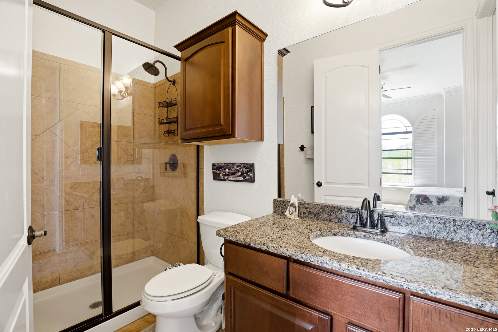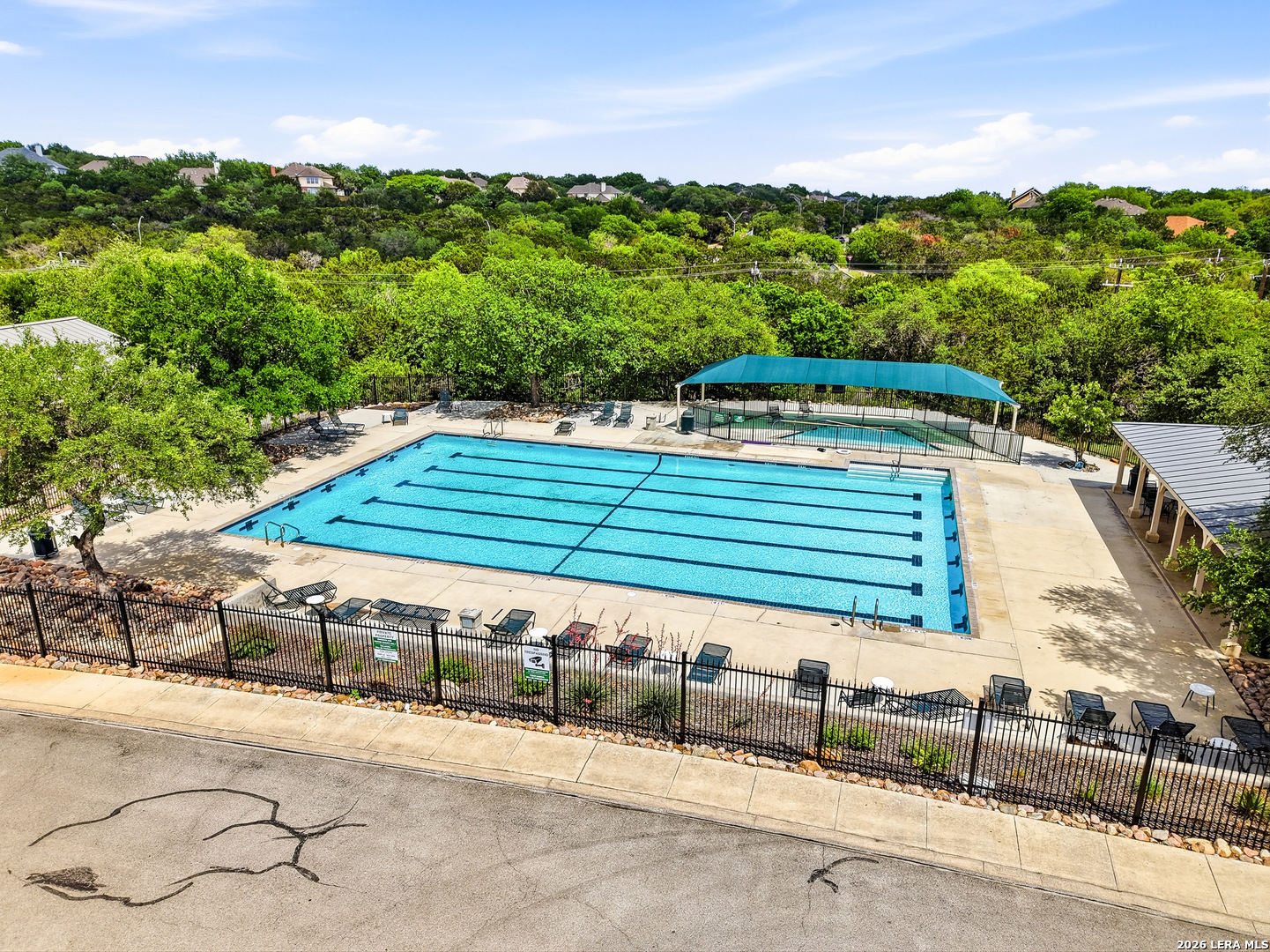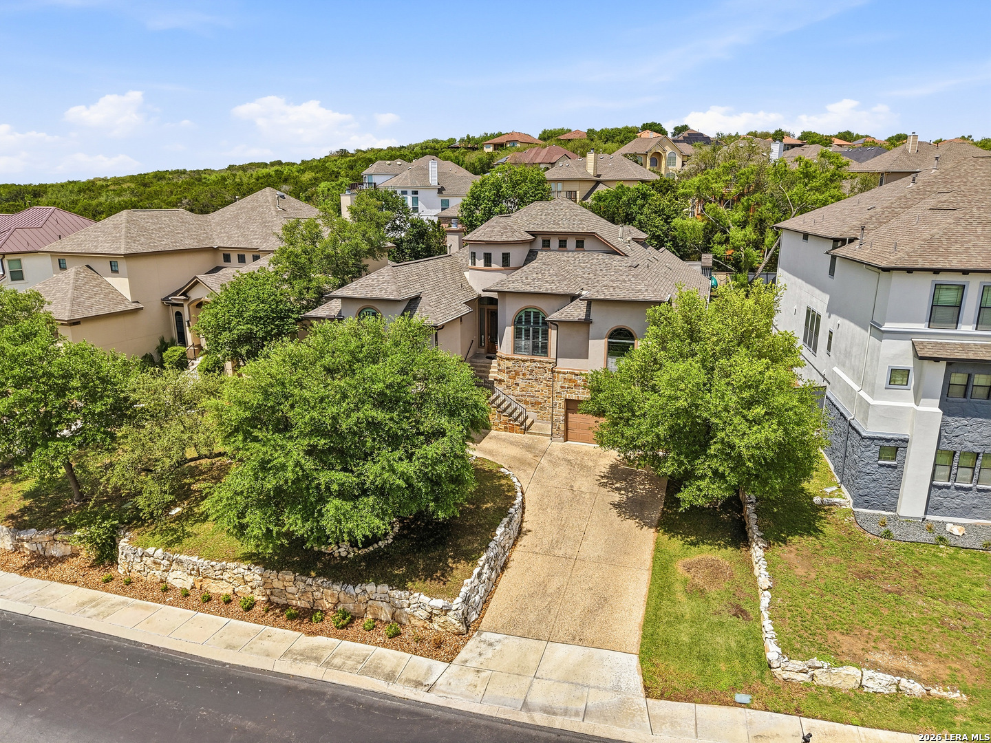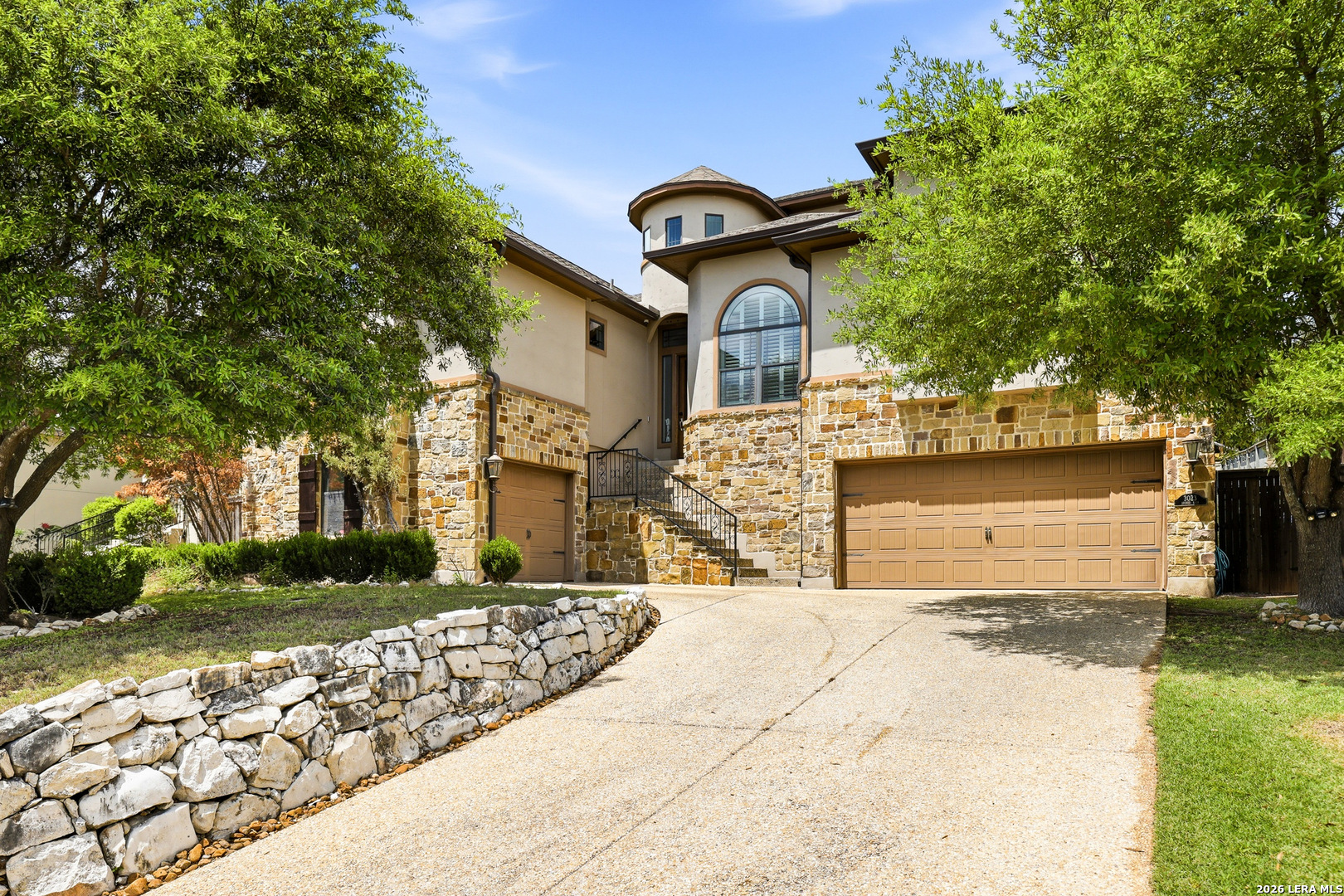 Welcome to 3023 Spider Lily in the gated Point Bluff at Rogers Ranch community. This 4-bedroom, 4.5-bath home offers over 4,000 sqft of well-designed living space with two living areas, a dedicated study, and a home theater. Stone and stucco exterior with wrought-iron detail. Inside, soaring ceilings and a stone corner fireplace anchor the main living area with expansive views of the private backyard. Updated kitchen with center island, prep sink, and granite counters. The main-level guest suite includes its own kitchenette, ideal for multi-generational living or visiting family. A 2-car garage connects directly to the hallway with direct access to the guest suite, plus an additional 1-car garage. Primary suite with separate vanities and walk-in closets, soaking tub, and walk-through shower. Upstairs features a spacious living area and media room with half bath. Gated community with pool, tennis courts, basketball court, kids playground, and newly added trail connections linking Point Bluff to the greater San Antonio trail network. Minutes from La Cantera, The Rim, and top-rated schools.