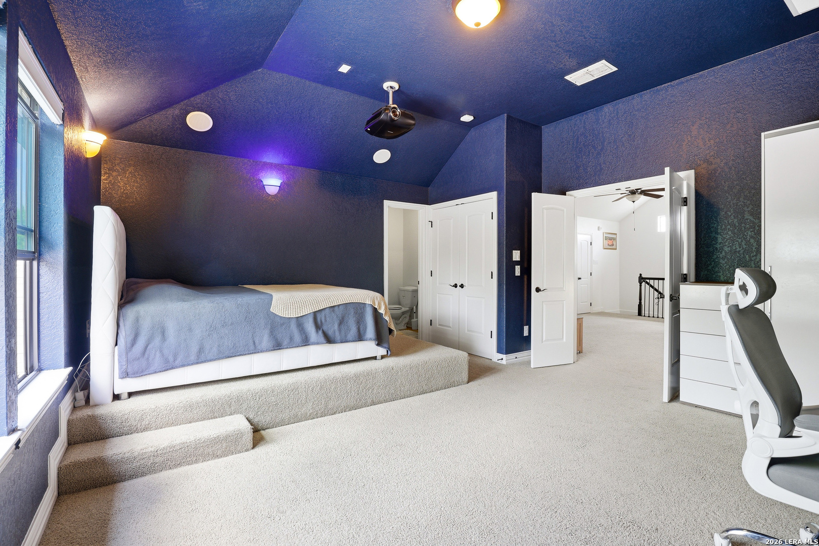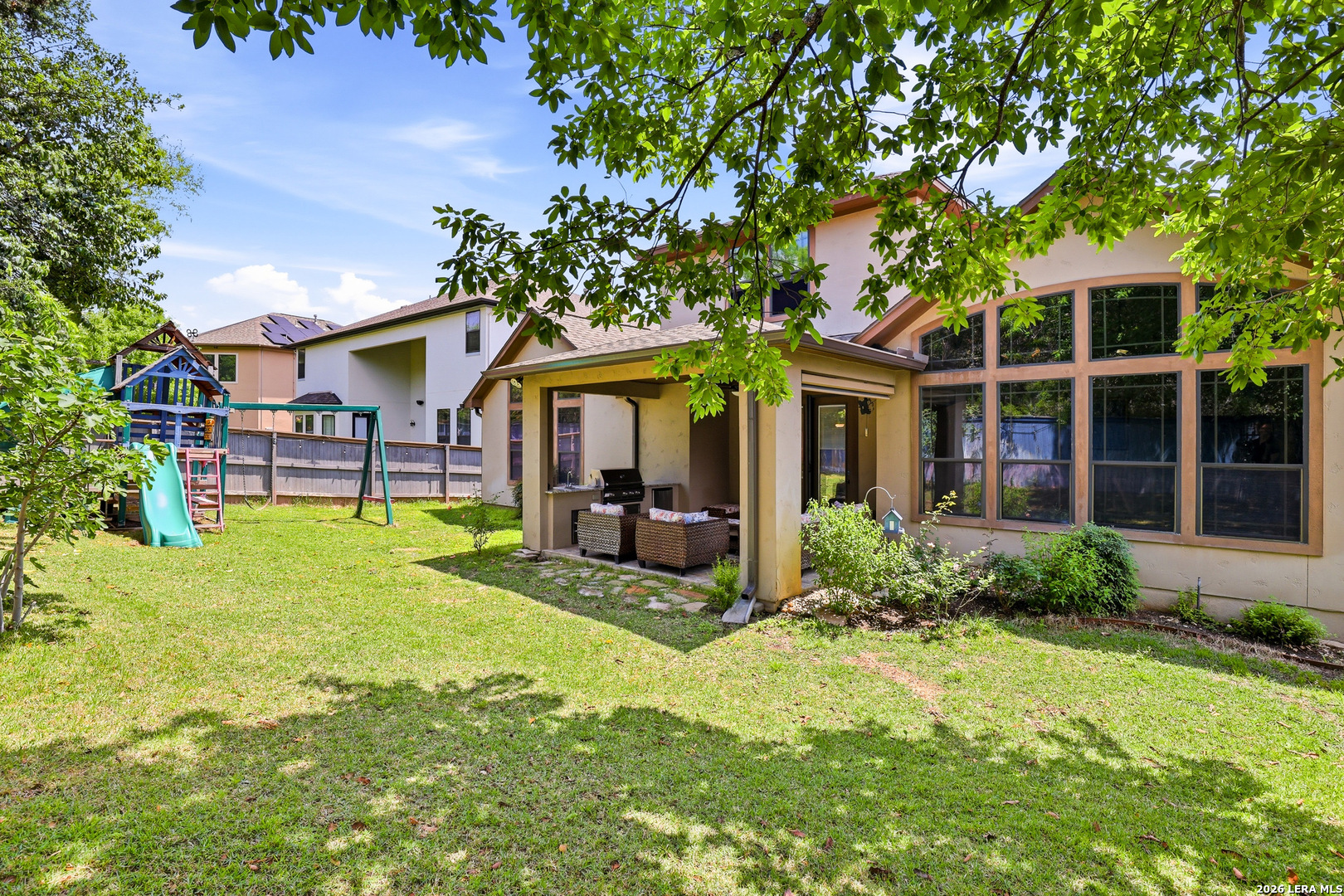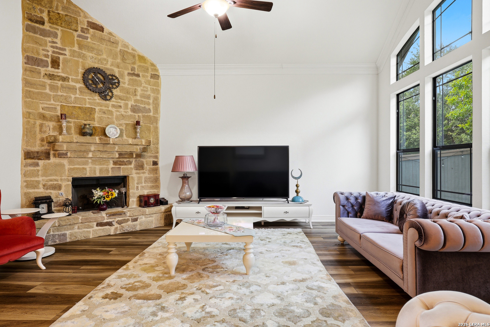 Welcome to 3023 Spider Lily in the gated Point Bluff at Rogers Ranch community. This 4-bedroom, 4.5-bath home offers over 4,000 sqft of well-designed living space with two living areas, a dedicated study, and a home theater. Stone and stucco exterior with wrought-iron detail. Inside, soaring ceilings and a stone corner fireplace anchor the main living area with expansive views of the private backyard. Updated kitchen with center island, prep sink, and granite counters. The main-level guest suite includes its own kitchenette, ideal for multi-generational living or visiting family. A 2-car garage connects directly to the hallway with direct access to the guest suite, plus an additional 1-car garage. Primary suite with separate vanities and walk-in closets, soaking tub, and walk-through shower. Upstairs features a spacious living area and media room with half bath. Gated community with pool, tennis courts, basketball court, kids playground, and newly added trail connections linking Point Bluff to the greater San Antonio trail network. Minutes from La Cantera, The Rim, and top-rated schools.