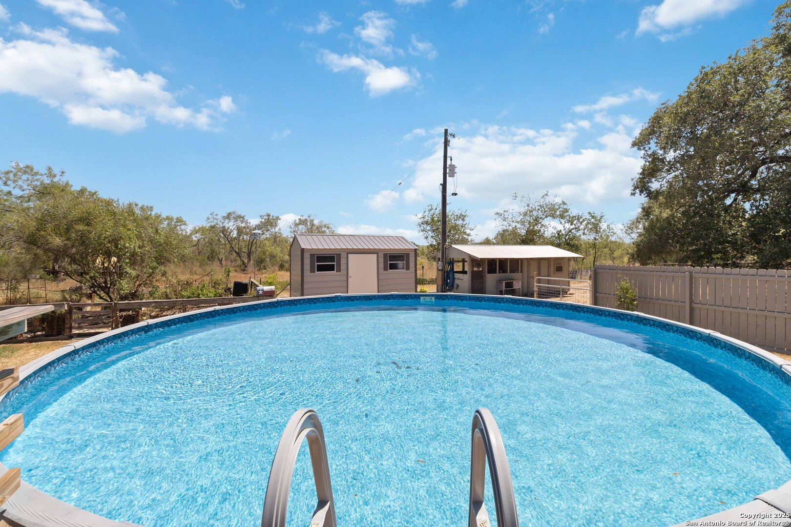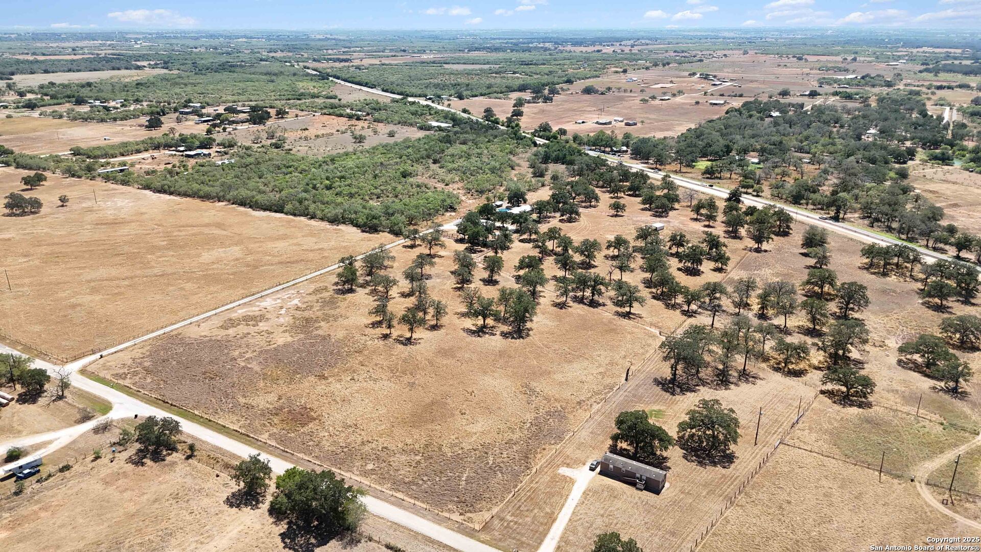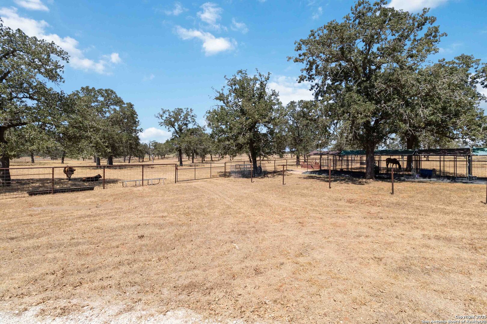 Less than an hour from downtown San Antonio, this 18-acre ranchette in the charming town of Stockdale offers the perfect blend of Hill Country living and wide-open space. Fully fenced and gated, the property is thoughtfully designed for a true country lifestyle, complete with multiple corrals, cow pens, dog runs, a chicken coop, and a horse barn. Additional improvements include a three-sided covered four-car carport with storage, plus multiple sheds for equipment and supplies. As you make your way down the quarter-mile private drive, you'll be greeted by land that has been carefully cleared while preserving hundreds of majestic oak trees, creating a picturesque backdrop for this peaceful retreat. At nearly 2,200 square feet, the residence was designed for comfortable living with an open-concept layout, four bedrooms, and two full baths. The living room, anchored by a cozy wood-burning fireplace, opens seamlessly to the kitchen and dining areas. A formal dining room offers space for gatherings, while the breakfast nook provides a warm spot for everyday meals. The chef's kitchen is truly the heart of the home, featuring a beautiful wood-topped island, 42" cabinetry, and a complete appliance package including the refrigerator. The split primary suite is a private retreat with a spa-inspired bath offering a soaking tub and step-in shower. Three additional bedrooms and a full bath on the opposite side of the home provide comfort for family and guests. Outdoors, a fenced backyard invites relaxation under the Texas skies, complete with an above-ground pool perfect for summer nights of star-gazing. Whether you're expanding your ranching lifestyle, downsizing for a simpler pace, or seeking your very first Hill Country ranchette, this 18-acre estate in Stockdale has it all-space, functionality, and timeless Hill Country beauty.