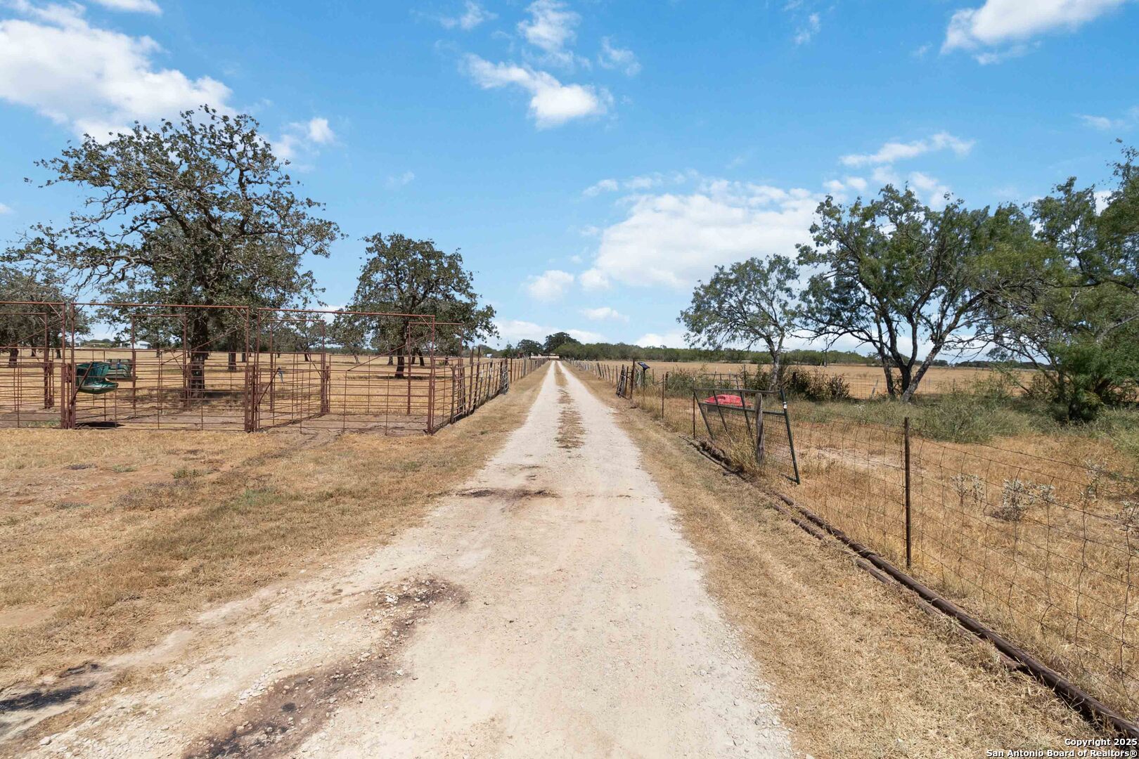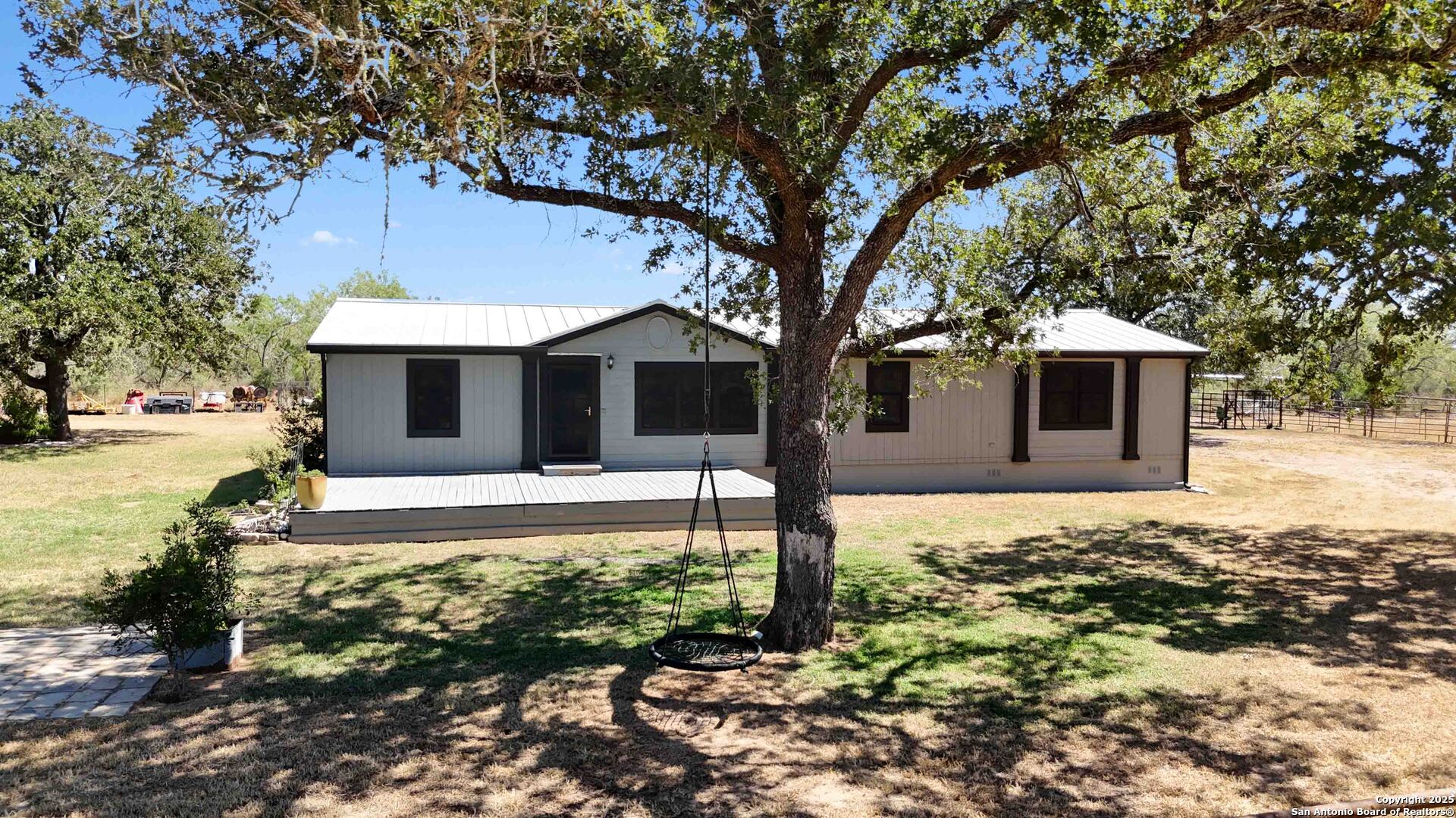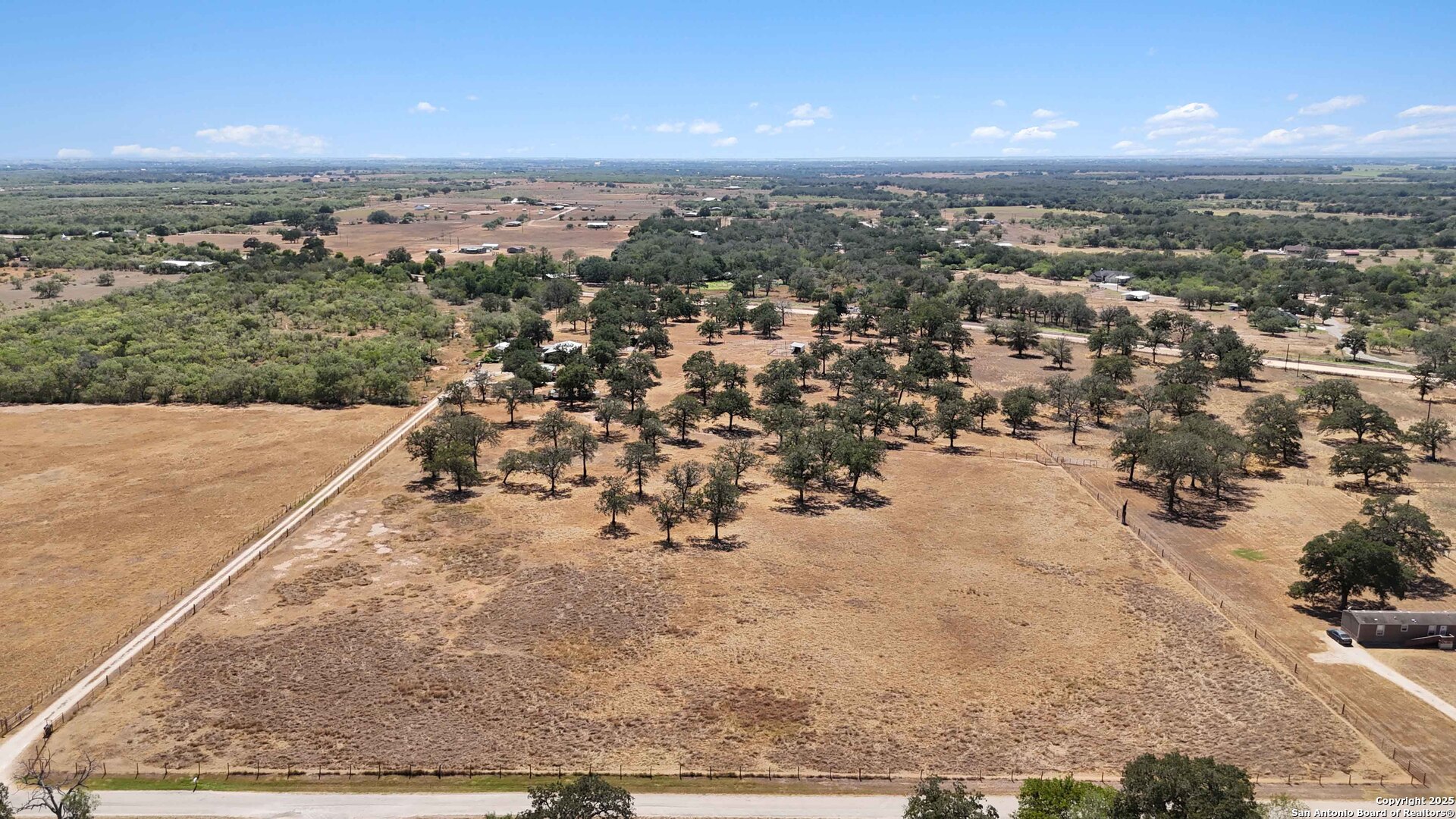 Less than an hour from downtown San Antonio, this 18-acre ranchette in the charming town of Stockdale offers the perfect blend of Hill Country living and wide-open space. Fully fenced and gated, the property is thoughtfully designed for a true country lifestyle, complete with multiple corrals, cow pens, dog runs, a chicken coop, and a horse barn. Additional improvements include a three-sided covered four-car carport with storage, plus multiple sheds for equipment and supplies. As you make your way down the quarter-mile private drive, you'll be greeted by land that has been carefully cleared while preserving hundreds of majestic oak trees, creating a picturesque backdrop for this peaceful retreat. At nearly 2,200 square feet, the residence was designed for comfortable living with an open-concept layout, four bedrooms, and two full baths. The living room, anchored by a cozy wood-burning fireplace, opens seamlessly to the kitchen and dining areas. A formal dining room offers space for gatherings, while the breakfast nook provides a warm spot for everyday meals. The chef's kitchen is truly the heart of the home, featuring a beautiful wood-topped island, 42" cabinetry, and a complete appliance package including the refrigerator. The split primary suite is a private retreat with a spa-inspired bath offering a soaking tub and step-in shower. Three additional bedrooms and a full bath on the opposite side of the home provide comfort for family and guests. Outdoors, a fenced backyard invites relaxation under the Texas skies, complete with an above-ground pool perfect for summer nights of star-gazing. Whether you're expanding your ranching lifestyle, downsizing for a simpler pace, or seeking your very first Hill Country ranchette, this 18-acre estate in Stockdale has it all-space, functionality, and timeless Hill Country beauty.