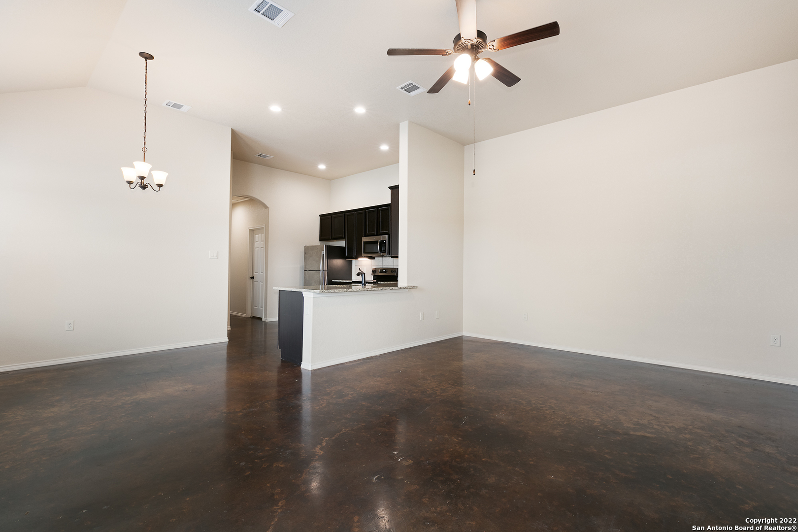 Available for immediate move in! 3 bedroom 2 bath luxury duplex with stained concrete flooring and high ceilings throughout the entire home. Open contemporary floorplan offers fully equipped kitchen with granite counter tops, stainless steel appliance package including fridge, microwave and under cabinet lighting with a separate pantry. Living, dining and kitchen feel extra spacious with vaulted ceilings. Utility room inside offers full size washer and dryer connections. Primary bedroom offers decorative tray ceilings with ceiling fan, walk in closet and private bath with walk-in shower. Private covered patio off primary bedroom.