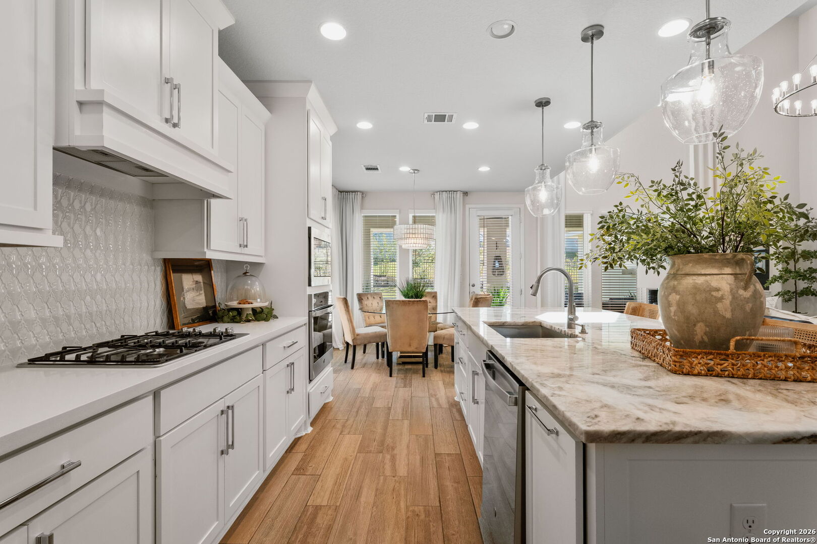 Experience elevated living in the sought-after Esperanza community, ideally located within acclaimed Boerne ISD. This two-story, 4-bedroom, 3-bath home offers 2,797 sq ft of thoughtfully curated space with true model-home quality throughout. Soaring ceilings, designer light fixtures, and abundant natural light highlight the open layout, which includes multiple living areas, a private study, and an impressive grand loft-perfect for everyday living or entertaining. The chef-inspired kitchen features gas cooking, built-in appliances, and modern finishes accented by bold black doors and statement walls. Outdoor living is just as inviting with a covered patio enhanced by custom design details. Residents enjoy resort-style amenities including a lazy river, splash pad, expansive pool, and an exceptional dog park, all with convenient access to shopping and dining. This home delivers the perfect blend of luxury, lifestyle, and location in one of Boerne's most desirable communities.