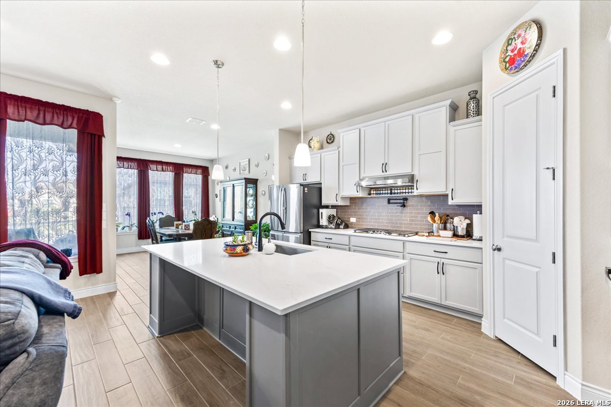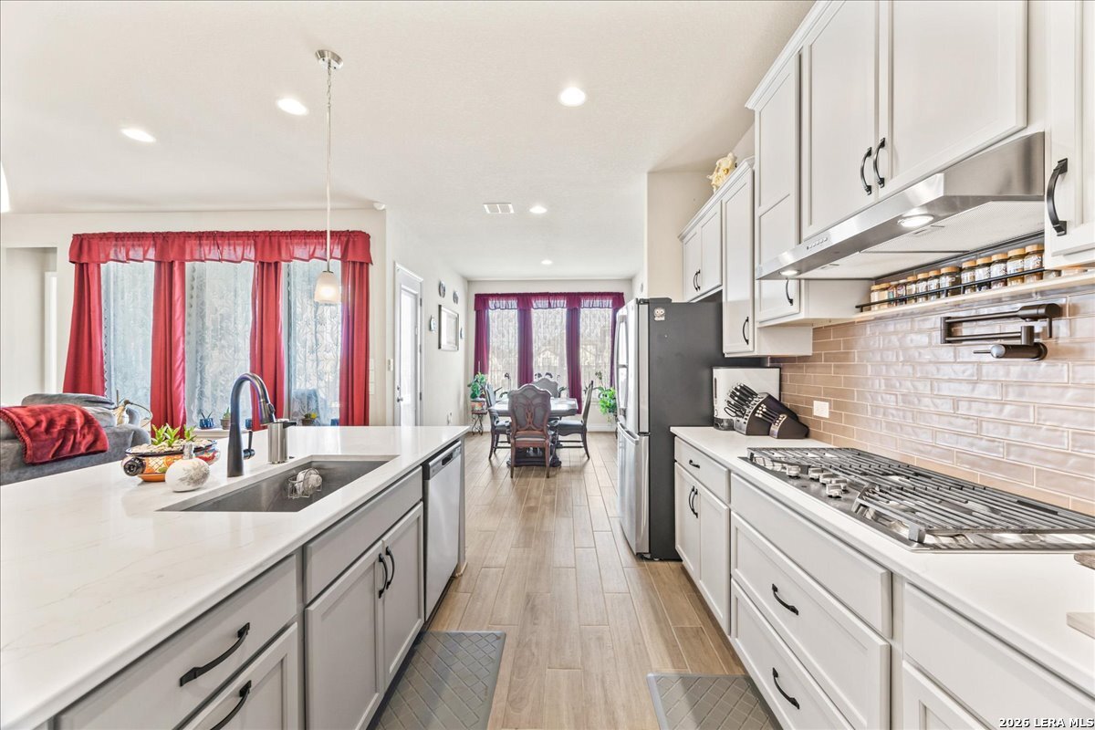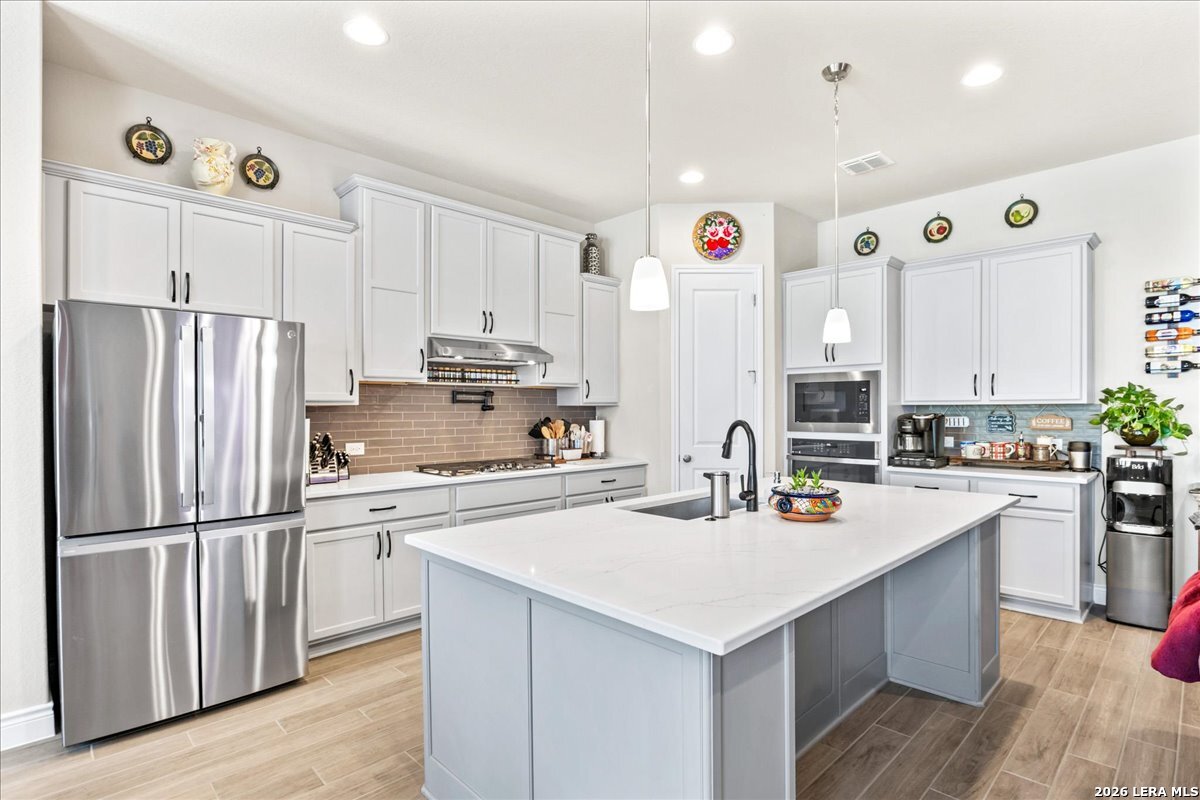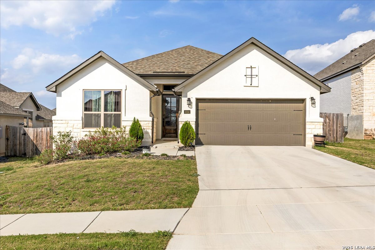 Hill Country luxury just landed and it's everything you've been waiting for. Built in 2024 by Monticello Homes, this stunning ranch-style residence in the sought-after Ventana community blends modern sophistication with the effortless charm of Texas Hill Country living. The open-concept layout flows seamlessly from a gourmet kitchen anchored by an oversized island and elevated finishes to sun-drenched living spaces crowned with soaring ceilings and designer touches throughout. The private primary suite is a true retreat, offering a spa-inspired bath with double vanity and deep soaking tub. Flexible spaces include a dedicated home office and generous game room, while the massive covered patio was designed to capture Hill Country breezes and scenic views year-round. A 3-car tandem garage rounds out the function. Beyond your front door, resort-style pools, nature trails, and a community park await. Zoned to top-rated Comal ISD with convenient access to premier shopping and dining, this move-in-ready gem is the rare combination of contemporary luxury and natural beauty. Your Texas Hill Country retreat is ready. Schedule your private tour today.