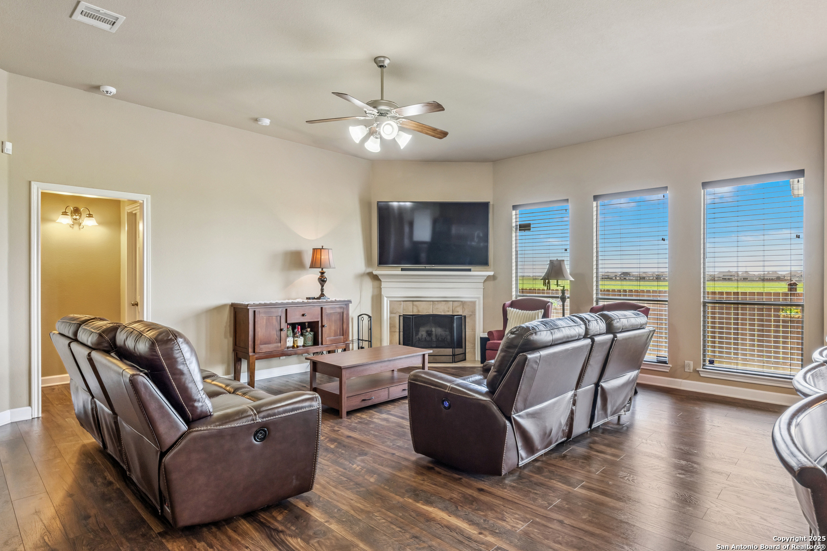 Welcome to your dream home, perfectly located just minutes from New Braunfels and Lake McQueeney, and zoned to the desirable Navarro ISD. This stunning one-story home offers an incredibly spacious layout with 5 bedrooms and 3 full bathrooms, all thoughtfully designed for comfort and functionality. From the moment you arrive, you'll be greeted by beautiful curb appeal, a three-car garage, and mature trees that add charm and shade. Step inside to find high ceilings and a bright, open floor plan that immediately feels like home. To your right, a flexible office or loft space offers the ideal spot for working from home or relaxing. The formal dining room features elegant ceilings and new luxury vinyl flooring, seamlessly flowing into the large living room filled with natural light and anchored by a cozy wood-burning fireplace. The adjacent kitchen is both stylish and practical, with granite countertops, plenty of cabinet space, and a breakfast nook for casual meals. The primary suite is tucked away for privacy, featuring tall ceilings, a spacious layout, and an ensuite bathroom with a soaking tub, walk-in shower, and walk-in closet. A secondary bedroom with its own private full bath offers a perfect guest suite or second primary option. Down the hall, you'll find three additional generously sized bedrooms and a third full bathroom. Step outside to a peaceful backyard with no rear neighbors and open country views, an ideal backdrop for relaxing evenings. The extended covered patio is perfect for outdoor dining, entertaining, or simply enjoying the sunset. Additional updates include a new AC unit and water heater in 2019, along with a pest control warranty for added peace of mind. With quick access to major highways, Lake McQueeney, and all that the New Braunfels & Seguin area has to offer, this home truly has it all.