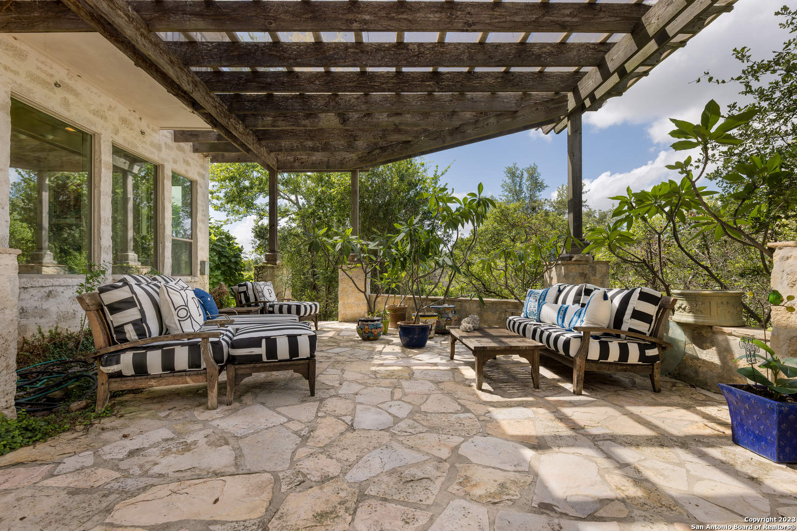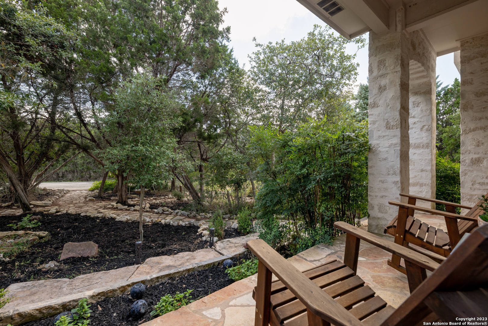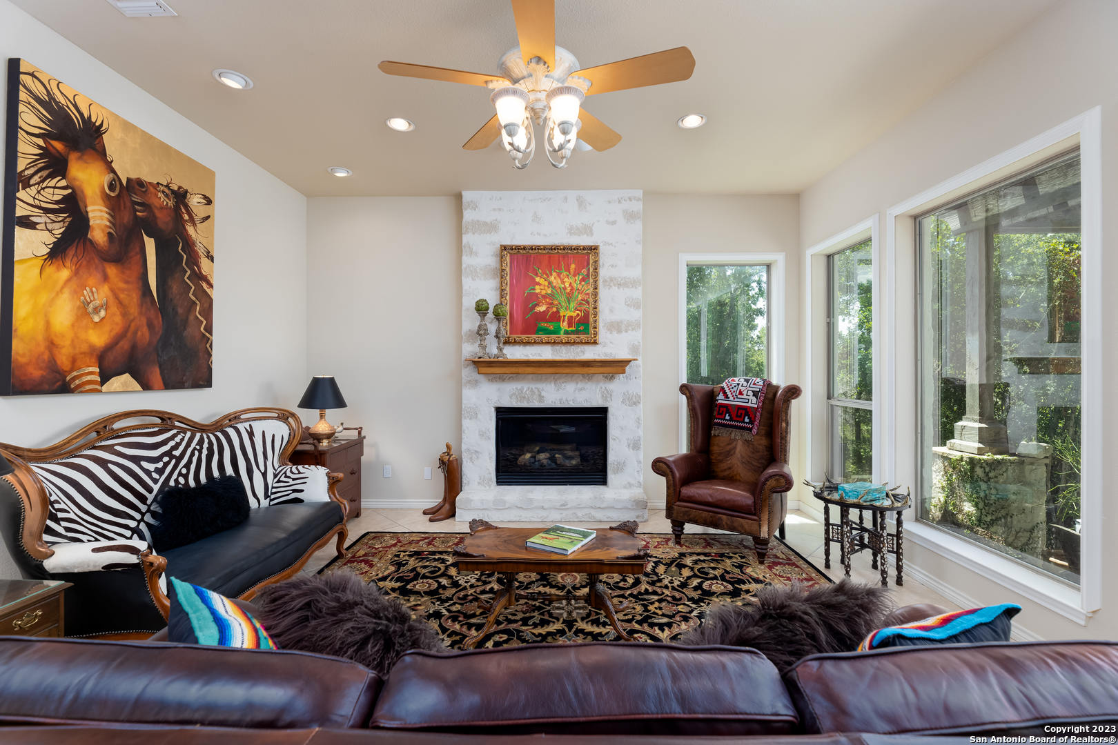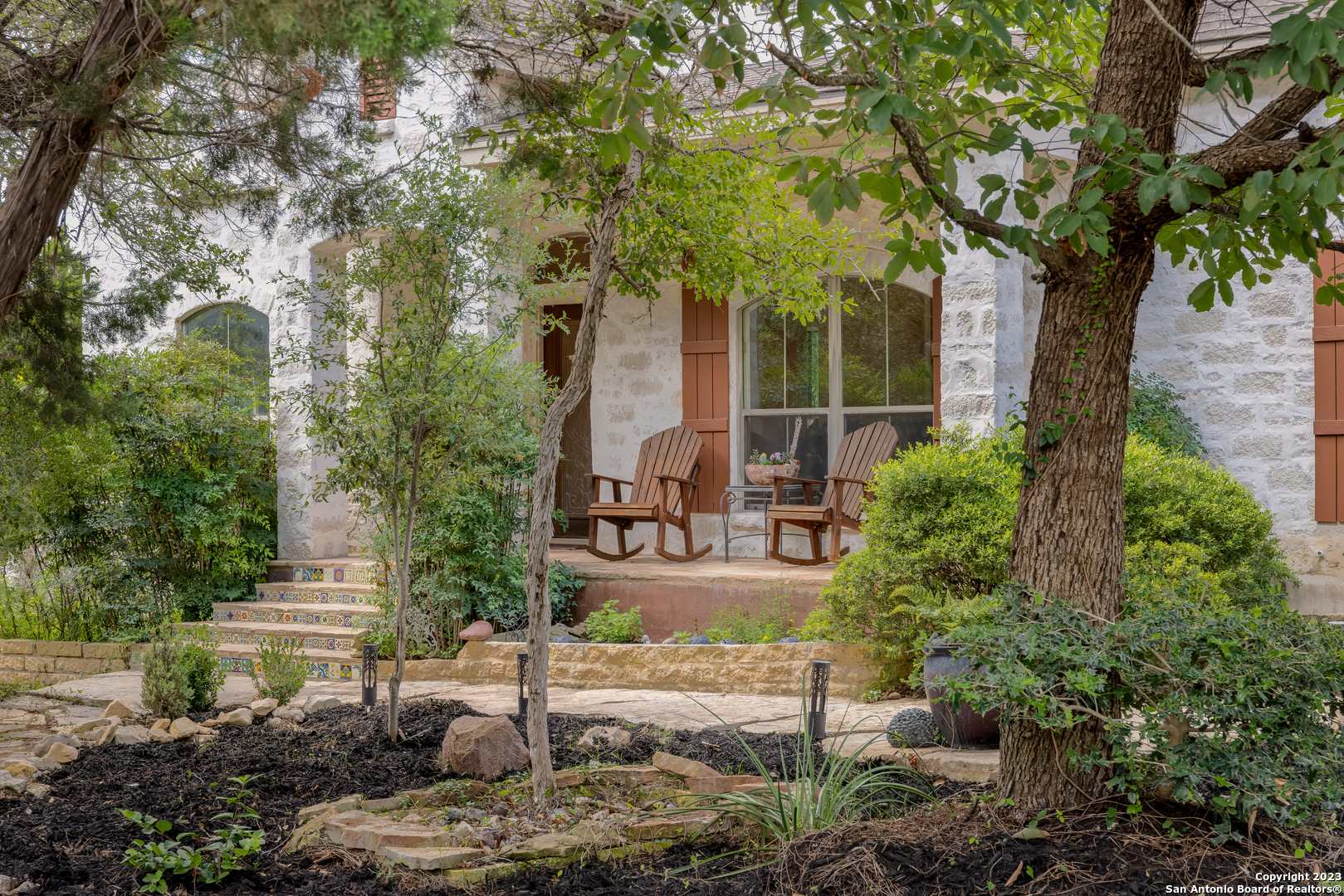 Recently measured 3141 SF. Sought after location in Cordillera Ranch community! Incredible private oasis with 3/3 and just over 8+ acres and spectacular back porches and patios with fireplace and tranquil setting. This Beautiful home with tons of wonderful features including long range private views, great backyard with wonderful large patio and sitting areas. Beautiful neighborhood for families or retirees and resort like setting throughout entire community. Upon entrance into the home, you will step onto beautiful large living space and breathtaking windows from the living room that showcase wonderful porch for hours of relaxing time. The living room with its open floor plan, lovely breakfast area and plenty of space for your dining room set in the spacious dining room. Look out over beautiful private views to patio space and mature landscaping and trees. Considered a 3 bedroom with an office up as well as spacious media/family room! Great for entertaining guests and hosting gatherings. The kitchen boasts spacious cabinetry along with pantry space and a lovely large window for natural light. Don't miss tile and carpet flooring in the entry, dining, kitchen, breakfast, and hall. The bedrooms are carpeted. Step into your Primary Suite space. It's exceptionally appointed with exit to back patio large sitting area to enjoy views. A wonderful garden tub, walk-in shower and double sinks complete the primary bath suite. The secondary bedrooms are lovely with lots of nature light and nice closet and storage space. The faux wood blinds throughout the home are yet another added feature. The entire home boasts cozy warm feeling including beautiful open floor plan, transitional outdoor space with lush mature landscaping. This backyard will not disappoint! Relax in your private yard with plenty of shade, an outdoor fireplace and covered patio. Wonderful privacy! This beautiful home offers a wonderful sanctuary for relaxation.