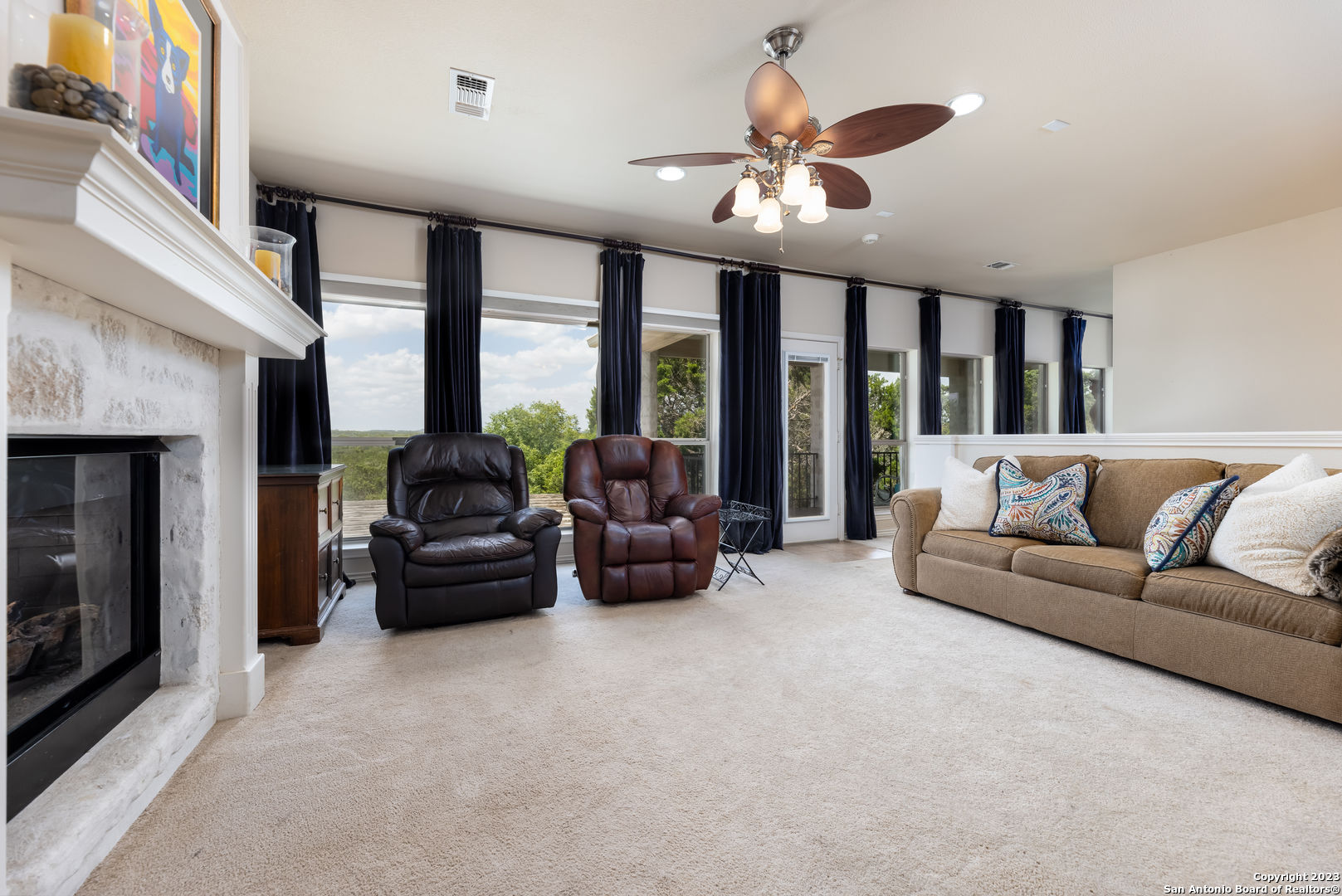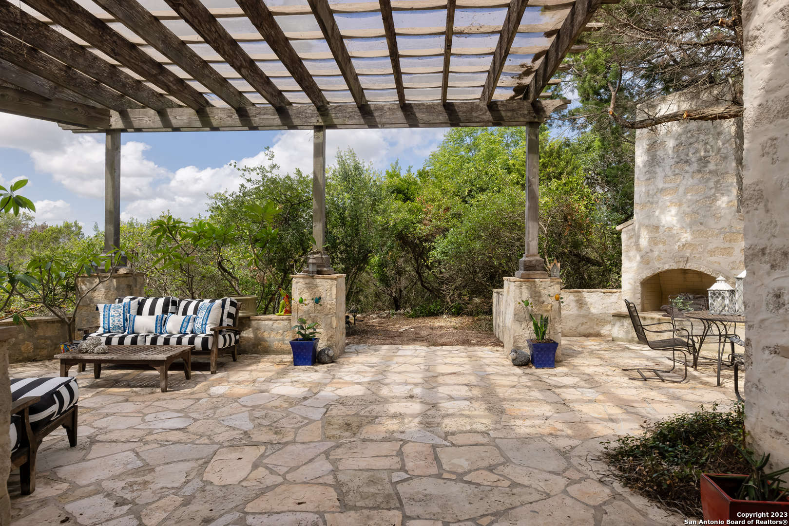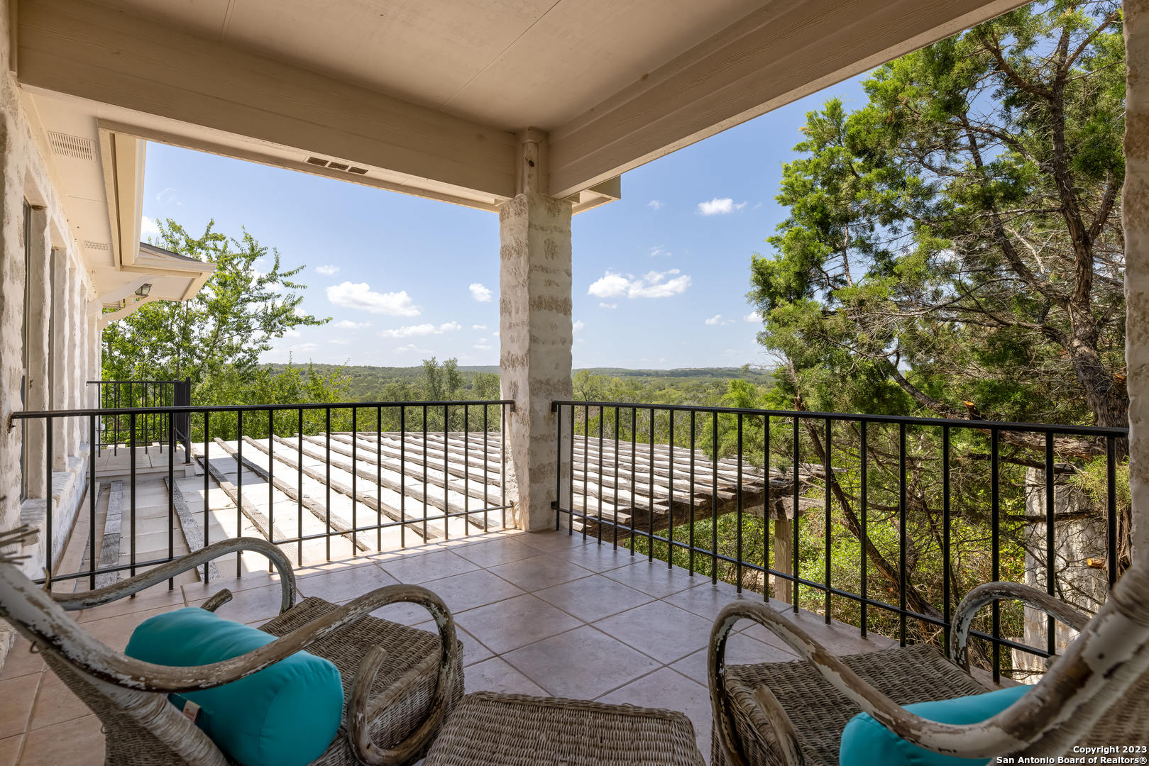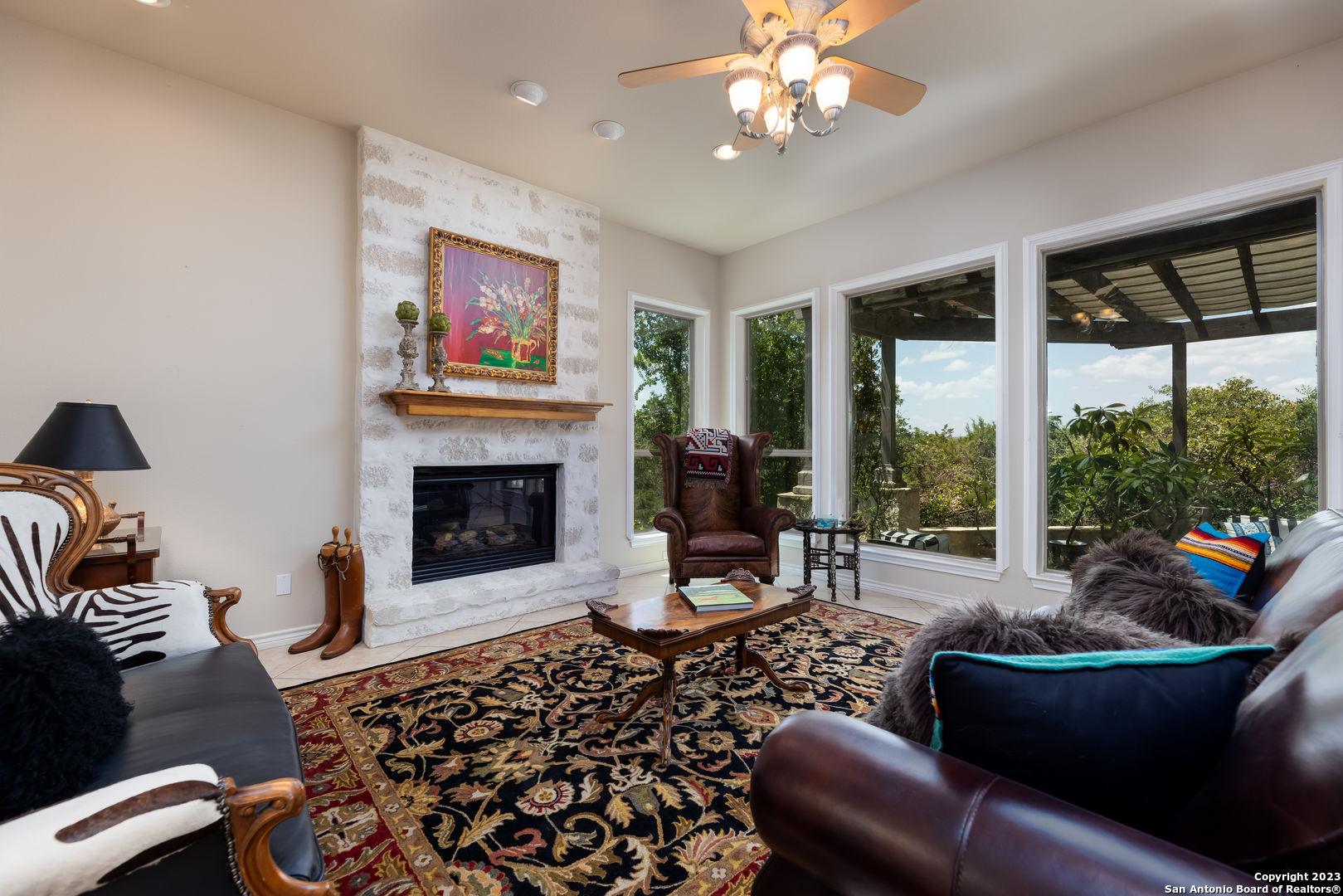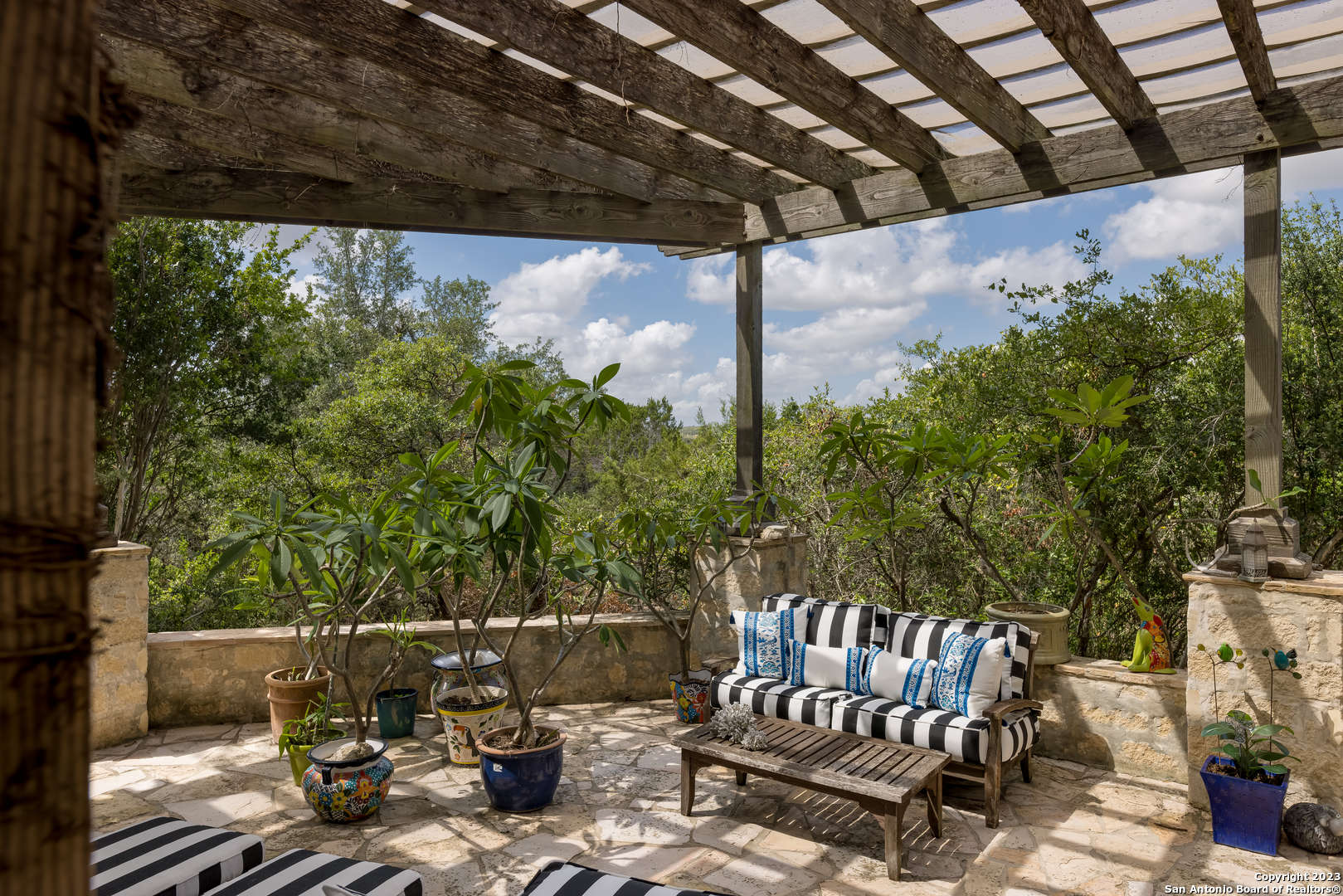 Recently measured 3141 SF. Sought after location in Cordillera Ranch community! Incredible private oasis with 3/3 and just over 8+ acres and spectacular back porches and patios with fireplace and tranquil setting. This Beautiful home with tons of wonderful features including long range private views, great backyard with wonderful large patio and sitting areas. Beautiful neighborhood for families or retirees and resort like setting throughout entire community. Upon entrance into the home, you will step onto beautiful large living space and breathtaking windows from the living room that showcase wonderful porch for hours of relaxing time. The living room with its open floor plan, lovely breakfast area and plenty of space for your dining room set in the spacious dining room. Look out over beautiful private views to patio space and mature landscaping and trees. Considered a 3 bedroom with an office up as well as spacious media/family room! Great for entertaining guests and hosting gatherings. The kitchen boasts spacious cabinetry along with pantry space and a lovely large window for natural light. Don't miss tile and carpet flooring in the entry, dining, kitchen, breakfast, and hall. The bedrooms are carpeted. Step into your Primary Suite space. It's exceptionally appointed with exit to back patio large sitting area to enjoy views. A wonderful garden tub, walk-in shower and double sinks complete the primary bath suite. The secondary bedrooms are lovely with lots of nature light and nice closet and storage space. The faux wood blinds throughout the home are yet another added feature. The entire home boasts cozy warm feeling including beautiful open floor plan, transitional outdoor space with lush mature landscaping. This backyard will not disappoint! Relax in your private yard with plenty of shade, an outdoor fireplace and covered patio. Wonderful privacy! This beautiful home offers a wonderful sanctuary for relaxation.