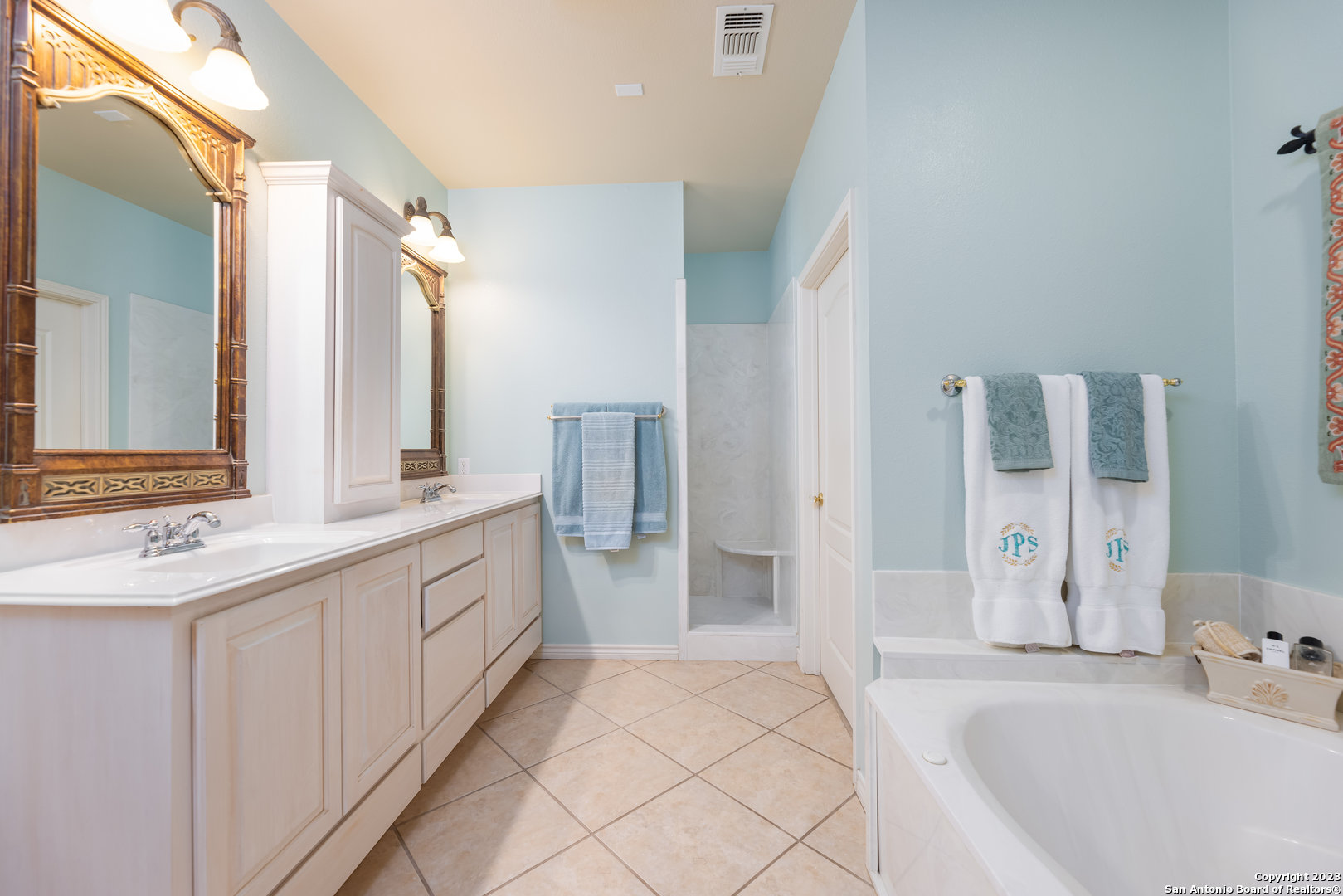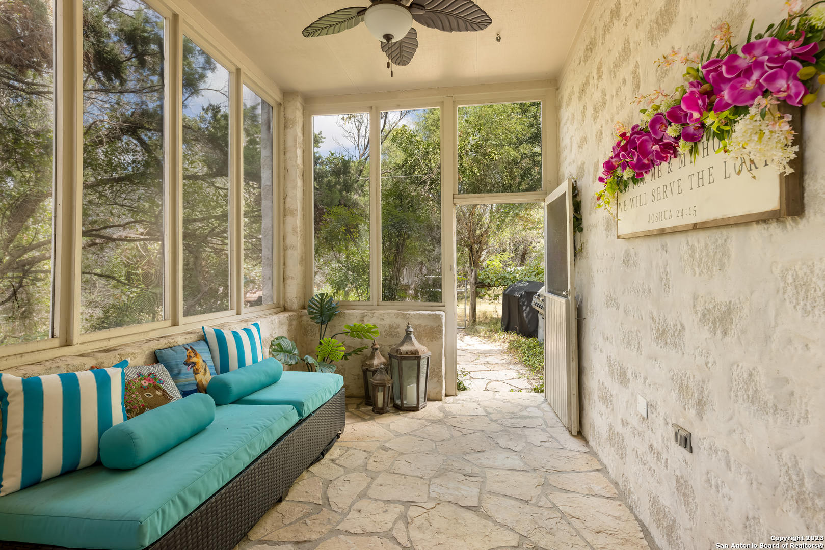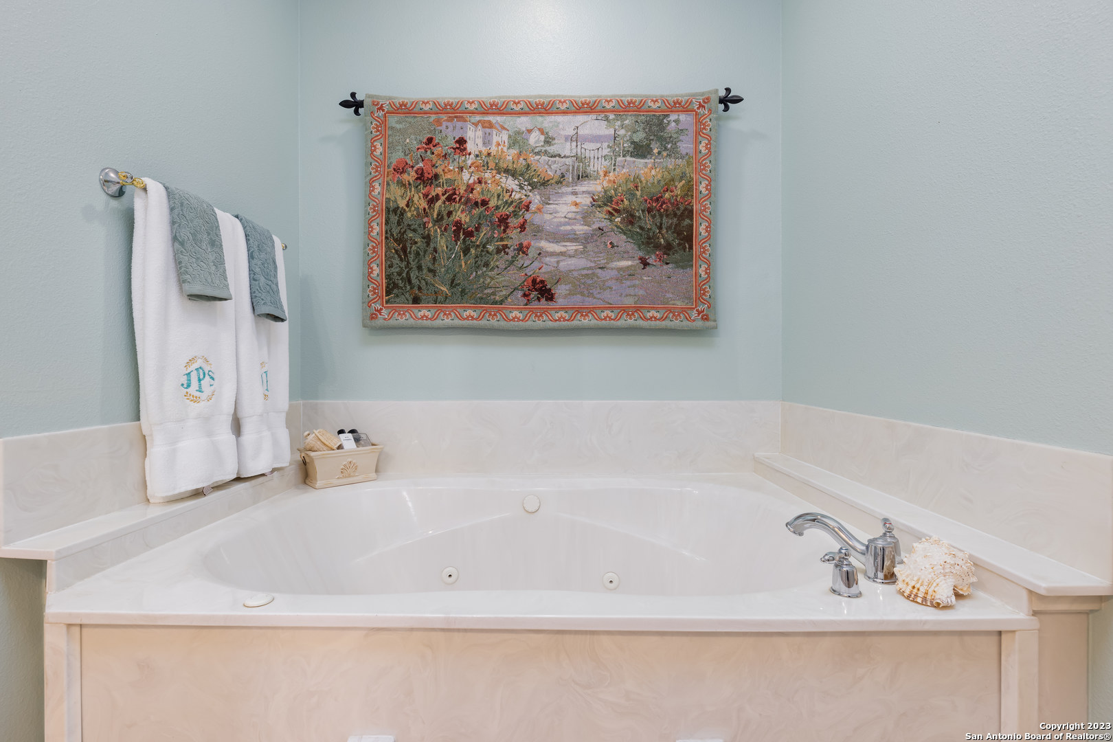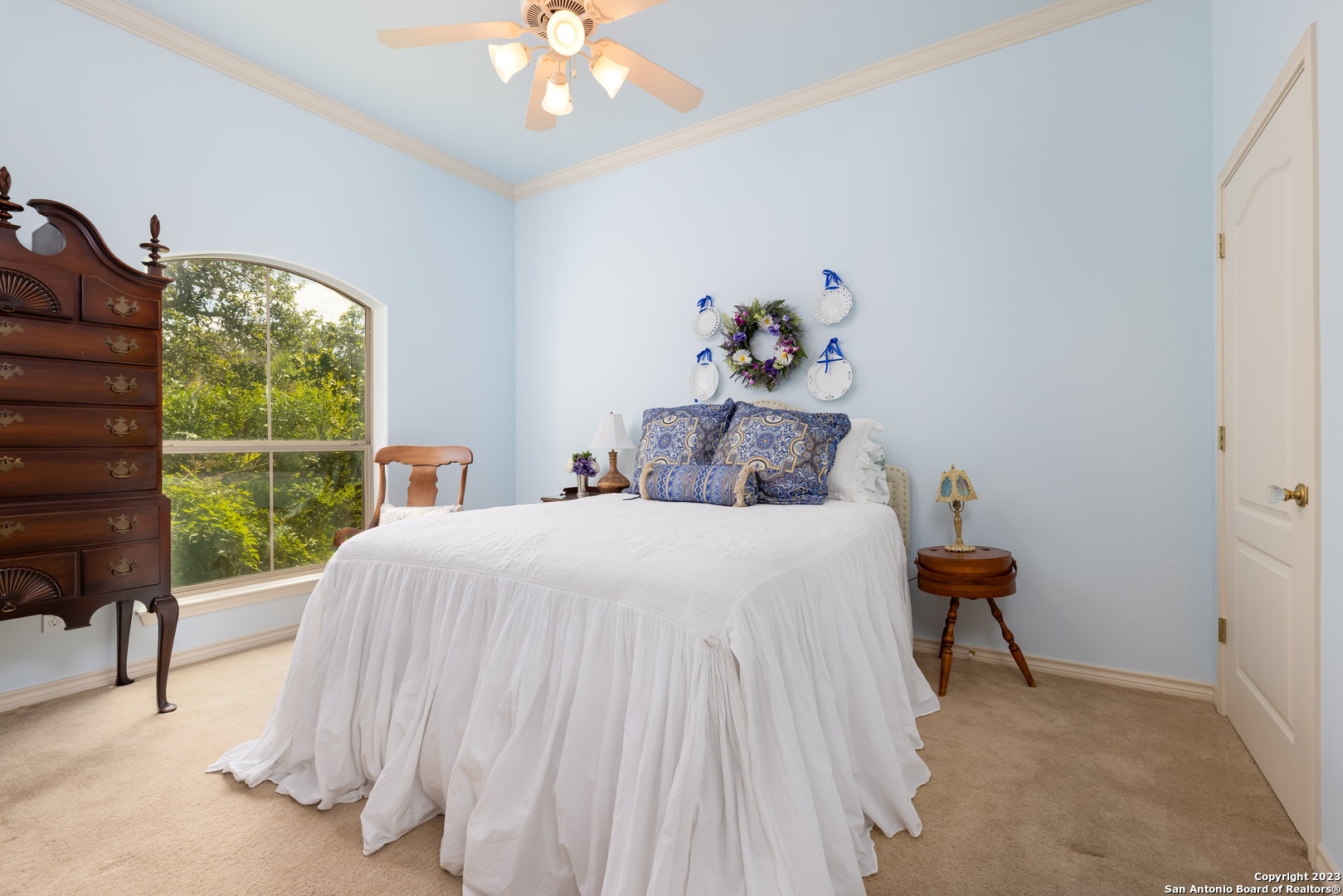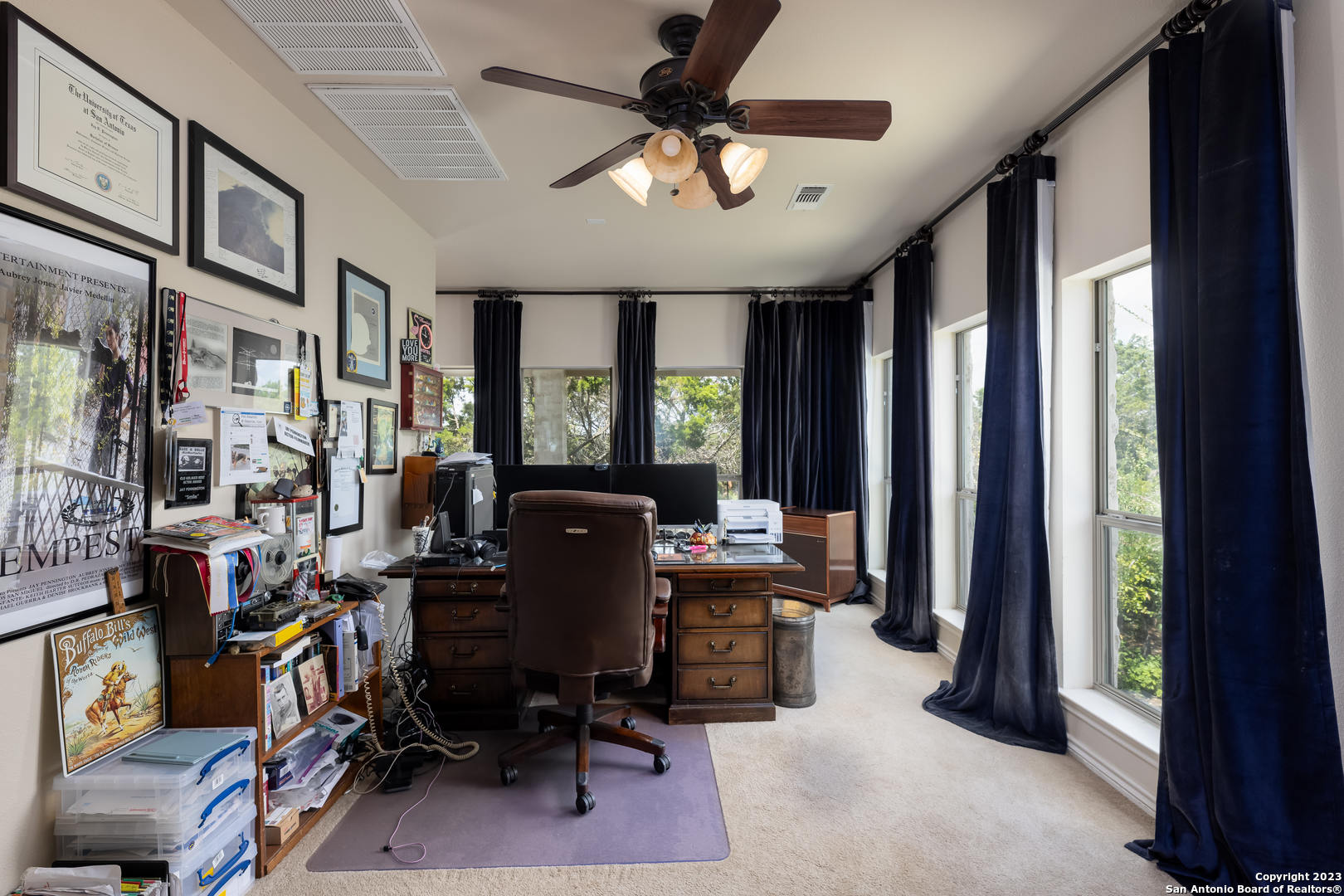 Recently measured 3141 SF. Sought after location in Cordillera Ranch community! Incredible private oasis with 3/3 and just over 8+ acres and spectacular back porches and patios with fireplace and tranquil setting. This Beautiful home with tons of wonderful features including long range private views, great backyard with wonderful large patio and sitting areas. Beautiful neighborhood for families or retirees and resort like setting throughout entire community. Upon entrance into the home, you will step onto beautiful large living space and breathtaking windows from the living room that showcase wonderful porch for hours of relaxing time. The living room with its open floor plan, lovely breakfast area and plenty of space for your dining room set in the spacious dining room. Look out over beautiful private views to patio space and mature landscaping and trees. Considered a 3 bedroom with an office up as well as spacious media/family room! Great for entertaining guests and hosting gatherings. The kitchen boasts spacious cabinetry along with pantry space and a lovely large window for natural light. Don't miss tile and carpet flooring in the entry, dining, kitchen, breakfast, and hall. The bedrooms are carpeted. Step into your Primary Suite space. It's exceptionally appointed with exit to back patio large sitting area to enjoy views. A wonderful garden tub, walk-in shower and double sinks complete the primary bath suite. The secondary bedrooms are lovely with lots of nature light and nice closet and storage space. The faux wood blinds throughout the home are yet another added feature. The entire home boasts cozy warm feeling including beautiful open floor plan, transitional outdoor space with lush mature landscaping. This backyard will not disappoint! Relax in your private yard with plenty of shade, an outdoor fireplace and covered patio. Wonderful privacy! This beautiful home offers a wonderful sanctuary for relaxation.