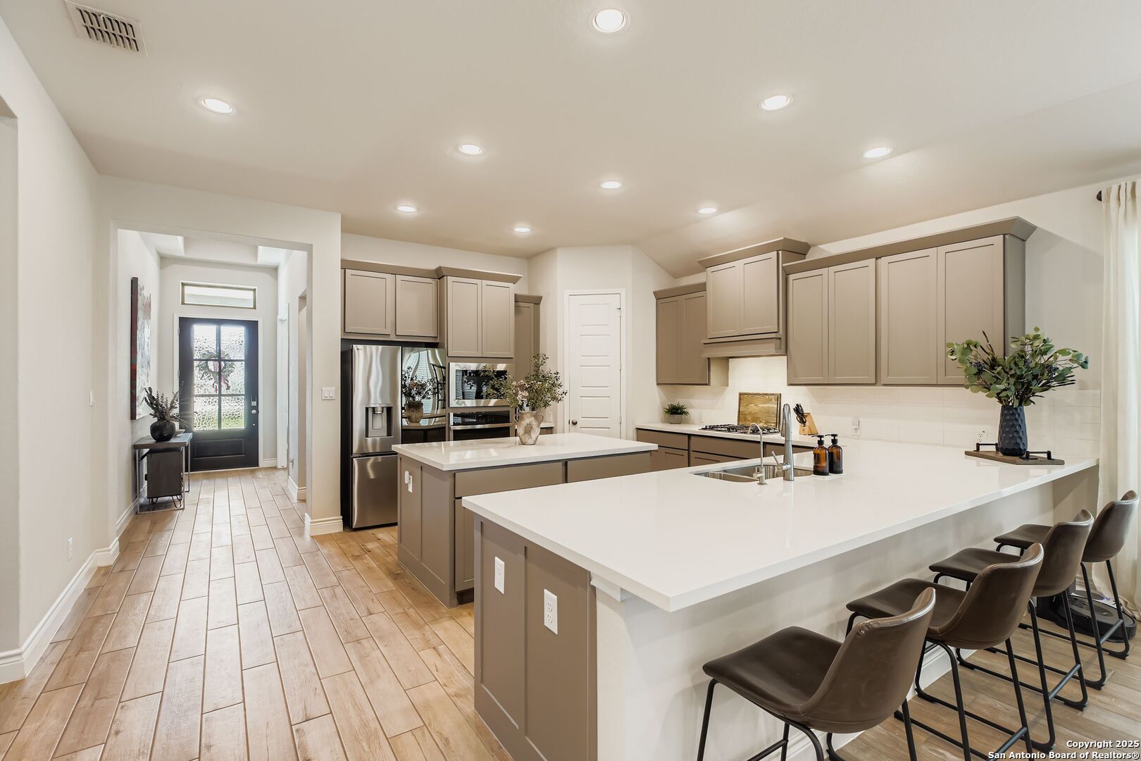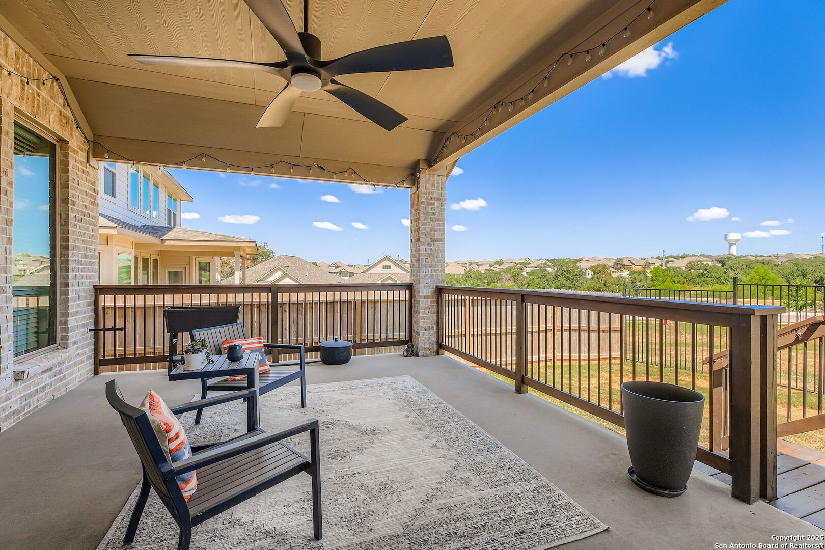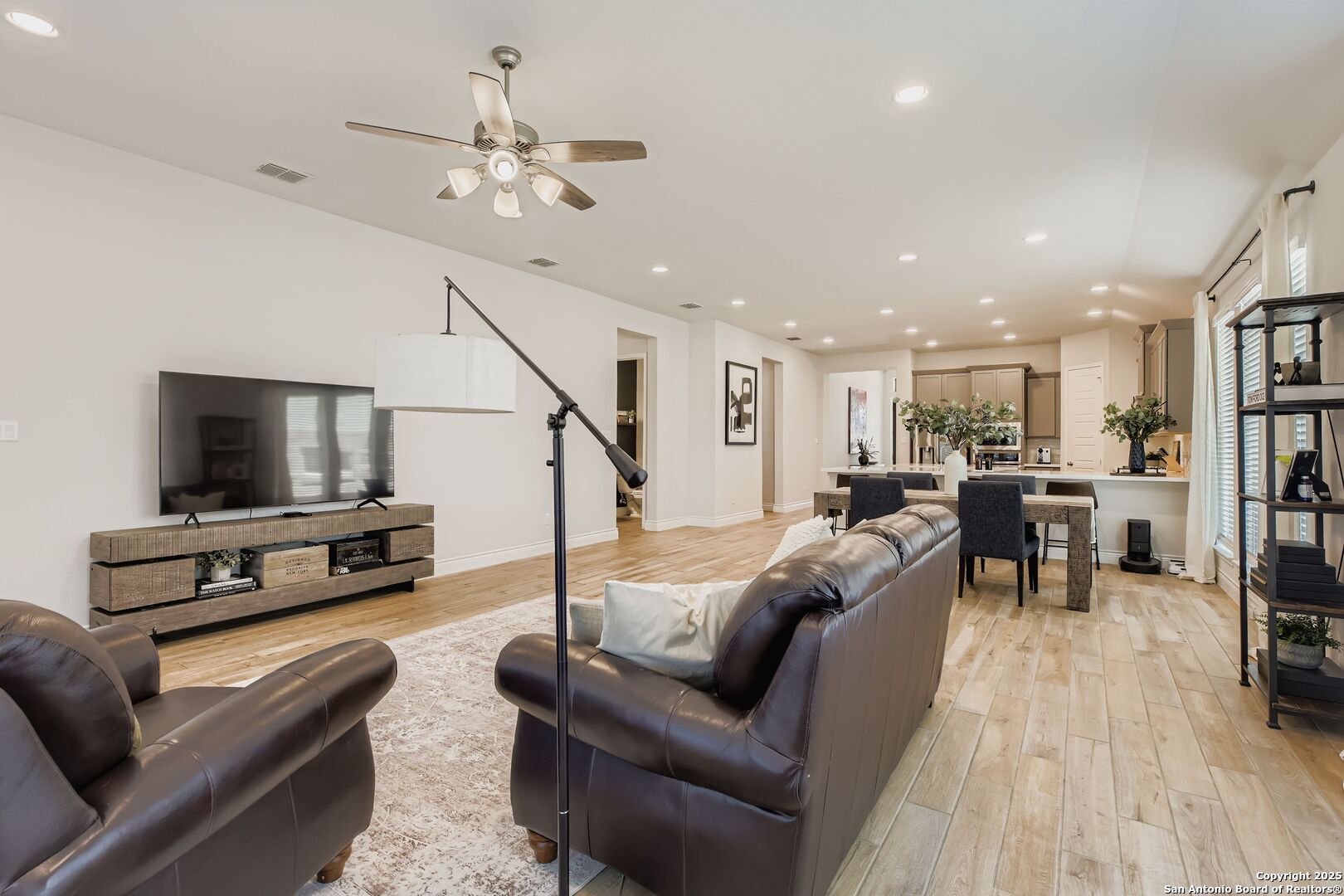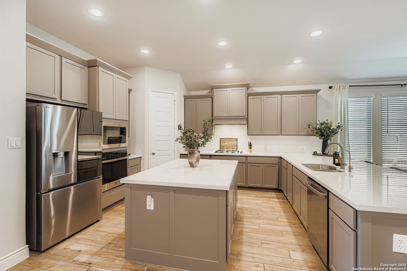 This stunning single-story home features 3 bedrooms, 2.5 bathrooms, an office, with a desirable open floor plan, high ceilings, and custom details throughout. The heart of the home is the eat-in kitchen that boasts large grey cabinets, ample storage, gas cooktop, upgraded backsplash, stainless steel appliances, & large island that seamlessly connects to a spacious great room ideal for entertaining. The secluded owner's suite, situated in a corner for maximum privacy, includes a generous walk-in closet, a sizable bathroom with a walk-in shower and garden tub, high ceilings in the bedroom, and plenty of natural light. Additional two bedrooms, full bathroom, & half bath are located off the family room. The spacious laundry room, mud room, and office are located towards the front of the home. The backyard is an entertainer's delight, showcasing a large covered patio. Residents of this neighborhood also enjoy access to a fantastic resort-style pool. Located in the sought after neighborhood of Ventana! This home is conveniently located close to Boerne, New Braunfels, and San Antonio, with easy access to shopping, dining, golf courses, and highly desired Comal ISD schools. Schedule your private tour today!