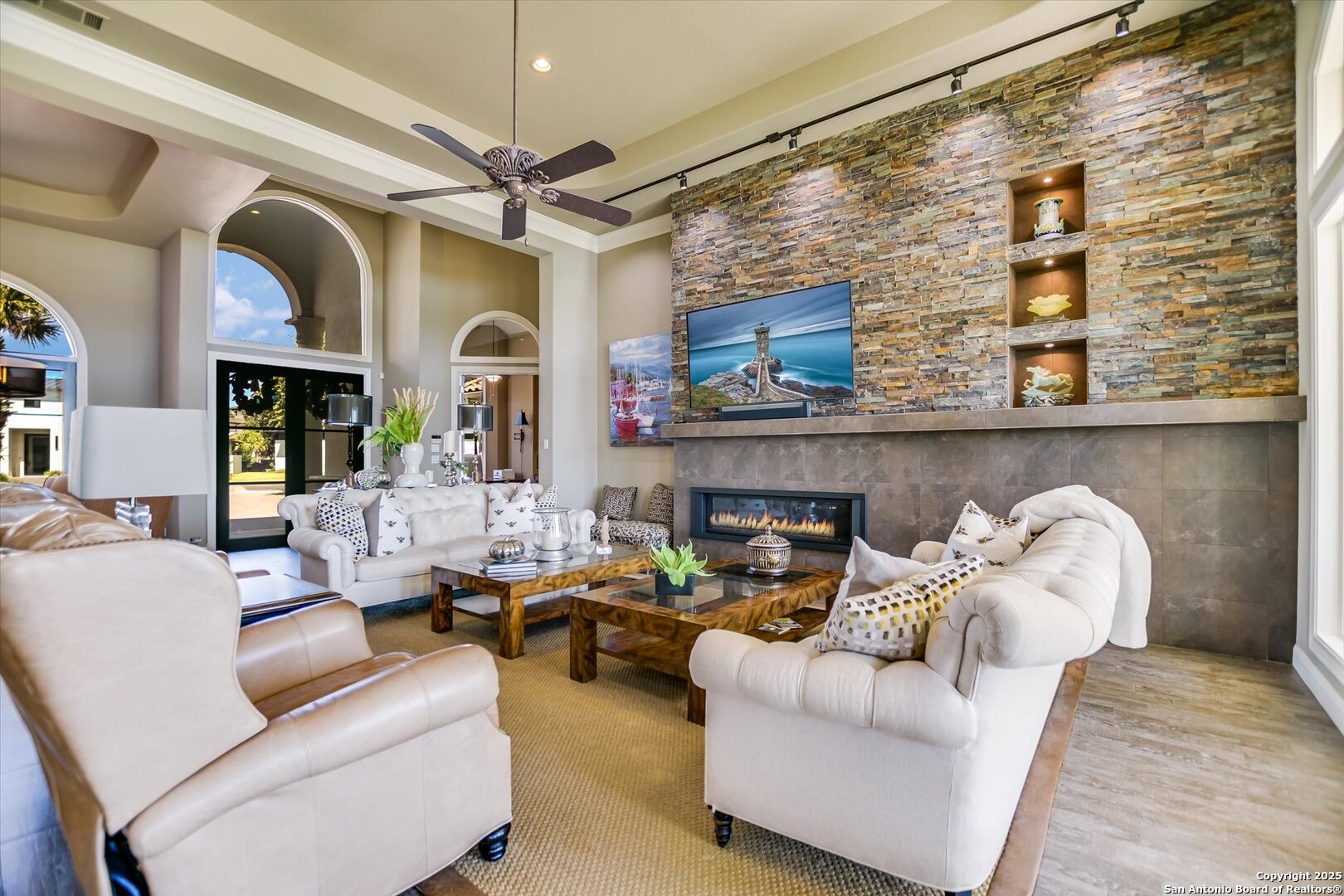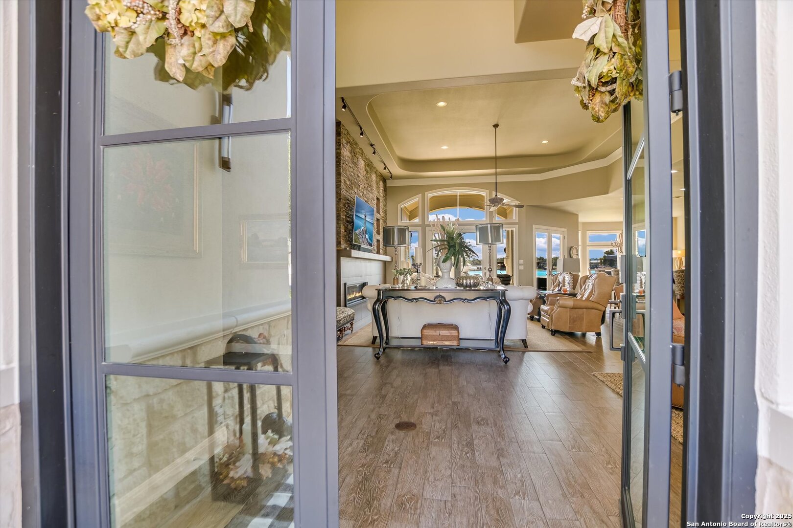 Welcome to 307 Wennmohs Place - a single-level Lake LBJ waterfront retreat. Perfectly positioned on prime open water in Horseshoe Bay West, this stunning residence blends timeless architecture with resort-inspired living. The paver stone drive and soaring columns create an elegant first impression, leading to a grand arched entry that opens into light-filled living spaces. Inside, the great room showcases a stacked-stone fireplace wall, lofty ceilings, and walls of windows that frame the panoramic lake views. The island kitchen features custom cabinetry, granite counters, gas cooktop, Sub-Zero refrigerator, breakfast bar, and an adjacent dining area with panoramic lake views. A dedicated study provides the perfect work-from-home setting, while a cozy sitting area encourages entertaining. The luxurious primary suite offers a cozy sunroom with private patio access, and a spa-inspired bath with dual vanities and generous storage and closet space. Two stylish guest suites ensure comfort for family and friends, both with convenient en-suite baths. Outdoor living takes center stage with a covered patio and lush lawn leading to the expansive lakeside deck, where a pergola-covered seating area, a covered boat lift and one PWC lift create the ultimate setting for relaxation or hosting gatherings on the constant-level waters of Lake LBJ. Impeccably maintained and located just minutes from the Horseshoe Bay Resort, this home delivers the perfect balance of elegance, comfort, and Texas Hill Country waterfront living.