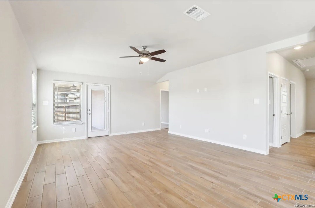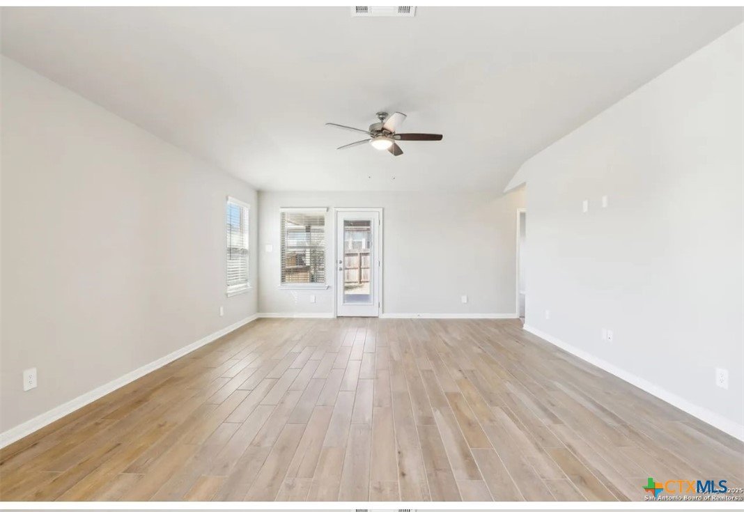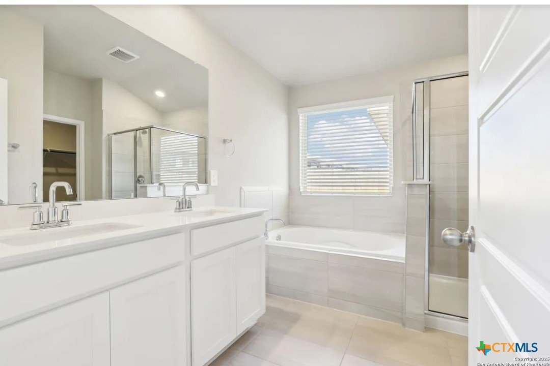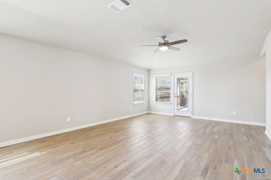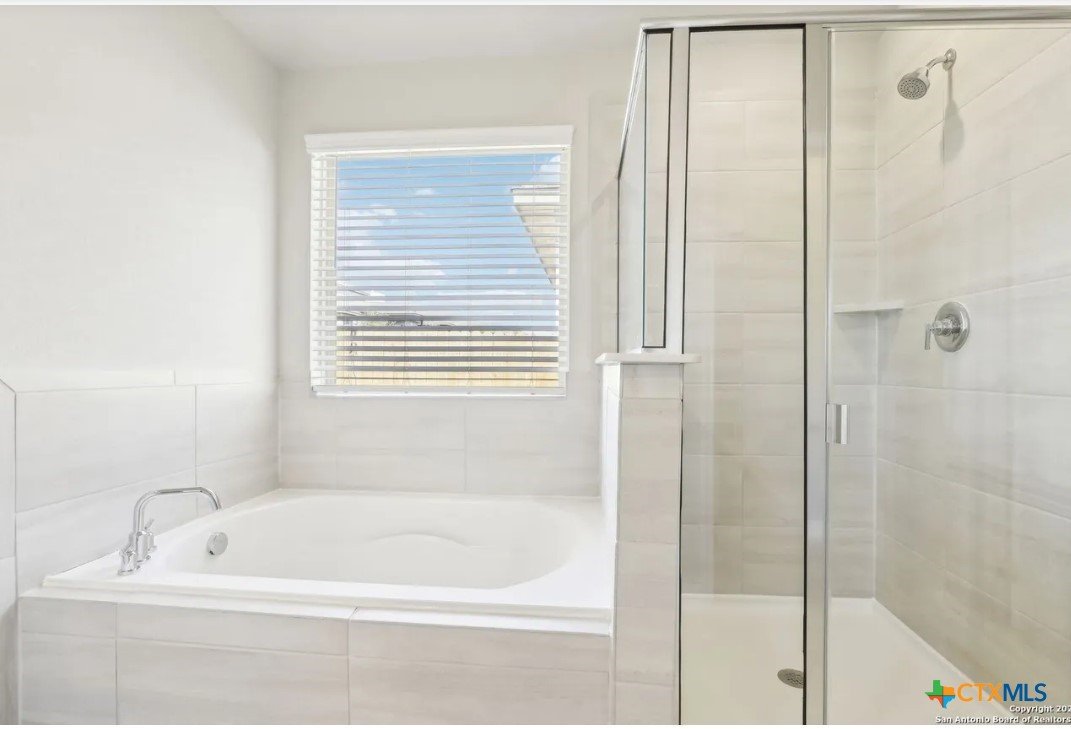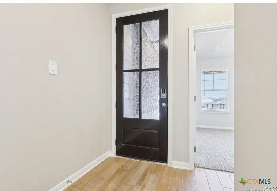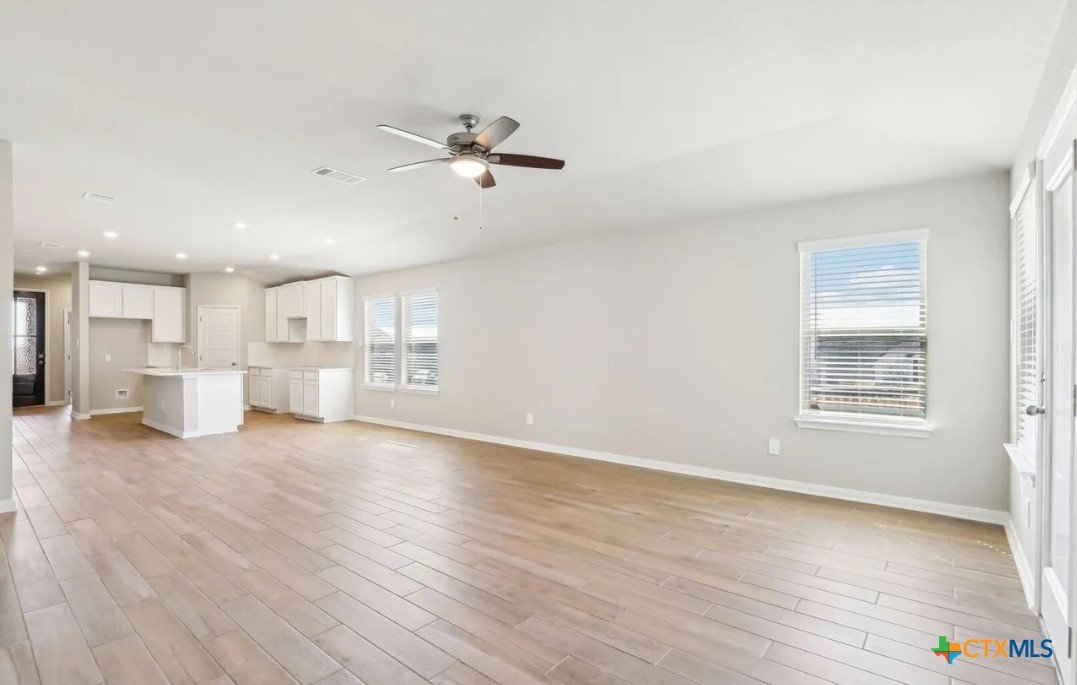 Location, Location, Location! Lowest tax rate in the area at approximately 1.39% —a rare find! This nearly new one-year-old Hughes floor plan offers 4 bedrooms, 3 baths in a spacious single-story design and is priced under market, making it an exceptional value with every imaginable builder upgrade. Step inside to a wide-open floor plan featuring a combined living and dining area perfect for entertaining. The gourmet quartz island kitchen boasts a stylish subway tile backsplash, top-of-the-line appliances, walk-in pantry, and refrigerator with water and ice in the door. Trendy wood-look tile flooring runs throughout the main living areas. The enormous luxury primary suite includes beautiful bay windows and a spa-inspired ensuite bath with double vanities, garden tub, separate shower, and large walk-in closet. A separate bonus/TV/playroom provides flexible space for media, work, or play. Additional upgrades include an in-home pest control system, in-ground sprinkler system, security system, and energy-efficient foam insulation. Newer washer/dryer and window blinds convey. The home features a striking brick and rock exterior, covered front porch, and an impressive 8-foot wood and glass front door, plus a huge covered back patio perfect for outdoor living. Located in a charming neighborhood of approximately 250 homes with 15+ acres of preserved undeveloped land in the center. Just 5 minutes to downtown New Braunfels and within walking distance to H-E-B, Starbucks, shops, and numerous restaurants, offering the perfect combination of location, lifestyle, and value.