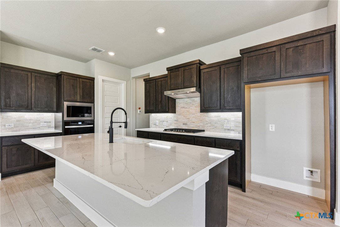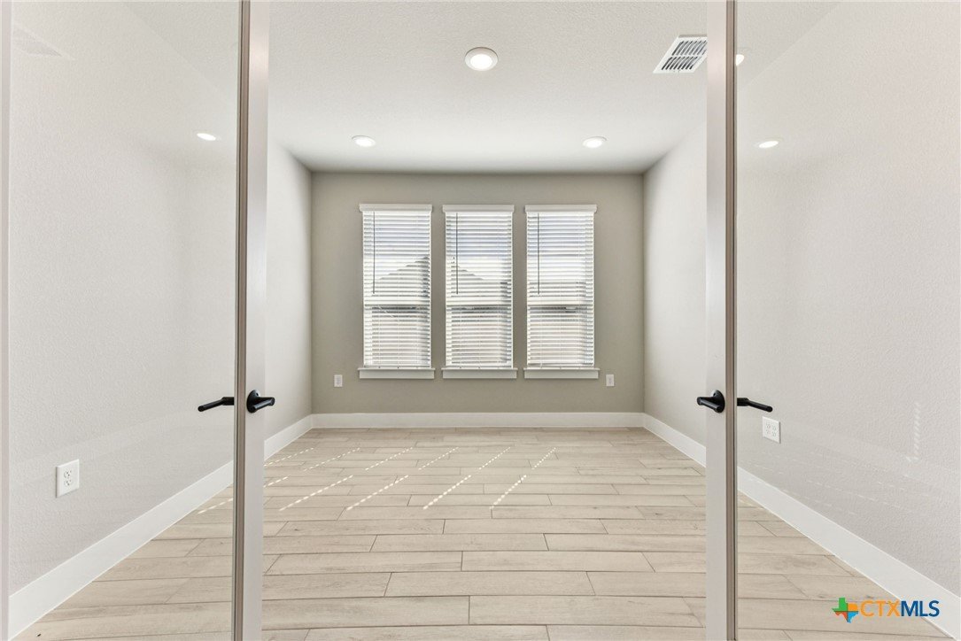 Auburn Plan with upgraded kitchen, quartz countertops, dry bar, optional study with double doors, optional tray ceilings in entry and living, optional utility room cabinets with sink, optional powder bath, tile floors throughout, enlarged covered patio, 4' garage extension