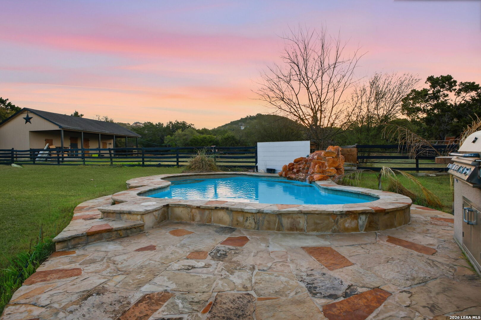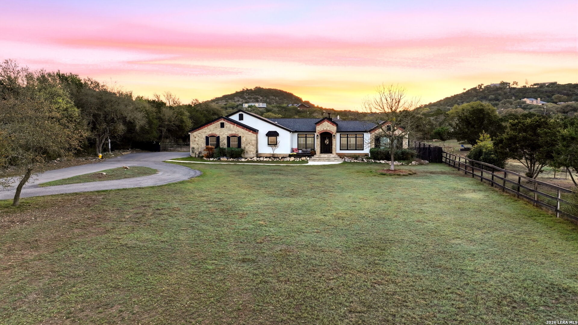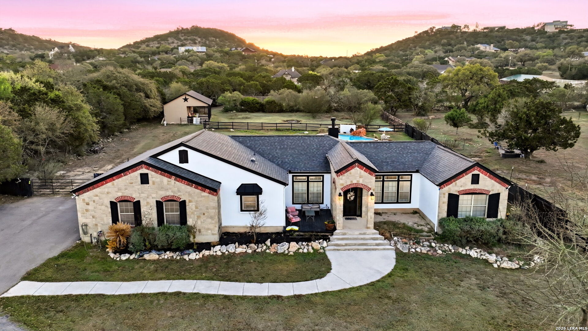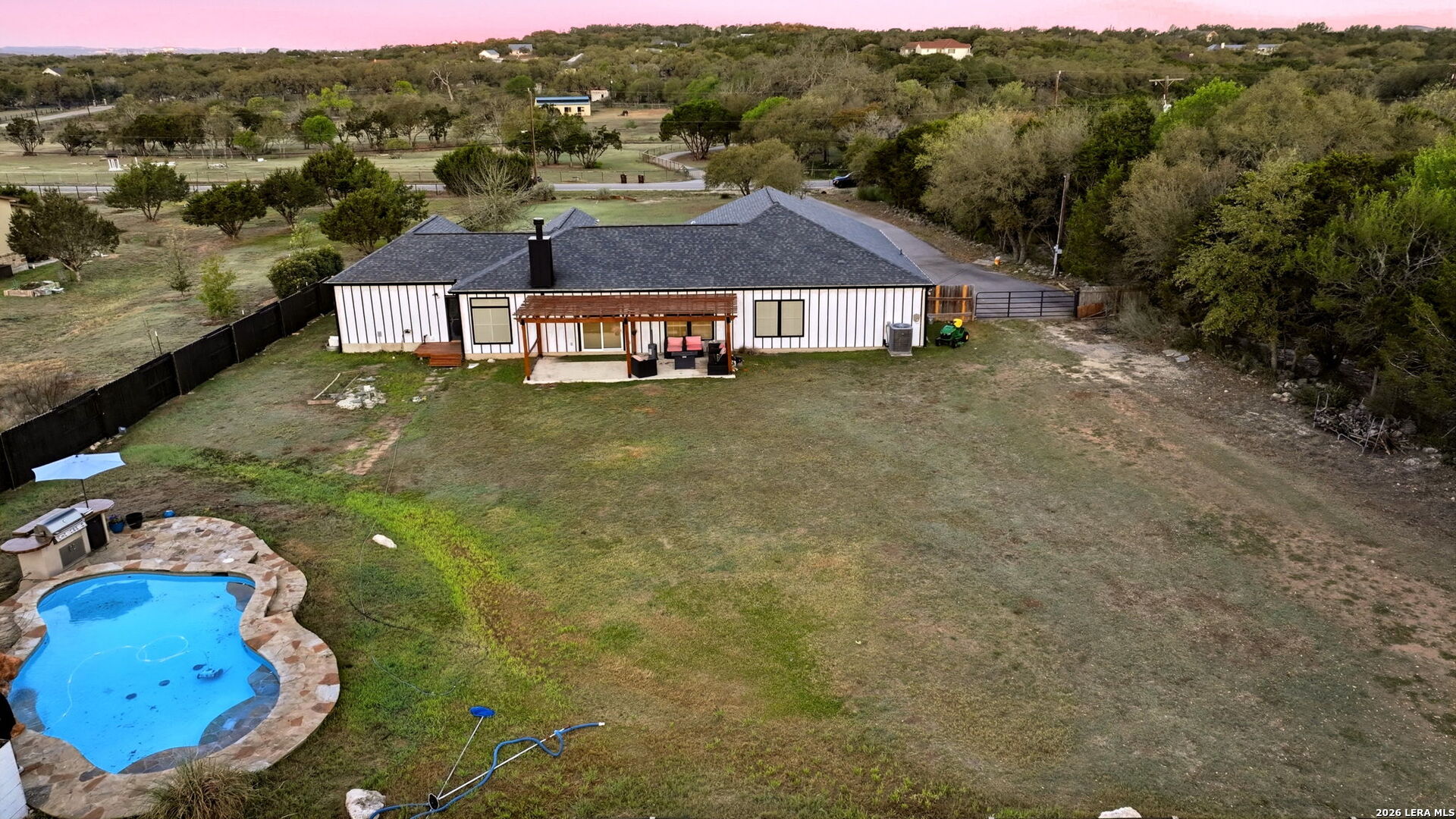 Welcome to 30870 Bridlegate Drive in the highly sought-after Rim Rock Ranch community of Bulverde, Texas-where refined Hill Country living meets true ranch-style freedom. This exceptional single-story home sits on expansive acreage and offers the rare opportunity to enjoy horse-friendly living with existing horse stalls and a dedicated tack room already in place, making it turnkey for equestrian enthusiasts or anyone seeking space, privacy, and lifestyle flexibility. From the moment you arrive, you're greeted by breathtaking Hill Country views, mature trees, and a peaceful setting that immediately sets this property apart. The home itself features a thoughtfully designed one-story layout with timeless finishes, natural light throughout, and seamless indoor-outdoor living. Recent updates provide peace of mind and modern appeal, including a roof that is less than three years old, an AC system approximately four years old, new flooring, and a brand-new dishwasher. A newly added circular driveway enhances both convenience and curb appeal, while a new fence along the back of the property adds function and privacy. Step into your backyard oasis where an in-ground pool invites you to relax, entertain, and unwind under Texas sunsets. The wide-open land provides endless possibilities-whether you're riding, expanding your ranch setup, or simply enjoying the privacy and serenity of your surroundings. One of the most unique and calming features of this property is the seasonal creek that runs along the land, creating a tranquil natural backdrop and enhancing the overall sense of escape and connection to nature. Rim Rock Ranch is known for its rare combination of space and accessibility, allowing residents to fully embrace a ranch lifestyle while remaining close to modern conveniences. Located just minutes from Highway 281, the property offers quick and easy access into San Antonio, making commuting, dining, shopping, and entertainment effortless. Nearby attractions include local wineries, golf courses, Guadalupe River recreation, and charming Hill Country destinations such as Blanco and Spring Branch, along with the conveniences of the Stone Oak area and highly regarded Comal ISD schools. 30870 Bridlegate Drive is more than a home-it's a lifestyle. It's a rare opportunity to own a piece of Texas where you can bring your horses, enjoy wide open spaces, relax by your pool, and still be just minutes from the city. Schedule your private showing today and experience the best of Bulverde living.