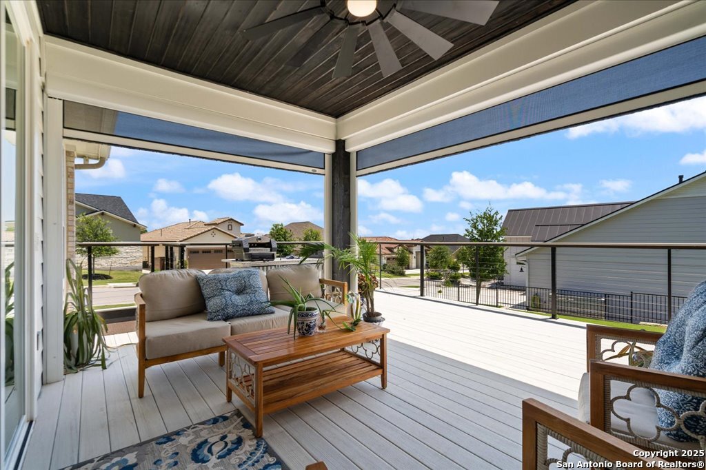 Welcome to this impeccably maintained residence, perfectly positioned on a rare premium corner lot at the top of the hill. From here, enjoy refreshing breezes and evening views of the city lights, all within the prestigious, gated Kissing Tree community. Designed with a seamless blend of luxury, comfort, and accessibility, the home features a discreet zero-threshold entry with an integrated wheelchair ramp that opens onto an expansive custom composite front deck. Outfitted with state-of-the-art MagnaTrack screens engineered to withstand high winds, this outdoor space is ideal for year-round enjoyment. A setup for custom mobile outdoor cooking-including a Blackstone pizza oven and griddle-makes it perfect for entertaining in true indoor-outdoor style. Inside, curated designer lighting, soaring 12-foot ceilings, and upgraded tile flooring set a refined, airy tone throughout. The gourmet kitchen is a chef's dream, anchored by an oversized granite island and elevated with thoughtful upgrades. The primary suite is a serene retreat, complete with a spa-inspired bath and a California-style walk-in closet offering exceptional storage and organization. This is not a builder-grade home-it is a masterfully designed, one-of-a-kind Kissing Tree retreat where style, functionality, and comfort converge. Motivated seller must move and considering all reasonable offers.