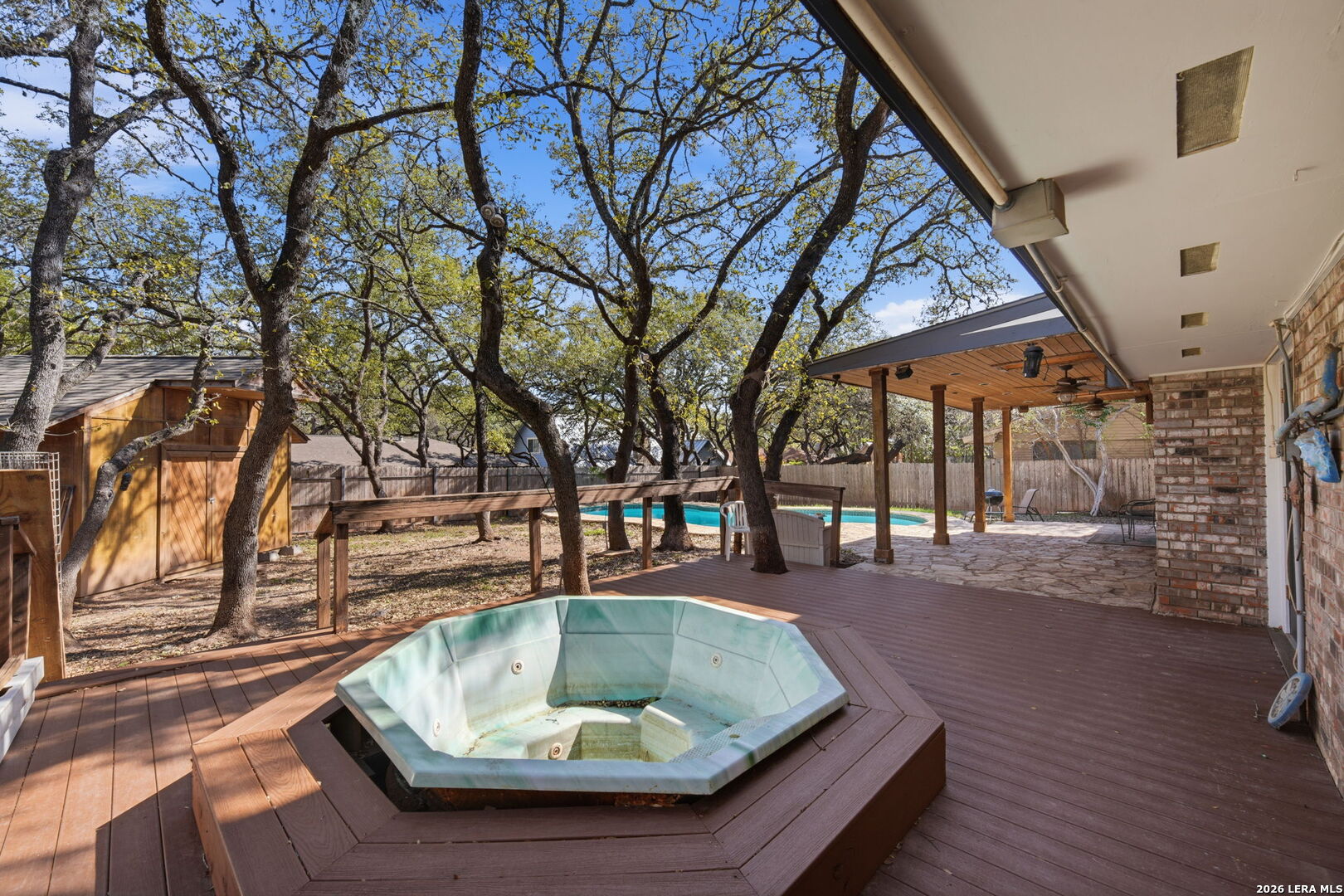 This 4-bedroom, 2-bath home offers approximately 2,400 square feet of living space in an established neighborhood with mature trees and established surroundings. The home features a spacious layout with multiple living and dining areas, providing flexibility for a variety of living arrangements. The main living area includes a fireplace, built-in shelving, and access to the backyard, creating a functional space for everyday living. The kitchen offers ample cabinet storage and opens to a breakfast area with views of the backyard. Updated flooring in the main living areas adds a modern touch while maintaining the home's original character. Step outside to a large backyard featuring an in-ground pool, a Trex deck for low-maintenance outdoor living, a covered patio, and a storage shed. Mature trees provide added shade and privacy, creating a great space for relaxing or entertaining. This home offers a great opportunity to add your personal touch. Conveniently located near major highways, shopping, dining, and schools.
