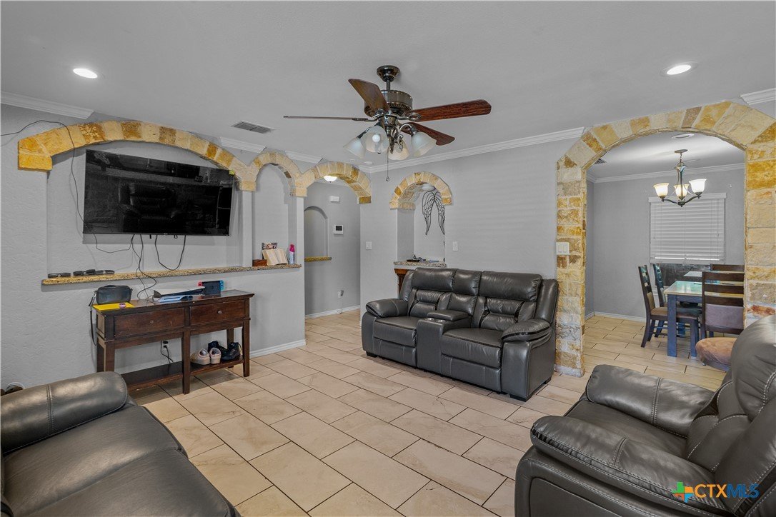 This meticulously renovated three-bedroom two bath home is ideally situated in a tranquil neighborhood. The open concept throughout the house has been completely transformed. The kitchen boasts updated granite countertops custom cabinets and an inviting eat-at bar that extends to the living room. Additionally, the home includes a separate, enclosed laundry room and stunning metal roof.