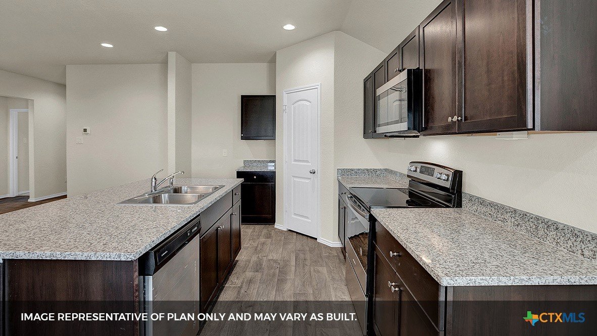 MOVE IN READY! The Baxtor a one-story home is perfect for small families or homeowners looking to downsize. Inside this 1,409 square foot home, you will find 3 bedrooms, 2 bathrooms and a 2-car garage. Our homes in Arroyo Ranch feature brick or brick and stone exteriors and the Baxtor plan is available with 2 exterior elevations to choose from. Coming into the home from the covered front porch, you’ll find a foyer that leads you to the heart of the house, the living area. The open concept design of kitchen, dining and family room allows for easy entertaining and everyday living. The kitchen includes granite countertops, a large island with an undermount sink, a corner pantry closet, stainless-steel appliances and 36’’ upper cabinets. The primary bedroom is off the dining room and includes its own attached bathroom, making the start of your day a seamless step from sleep to your morning routine. Enjoy the 5’ walk in shower, double vanity, and separate door to the toilet for privacy. A walk-in closet with generous shelving is connected to the bathroom. The secondary bedrooms are off the foyer at the front of the home. In the hall between the bedrooms is the secondary bathroom, which includes a shower/tub combination. Each bedroom includes a closet with shelving. The utility room is tucked away between the foyer and kitchen, convenient to all bedrooms once the clothes are cleaned. The Baxtor includes vinyl flooring throughout the common areas of the home, and carpet in the bedrooms. All our new homes feature a covered back patio, full sod, an irrigation system in the front and back yard, and a 6’ privacy fence around the back yard. This home includes our America’s Smart Home base package, which includes the Amazon Echo Pop, Front Doorbell, Front Door Deadbolt Lock, Home Hub, Thermostat, and Deako® Smart Switches.