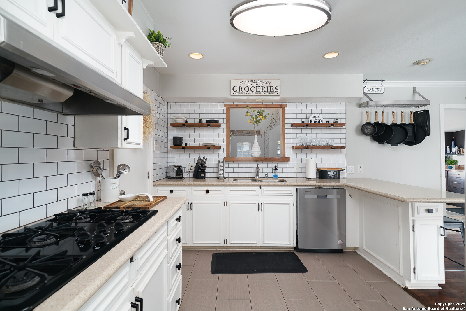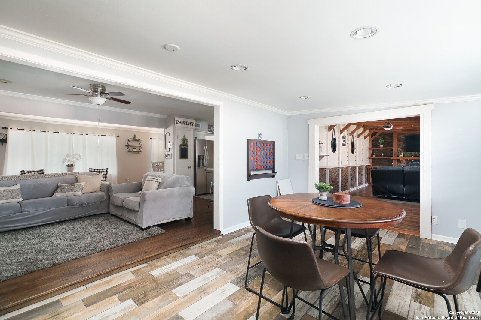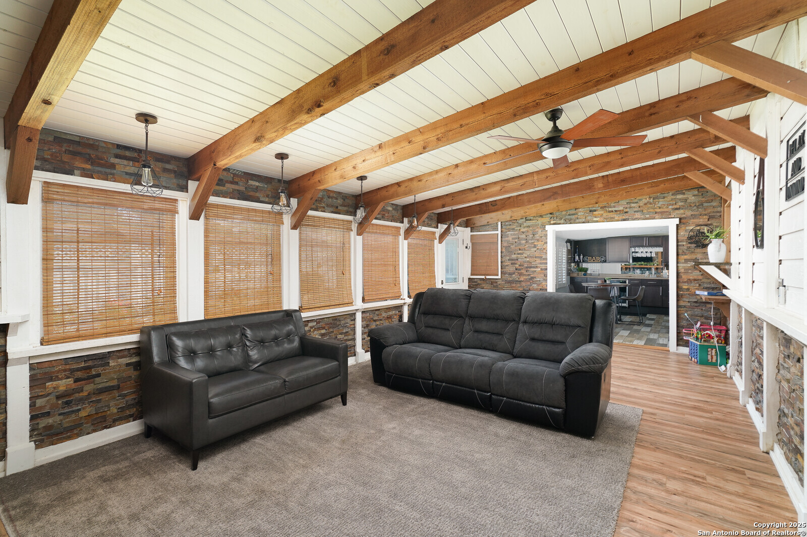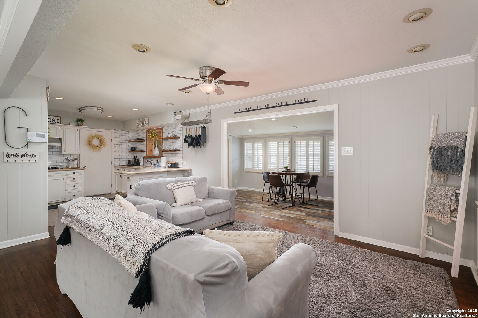 Step into the charm of this beautifully maintained 3-bedroom, 2-bath home offering 2,000 square feet of timeless farmhouse-inspired living in one of the city's most vibrant and accessible areas. This spacious single-story gem features two inviting living areas, two dining spaces, and a bright, functional kitchen with classic finishes, open shelving, and ample built-in storage. The home boasts elegant touches throughout, including hardwood floors and custom details like a bar area and a cozy, wood-beamed den