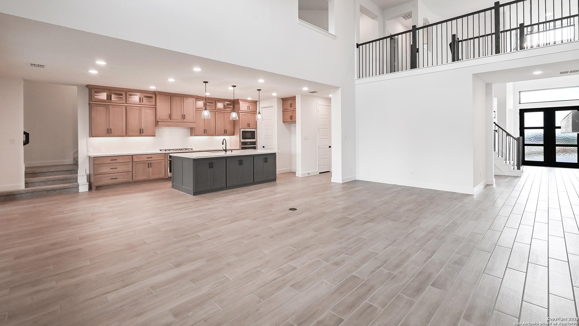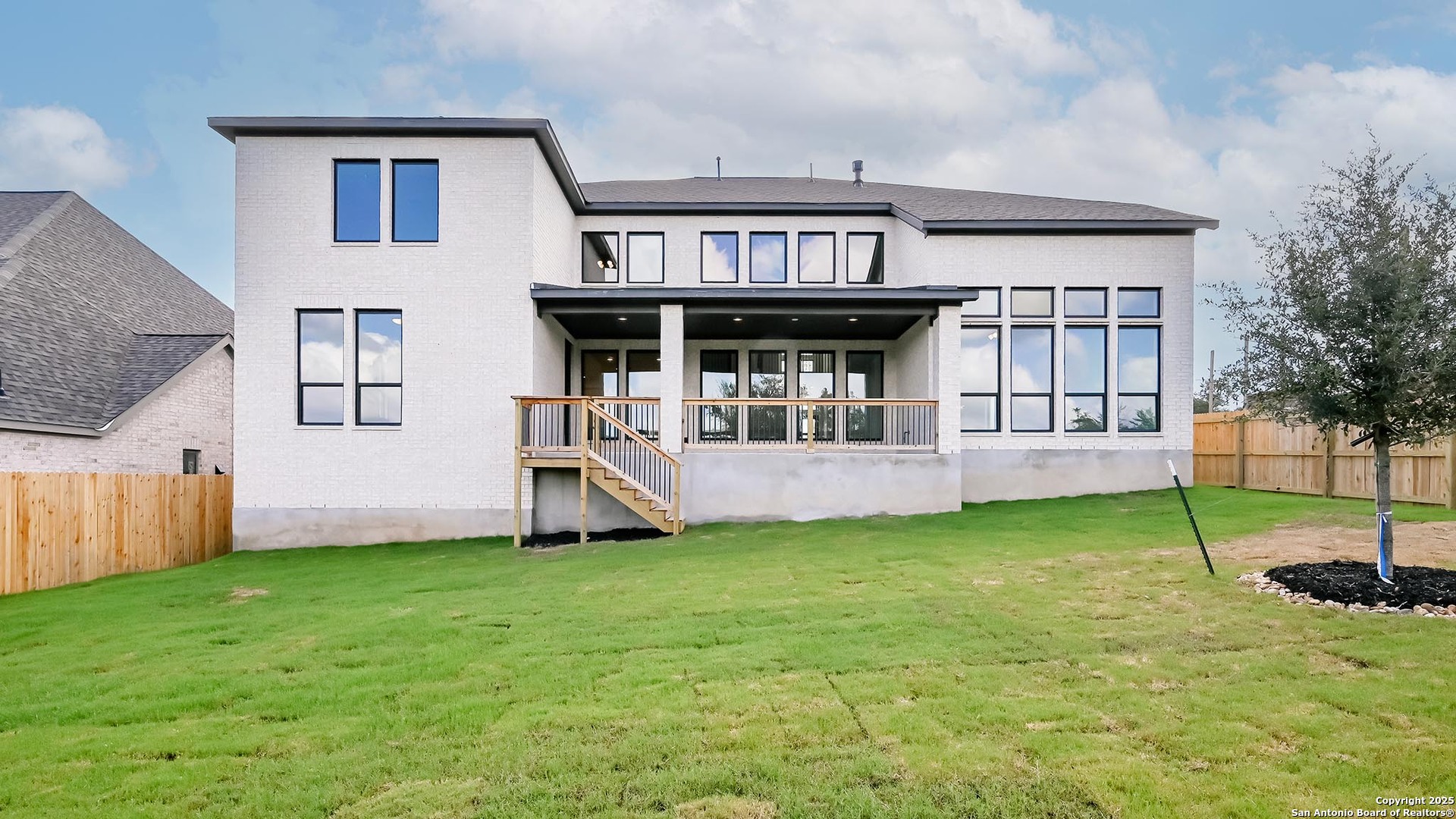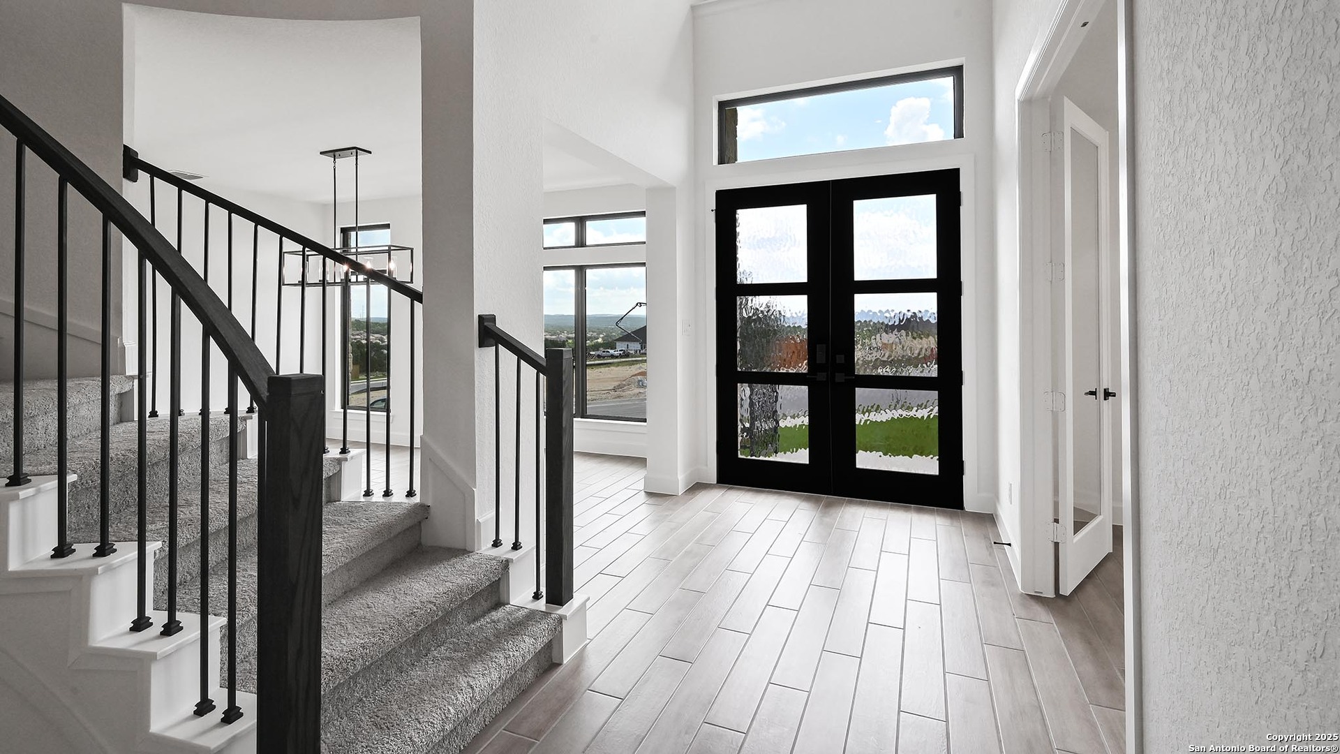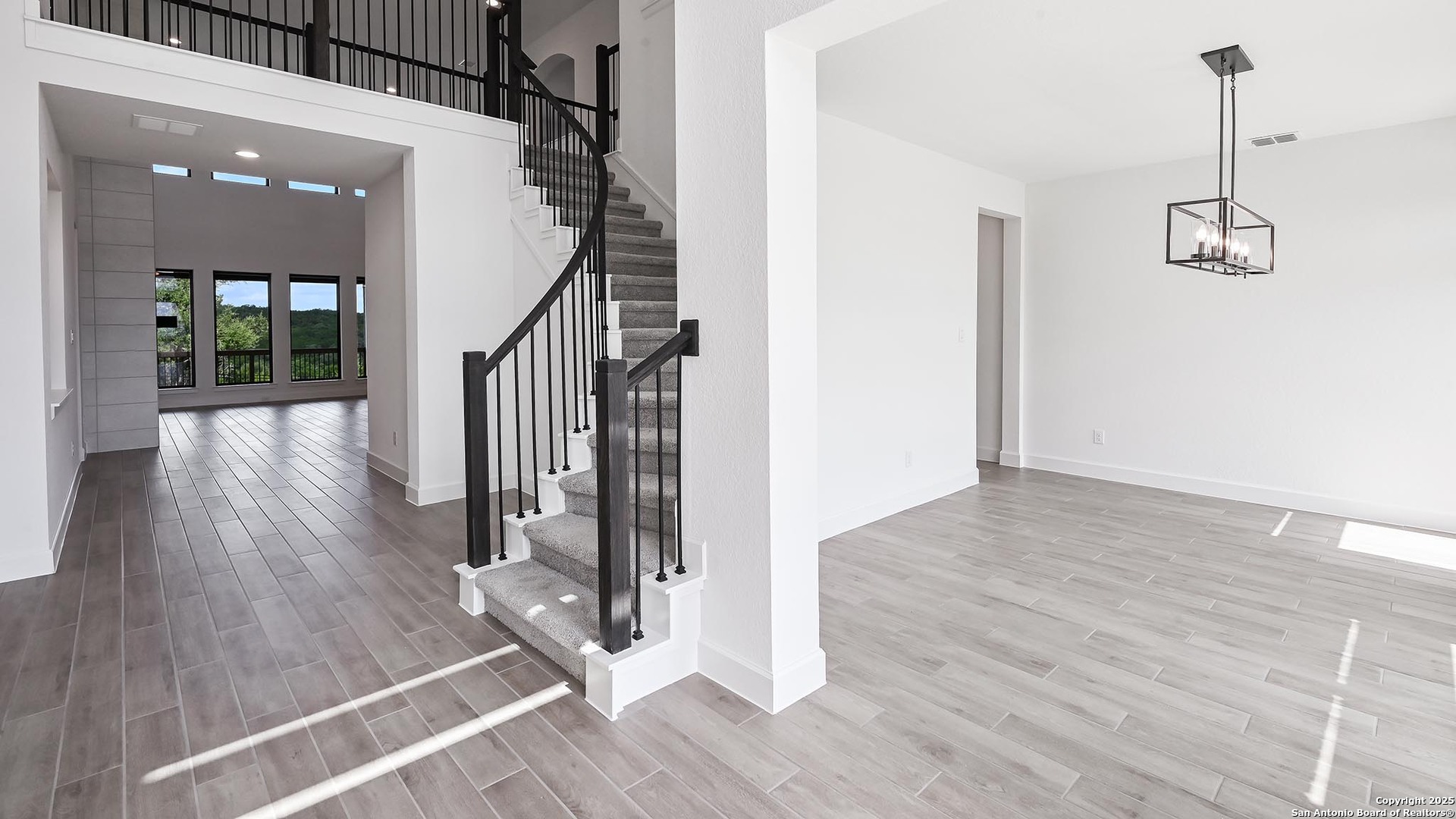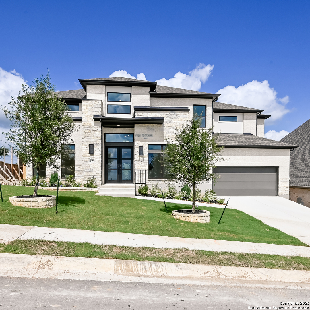 Home office with French doors and dining room frame the two-story entry. Two-story family room with wall of windows opens to kitchen and morning area. Kitchen features island with built-in seating space and Butler's pantry. Upstairs media room, game room, secondary bedrooms with a Hollywood bath. Downstairs guest suite with full bath and walk-in closet. Garden tub, separate shower and two walk-in closets in the primary suite. Additional staircase just off morning area. Extended covered backyard patio. Three-car garage.