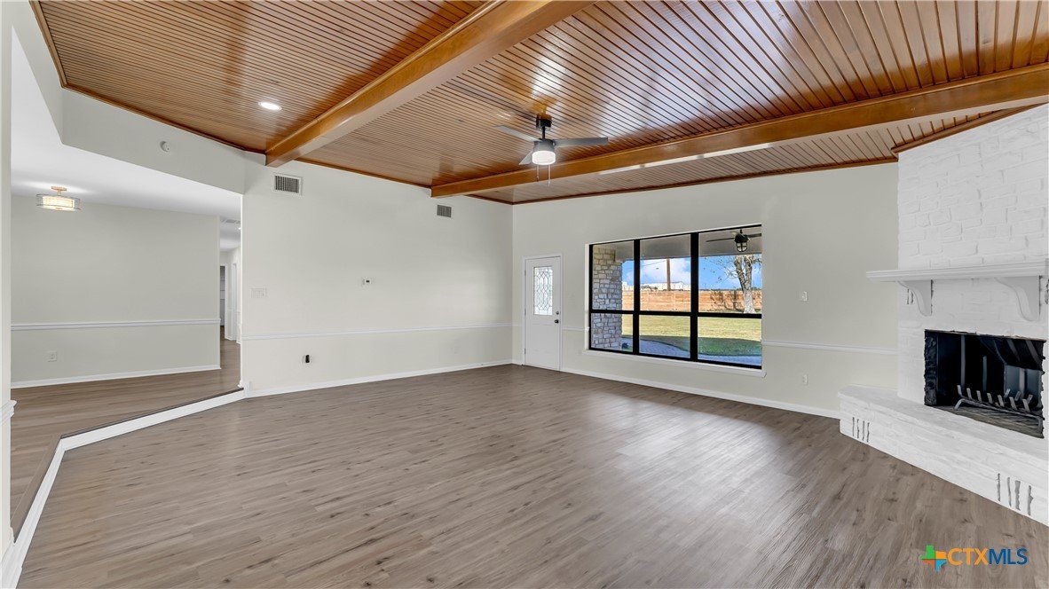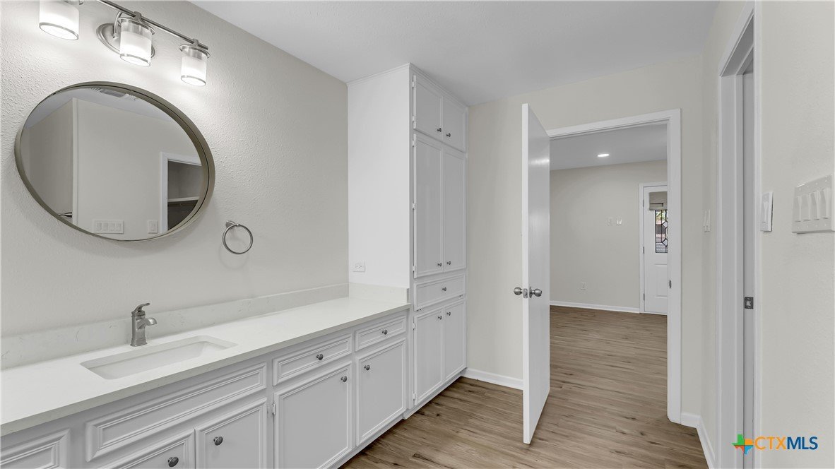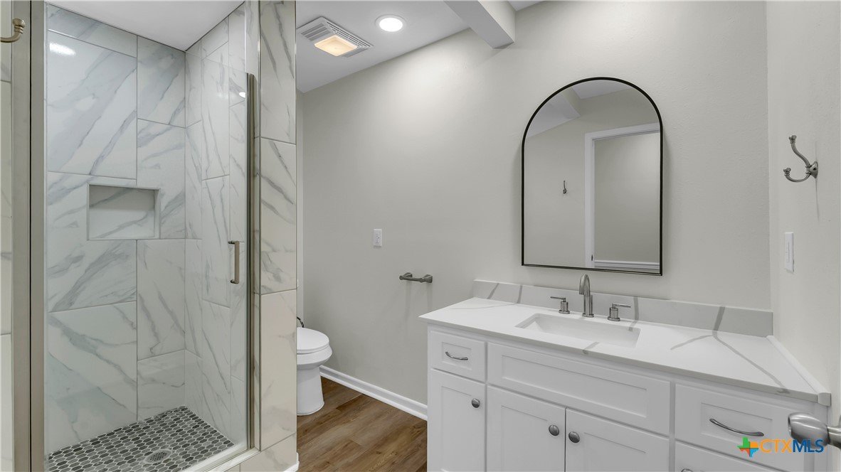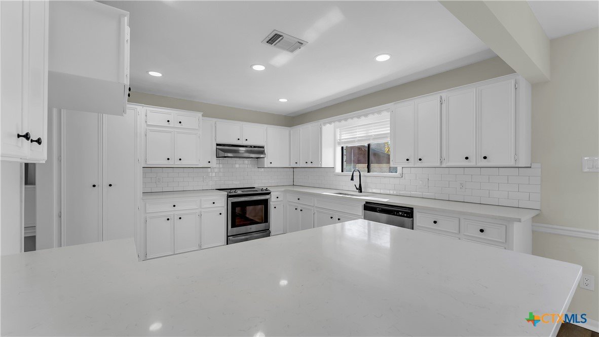 Beautifully remodeled 2,869 sq ft large family home featuring 4 bedrooms and 3 bathrooms, located in a quiet cul de sac within a family friendly neighborhood. This thoughtfully updated property offers brand new central HVAC throughout the main home, with mini split systems providing heating and cooling in the game room and fourth bedroom for added comfort and efficiency. The interior showcases a completely remodeled kitchen with quartz countertops, brand new appliances, tile flooring, and updated electrical throughout. Spacious living areas feature built ins in the living room, new flooring in the living area and primary suite, fresh interior paint, and large windows that fill the home with natural light. Two secondary bedrooms include carpeted flooring. Recent improvements include a new roof, new hot water heater, brand new fencing, some new insulation, and updated bathrooms. The second bathroom has been fully remodeled, while the third bathroom features all new fixtures with the existing bathtub remaining. The fourth bedroom includes a powder room with a vanity. Additional highlights include a two car garage with new garage door openers, covered front and back porches, and a spacious backyard with mature trees perfect for everyday living and entertaining. Conveniently located within walking distance to the elementary and middle schools and just five minutes from HEB and downtown, this move in ready home combines modern updates, generous living space, and an excellent location.