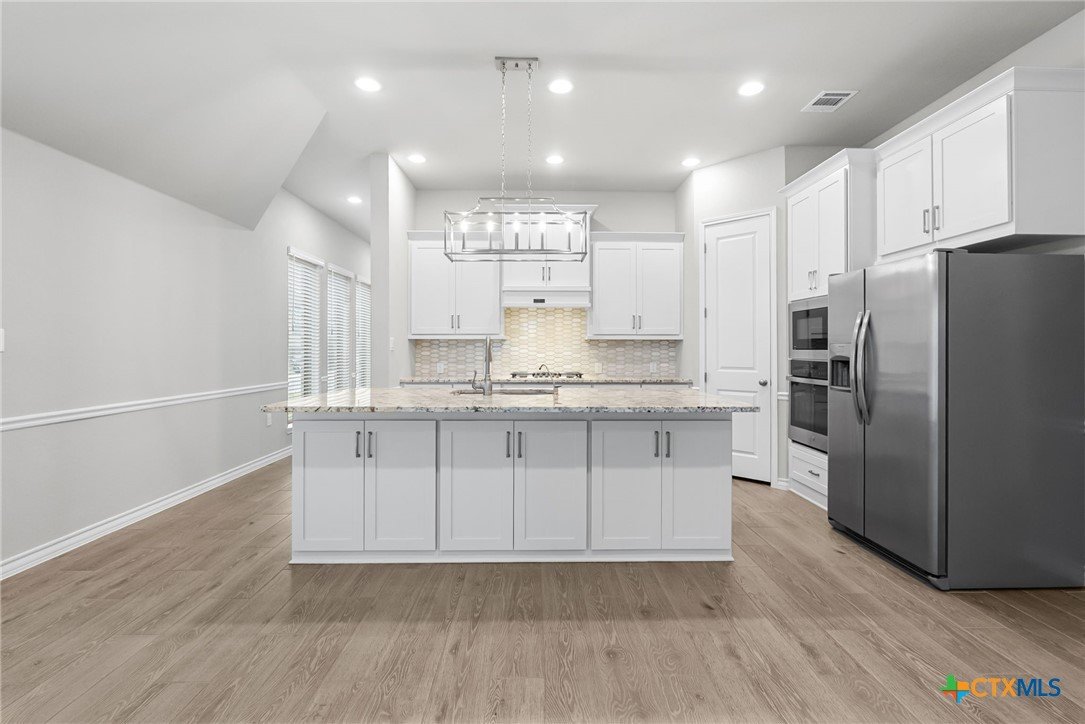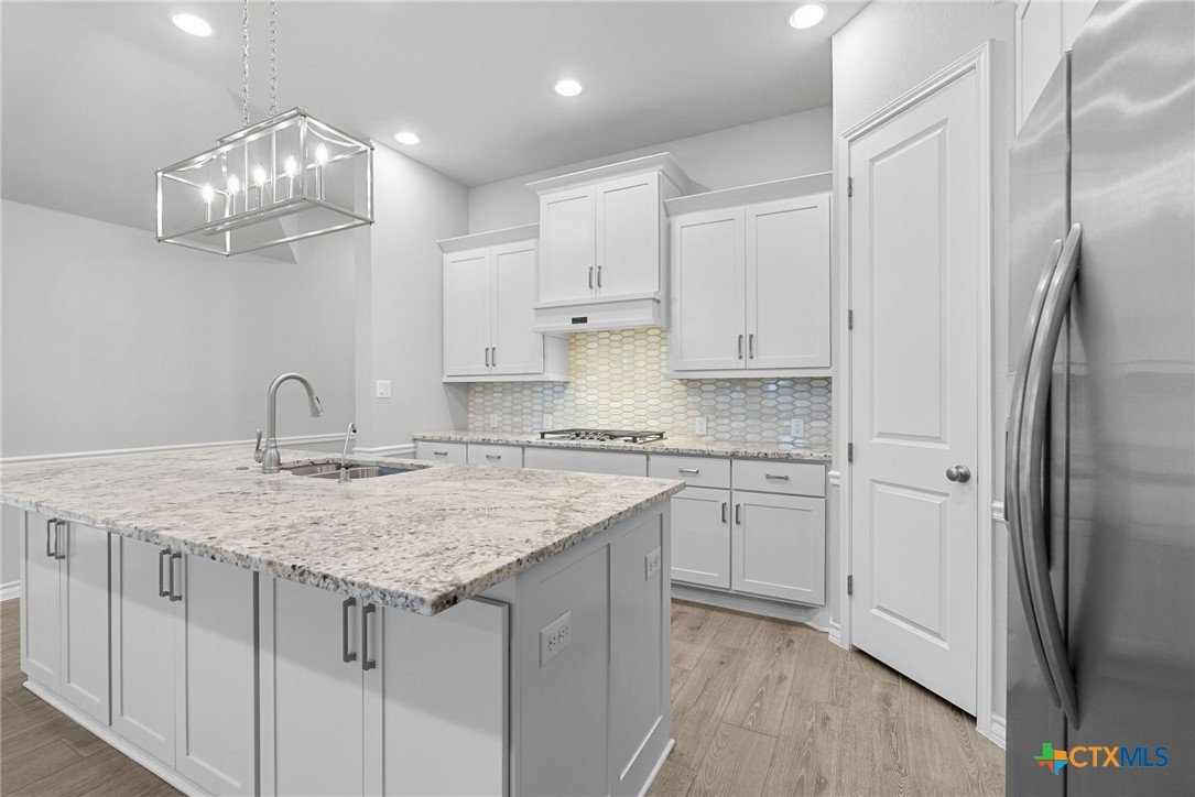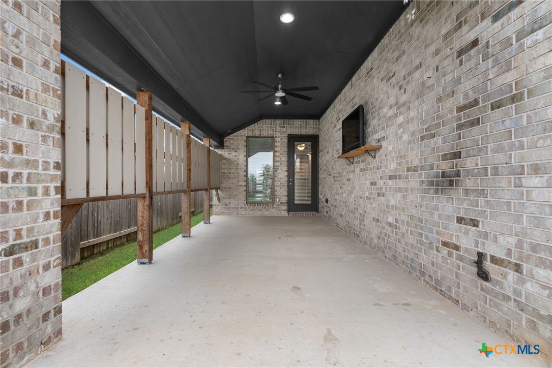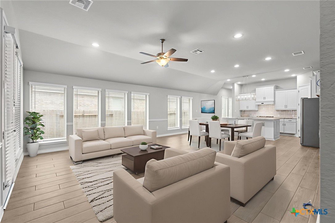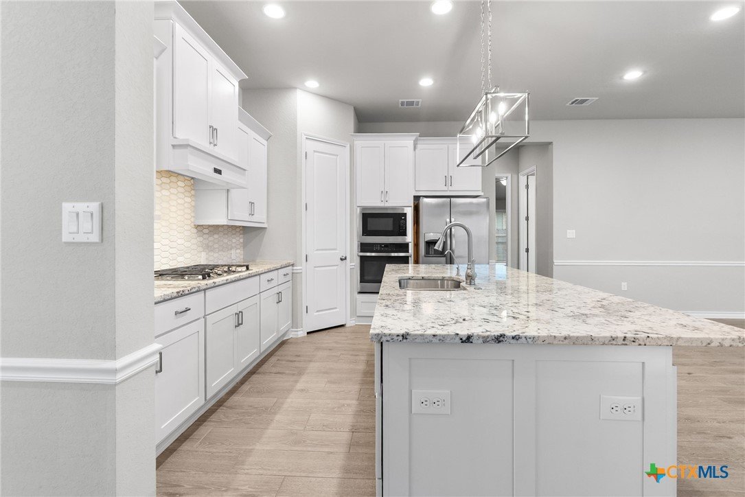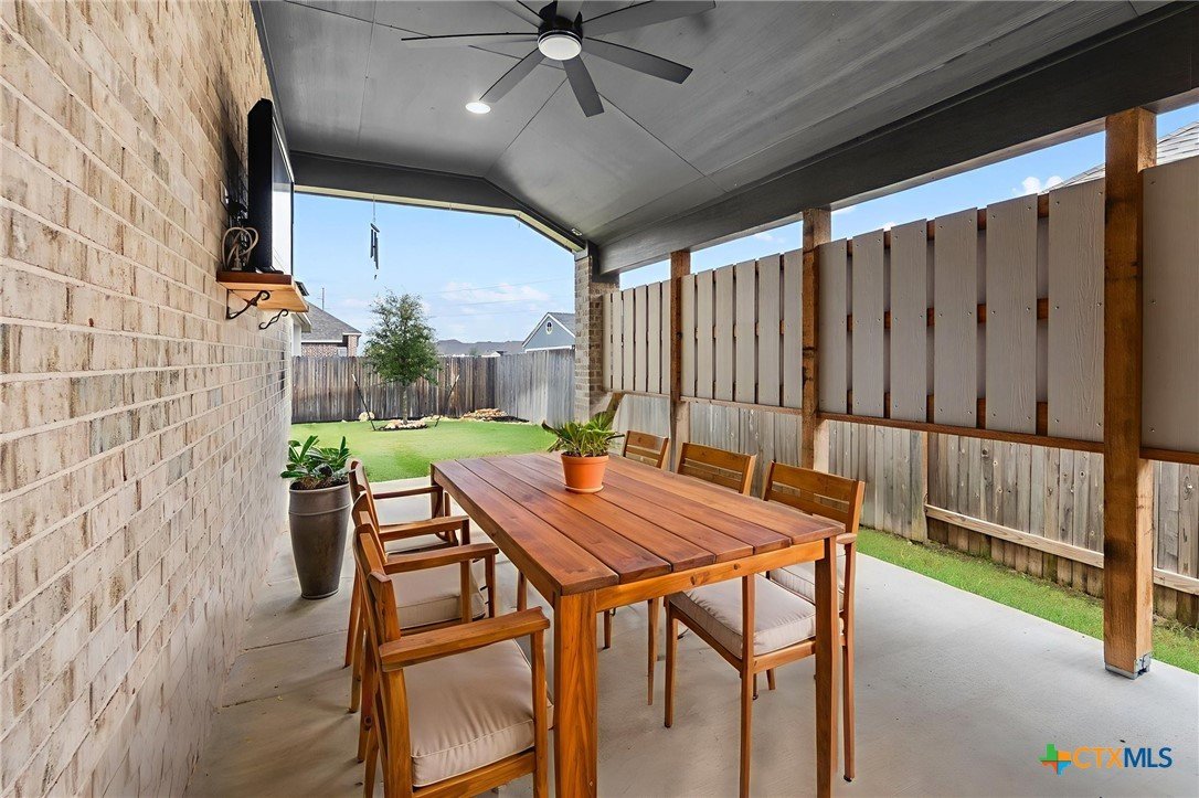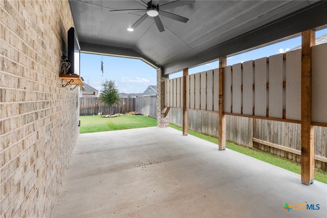 Welcome to 3129 Coral Way, a beautifully upgraded 4-bedroom, 3-bath home located in the highly desirable Village of Mill Creek and Navarro ISD. Built for both comfort and functionality, this single-story layout offers 2,263 sq ft of open-concept living with thoughtful improvements throughout. A bright, inviting kitchen sits at the heart of the home, featuring upgraded cabinets, premium granite countertops, a 5-burner gas cooktop, built-in appliances, and a spacious island perfect for meal prep or gathering. The kitchen refrigerator conveys, and an additional garage refrigerator is also included. The living and dining spaces flow seamlessly, enhanced by ceiling fans in every bedroom, the living room, and the back patio for year-round comfort. All bedrooms feature upgraded carpet and padding, providing a soft, comfortable feel underfoot. The spacious primary suite offers a large bath with separate vanities, a soaking tub, walk-in shower, and generous closet space. Outside, the home continues to impress. The covered back patio includes a privacy panel and mounted TV-ideal for outdoor enjoyment. A gas line is already installed for a future outdoor kitchen, offering additional entertaining potential. The yard is supported by a full sprinkler system, making maintenance simple. Additional upgrades include: Driveway lighting with timer, Garage shelving for added storage, Water filtration system, Blinds throughout the home. This property also features an attached 3-car garage, a beautifully maintained exterior, and a prime location close to New Braunfels, Seguin, schools, shopping, and major commuter routes. With its upgrades, layout, and location, this home is truly move-in ready and offers exceptional value in Navarro ISD.