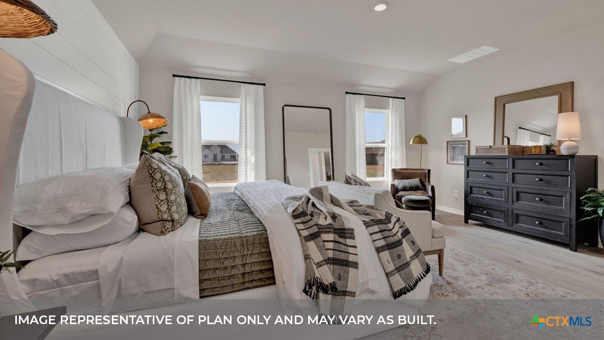 MAY/JUNE ESTIMATED COMPLETION. CORNER LOT! The Irving is a one-story home includes 5 bedrooms, 3 bathrooms, and a study within 2,592 square feet of living space. As you enter the home from the covered front porch, you’ll cross the foyer to the dining room, family room and kitchen. This large open concept space is perfect for entertaining and everyday living. The kitchen includes an island with undermount sink, quartz countertops, decorative tile backsplash, a corner pantry closet, stainless-steel appliances and 36’’ upper cabinets. The utility room with an extra closet is located just off the kitchen. Check out the primary bedroom, located at the back of the home. This oversized bedroom will become your oasis at the end of the day. Enjoy the 5’ walk in shower, raised cultured marble vanity with double sinks and toilet area with a separate door. A walk-in closet with generous shelving is connected to the bathroom. In the opposite rear corner of the home, you’ll find Bedroom 2 and Bath 2. This private space could be perfect for your guests or any family member that needs their own space. At the front of the home, you’ll find the additional 3 bedrooms and Bath 3. Each secondary bedroom includes a closet with shelving, and the secondary bathrooms include a shower/tub combination and shelving for extra storage or décor. The study is off the family room and features a closet as well. With all the space the Irving offers, your family is sure to love this plan. The Irving includes vinyl flooring throughout the common areas of the home and the primary bedroom, and carpet in the secondary bedrooms. All our new homes feature a covered back patio, full sod, an irrigation system in the front and back yard, and full gutters. This home includes our America’s Smart Home base package, which includes the Amazon Echo Pop, Front Doorbell, Front Door Deadbolt Lock, Home Hub, Thermostat, and Deako® Smart Switches.