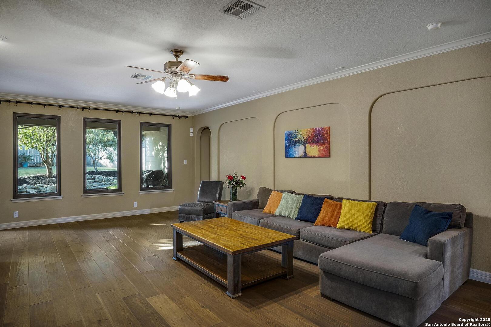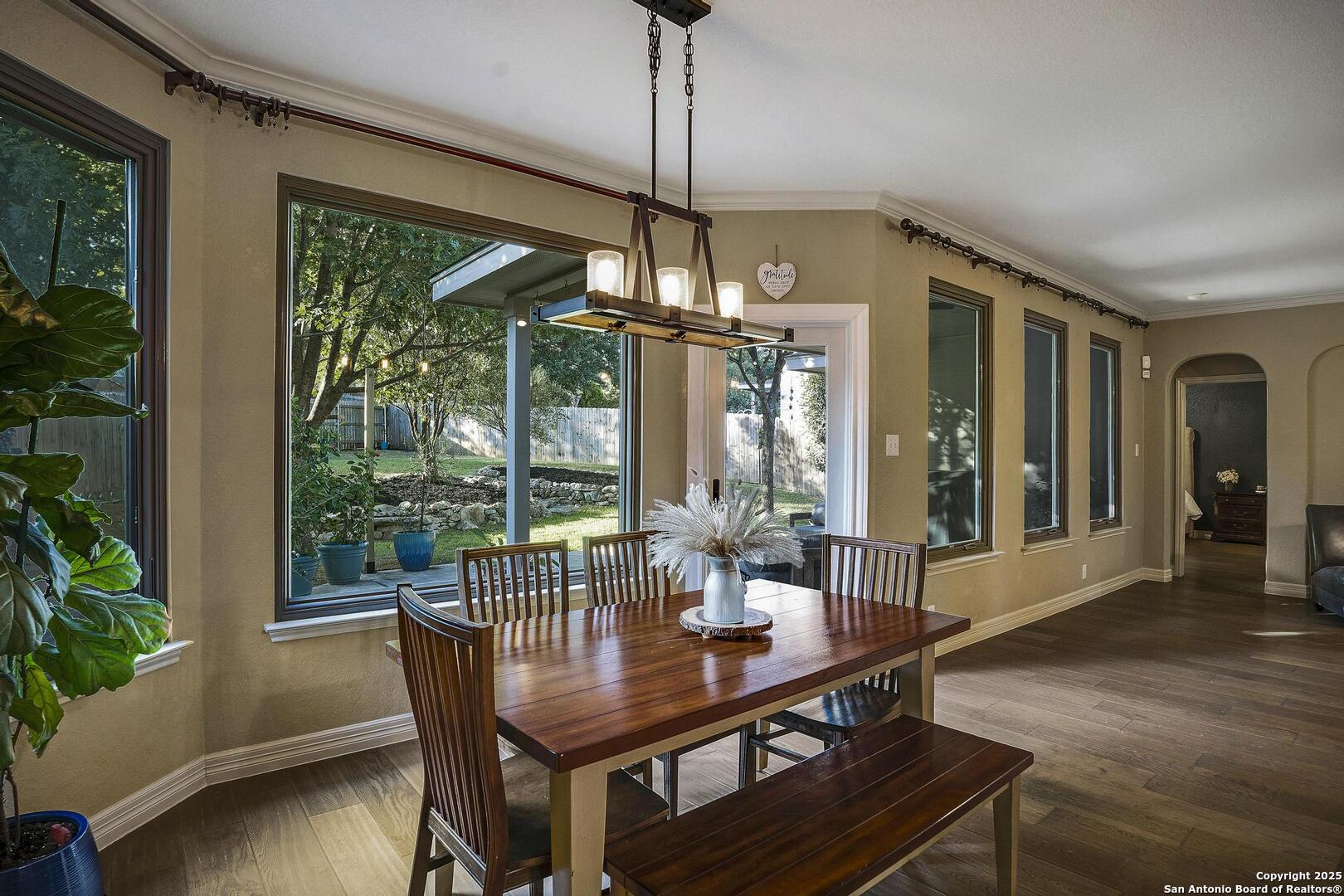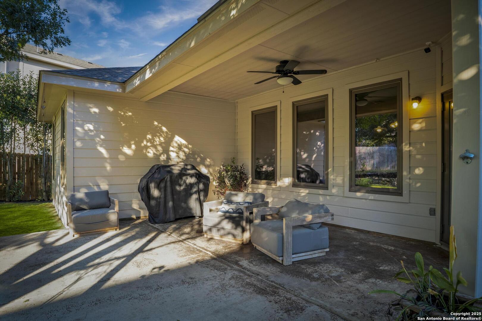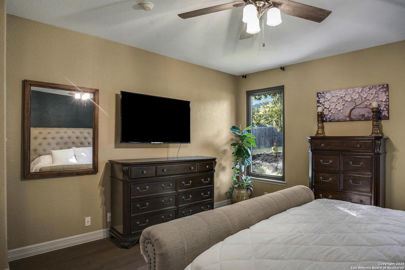 Beautiful one story , 3 bed 2 bath home in Mission Hills Ranch. Location is close to Boerne and Austin with a feeling of Hill country! Owner did a beautiful job choosing windows in the living area to bring the outside in! Walking in the Foyer welcomes you to an open spacious living area with a wood burning Stone Fireplace. Right off the living area you have a separate dining room and also an eat in Kitchen space. Kitchen has new flooring as of 2025,solid counter tops,two tone cabinets, new lighting as of 2025 , Refrigerator, range and Microwave , plenty of light and bright space to cook. There is a laundry room just off the kitchen. Large Split Masterbedroom overlooking the backyard, has a separate garden tub and Shower, new flooring as of 2025 with large walk in closet. 2 large bedrooms and full bath with new flooring complete the inside and then you have your backyard to enjoy! Large Covered Patio to enjoy the professionaly landscaped yard. Come see this well designed home and make it your new home.