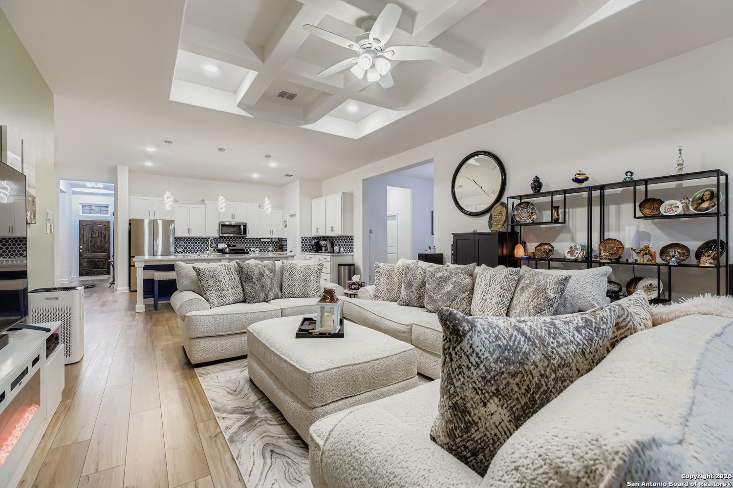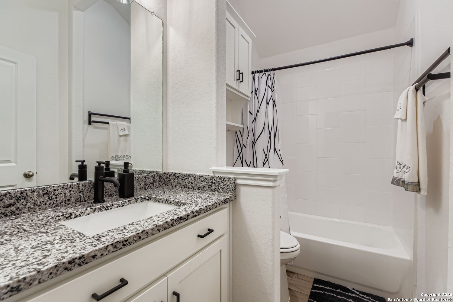 Nearly brand new home still covered under the builder warranty! One story home in the Texas Hill Country with 1 minute access to Hwy 281. This thoughtfully designed layout offers 3 bedrooms, 2.5 baths, plus two studies/flex spaces, ideal for modern living. Features include 10-foot ceilings, coffered ceiling in the living room, board and batten accent walls, custom lighting, and solar windows with one way viewing for maximum privacy. The stunning kitchen is built for entertaining with a massive island, gas cooking, walk in pantry, and seamless flow to the living and dining areas. Additional highlights include a mudset walk in shower, custom window shades, extra insulation, drop zone off the 3 car garage, and abundant storage. Low-maintenance xeriscape landscaping front and back, a covered patio, and a modern storage shed complete this exceptional home efficient, private, and impeccably maintained & upgraded.