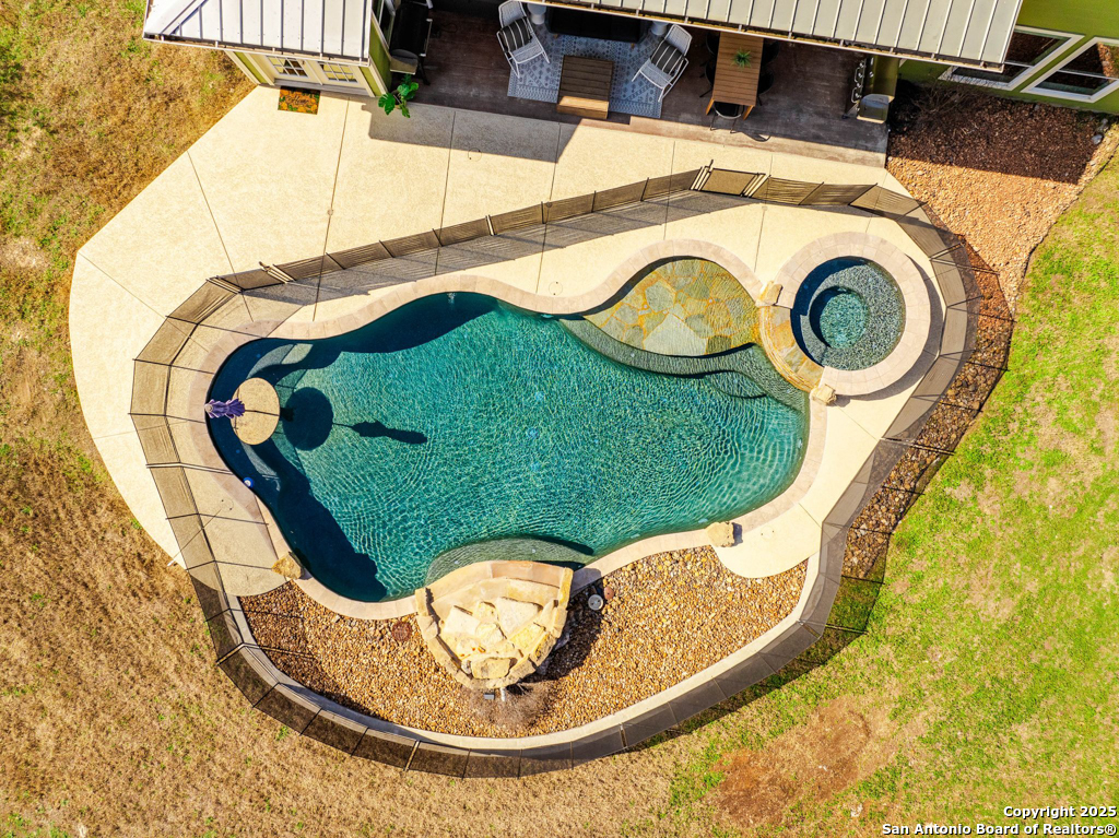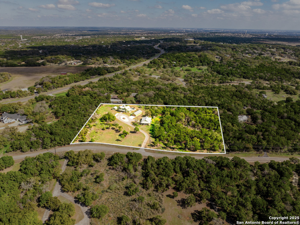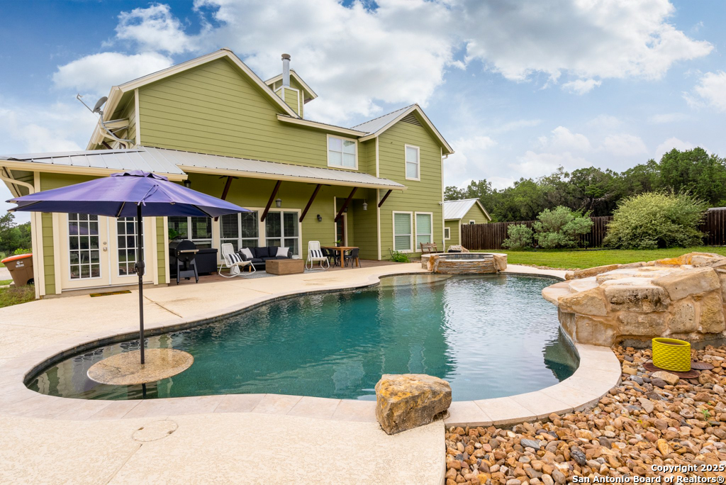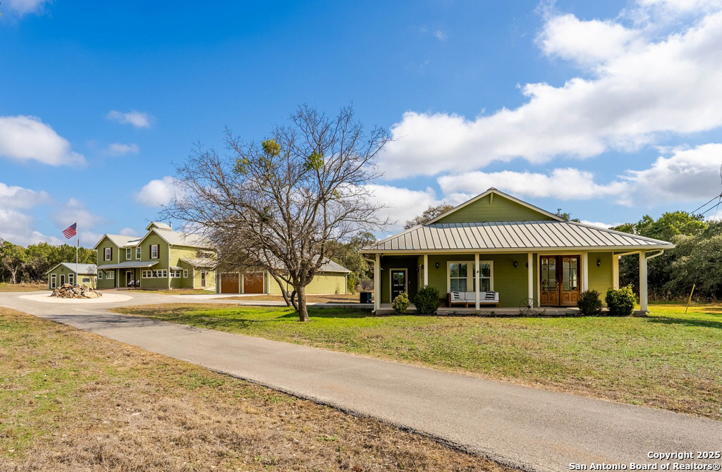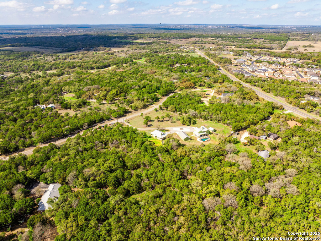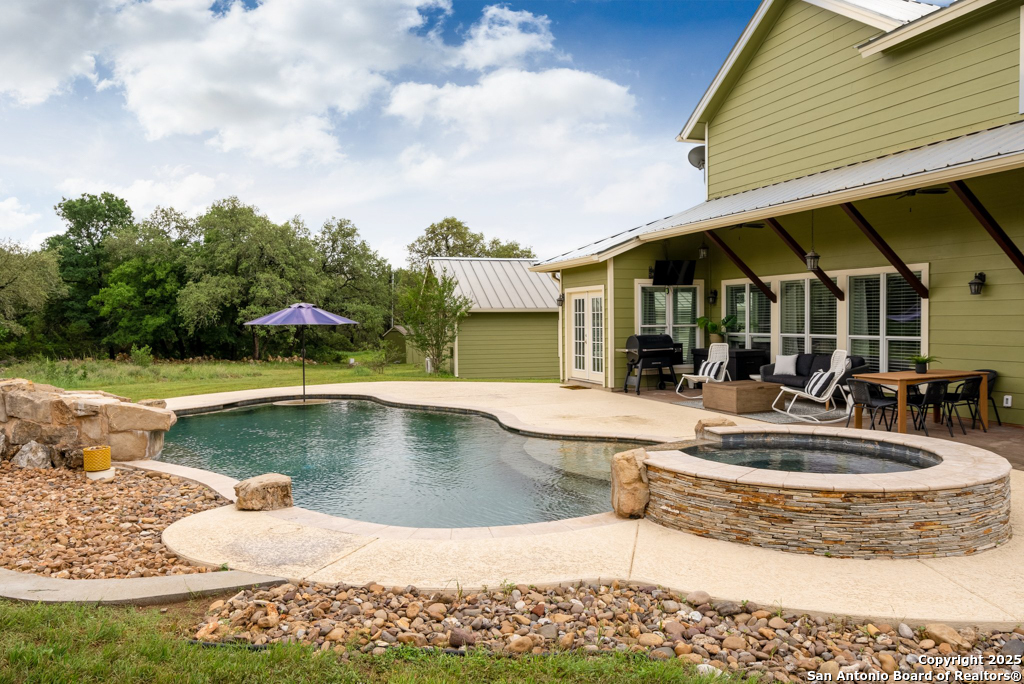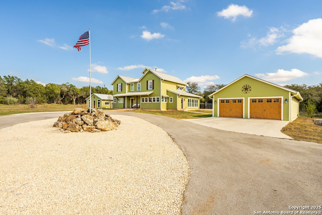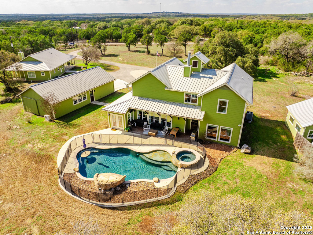 Discover luxury country living on this wooded 5-acre estate in the New Braunfels hill country, featuring two distinct homes offering incredible versatility for multi-generational living or a smart investment strategy. This unique property comprises a main residence and a separate guest cottage.The main residence, a light-filled 2,688 sq ft contemporary Craftsman, provides the primary living space with 4 bedrooms and 2.5 baths and boasts soaring cathedral ceilings and premium finishes throughout. The detached guest cottage, a charming 1,516 sq ft single-story dwelling that was recently remodeled, offers a completely separate living space with 2 bedrooms and 2 baths, and a welcoming modern design. This cottage is currently a successful short-term rental, having grossed over $110K in its first two years, presenting a fantastic income opportunity that can contribute significantly to your dream lifestyle! Unwind poolside or entertain guests with the resort-style PebbleTec pool and spa, complete with a built-in table and umbrella, Baja shelf, and waterfall. The property boasts a 1,179 sq. ft. climate-controlled garage, large enough for four cars, a workshop, a quiet home office, or the ultimate game room. Both homes feature high-end amenities including gas fireplaces, tankless water heaters, energy-efficient heat pumps, and granite countertops. Enjoy complete privacy and self-sufficiency with a private well (goodbye, water bills!), two subterranean propane tanks, and a custom, oversized aerobic septic system. Just outside city limits but minutes from downtown, this acreage property offers the perfect blend of country tranquility and city accessibility. Nowhere else will you find five unrestricted acres this close to town, so schedule a private tour today to experience this once-in-a-lifetime opportunity before it's gone.