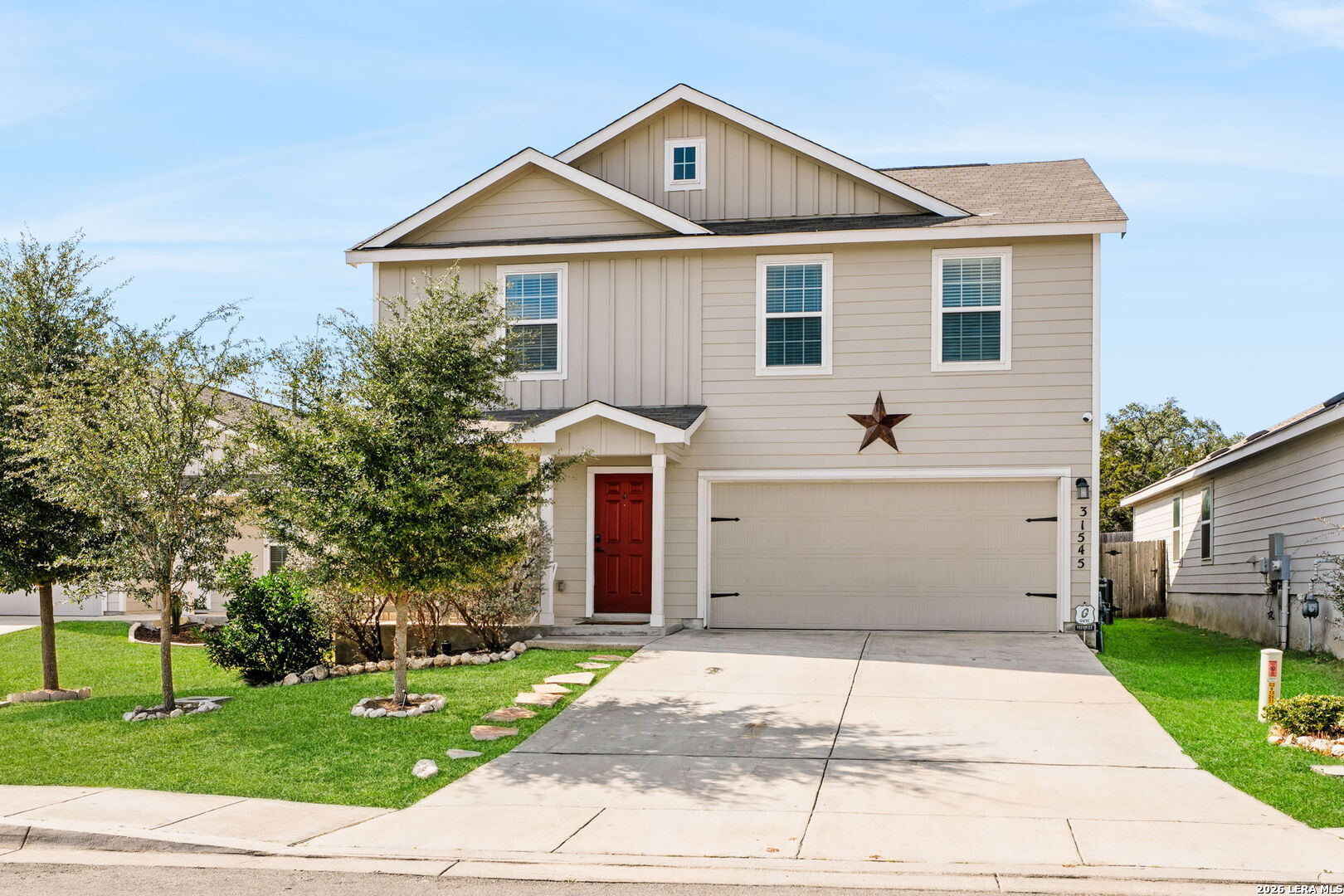 Welcome to 31545 Nimbus Drive, located in Hidden Trails. This well kept 4 bedroom 3 1/2 bath home is situated on a quiet cul-de-sac street & backs up to a green belt. Features include granite counter tops, stainless steel appliances, down stairs primary suite, & large, covered back porch. Upstairs bonus room can be used as a home office, media room or play room. Neighborhood amenities include a gym with 24 hr resident access, two swimming pools, playgrounds and a catch & release fishing pond. Convenient to Hwy 281 and 46 and is located within Comal ISD.
