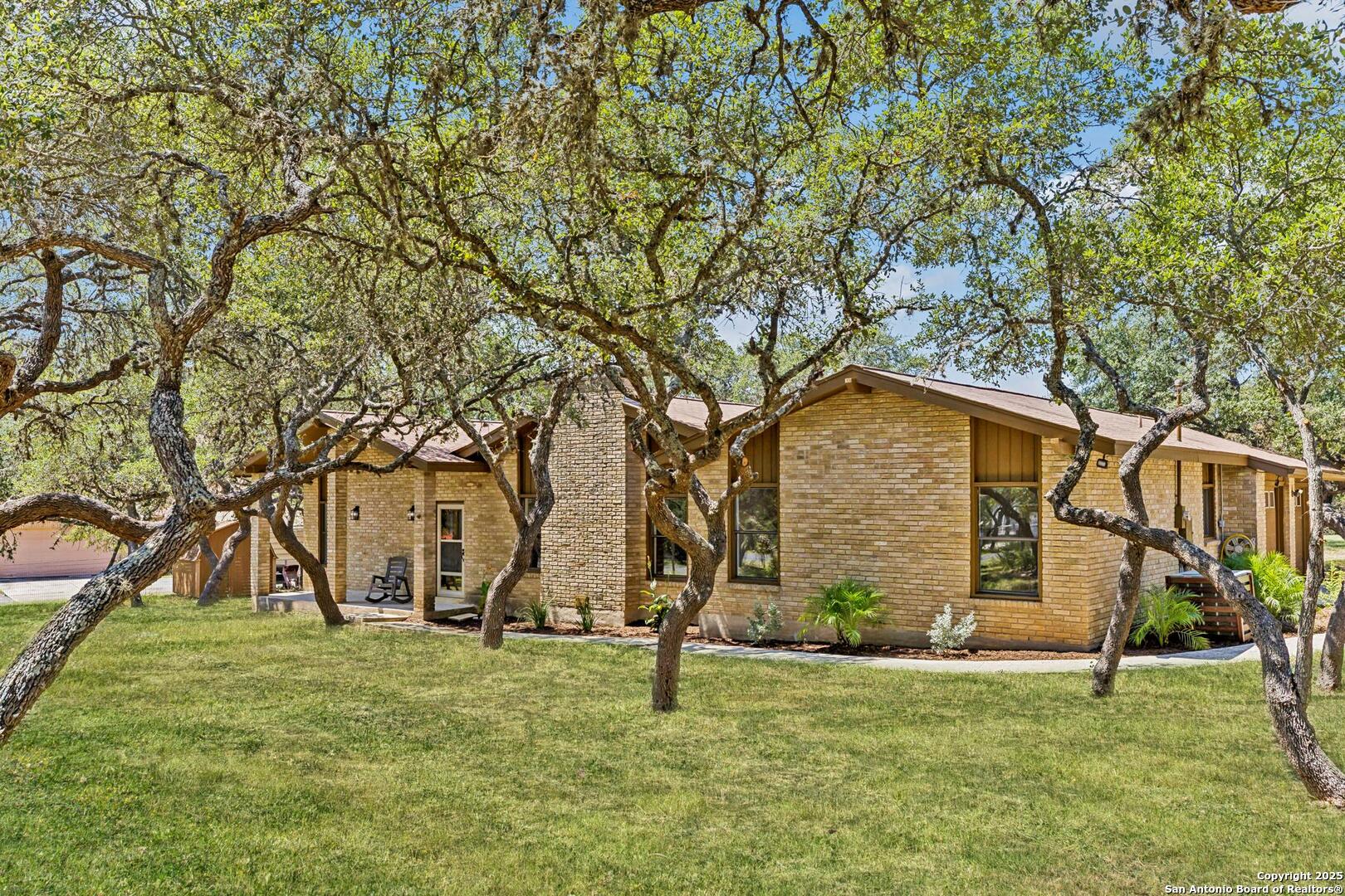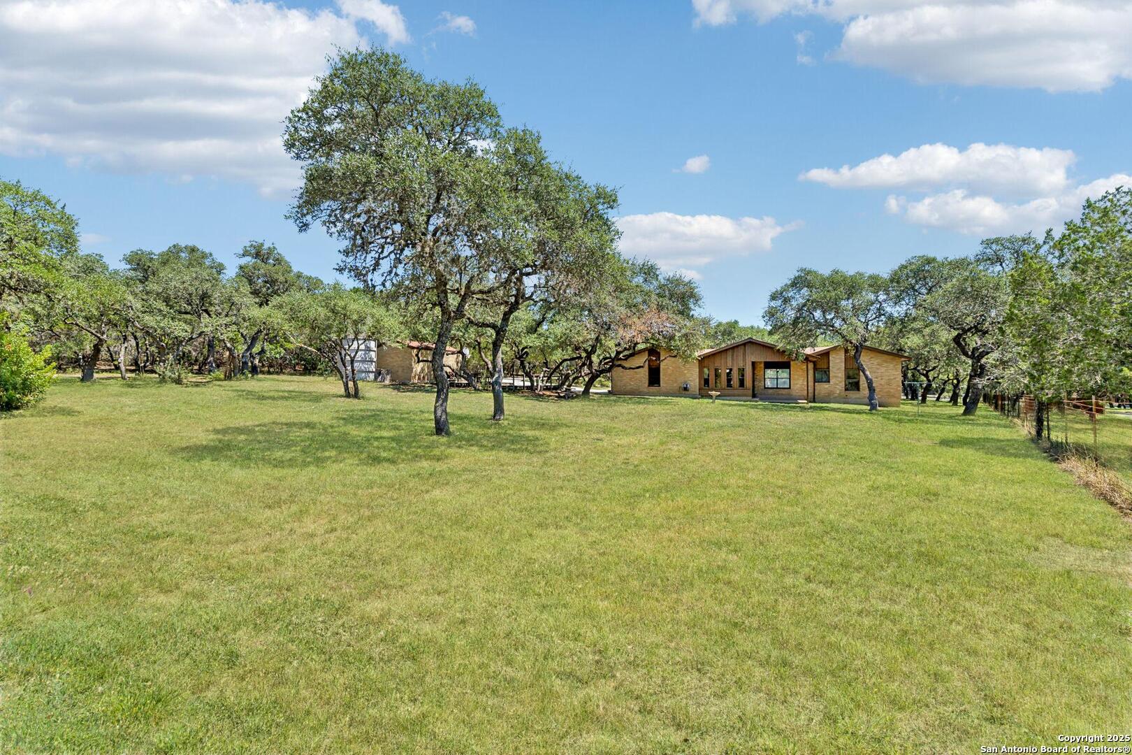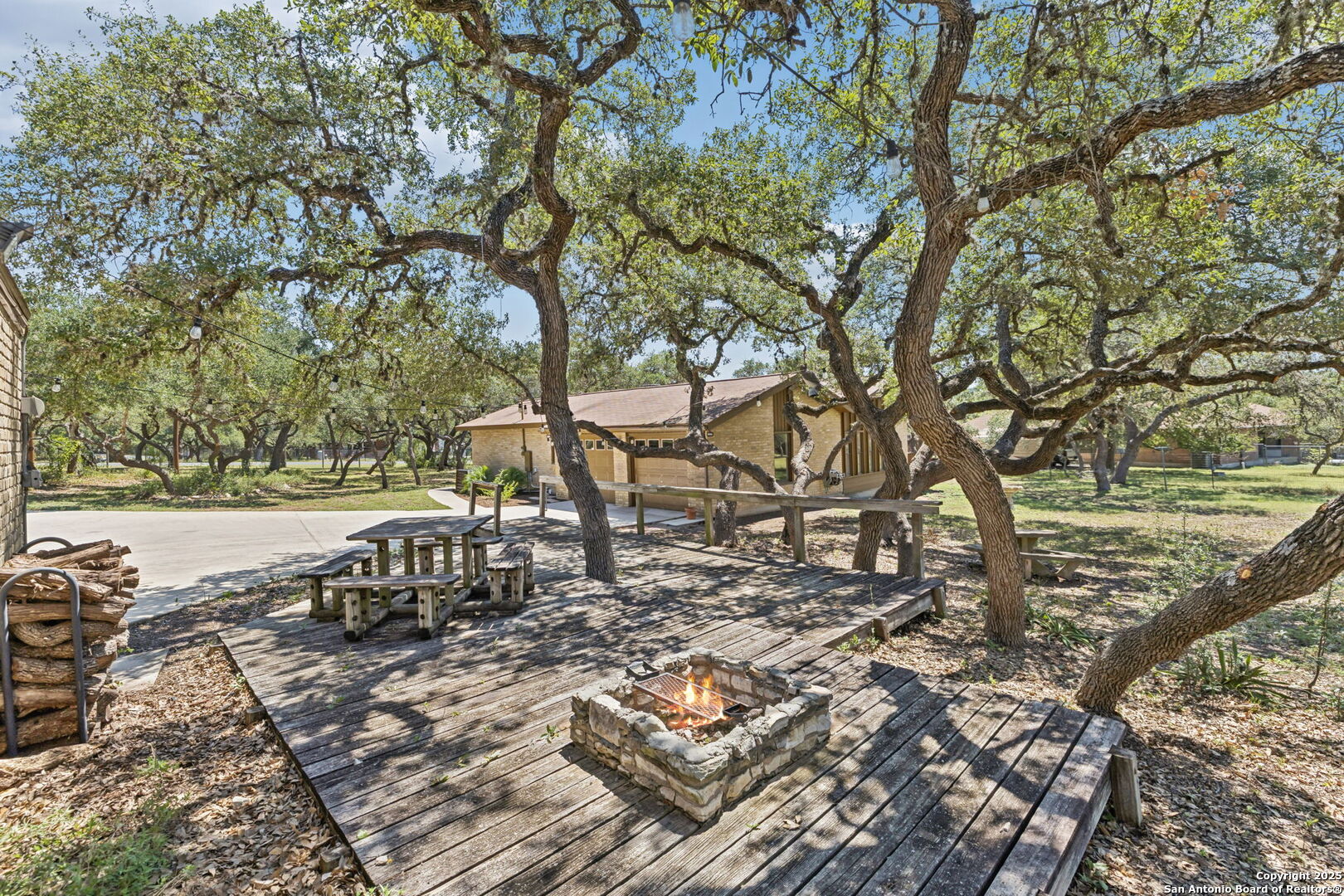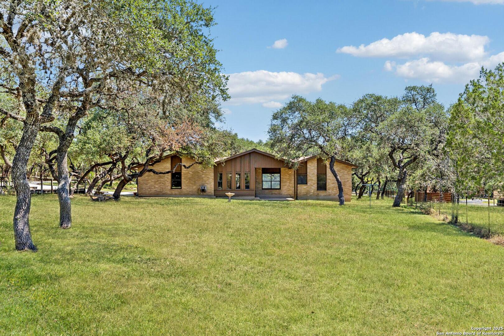 Your private Texas oasis awaits-1.14 acres of fenced, gated serenity dotted with over 70 majestic oak trees. Room to build your dream workshop, a pool, or create the ultimate outdoor playground. A private well with a 5-ring cistern delivers top-quality water, so you're set for whatever comes next. Step outside onto the expansive deck with fire pit and ambient lighting-perfect for sunset drinks, starry nights, or weekend gatherings. The level lot, concrete driveway, and outdoor spaces are ready for action, entertaining, and creating memories. Inside, vaulted beamed ceilings and a brick wood-burning fireplace give the living area a warm, airy, and welcoming vibe. The kitchen is built to impress: massive granite island, built-in appliances, smooth cooktop with vent hood, soft-close cabinetry, and a walk-in pantry. Sunlit breakfast area opens to the outdoors, while a flexible space can serve as formal dining, office, or game zone. Two bright secondary bedrooms, a spacious owner's suite with en suite bath and walk-in closet, and a climate-controlled utility room make this home functional and comfortable. All of this with easy access to Hwy 46 & 281-versatile, private, and ready for your Texas lifestyle.