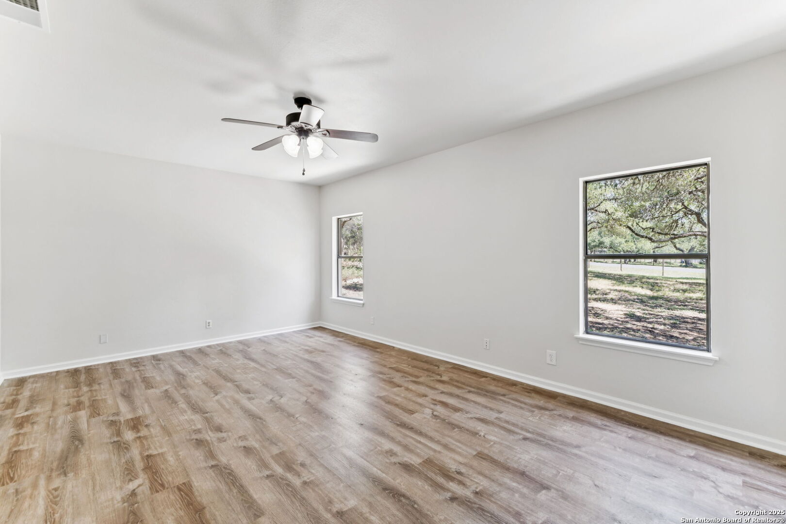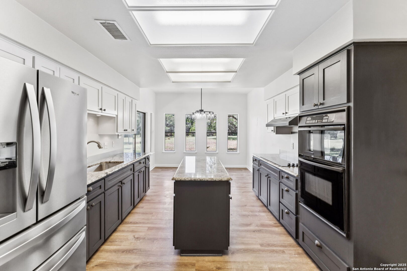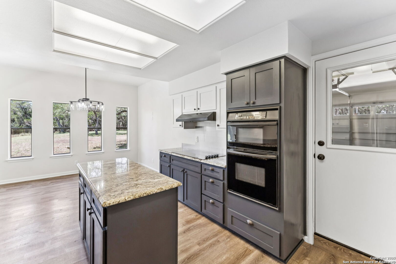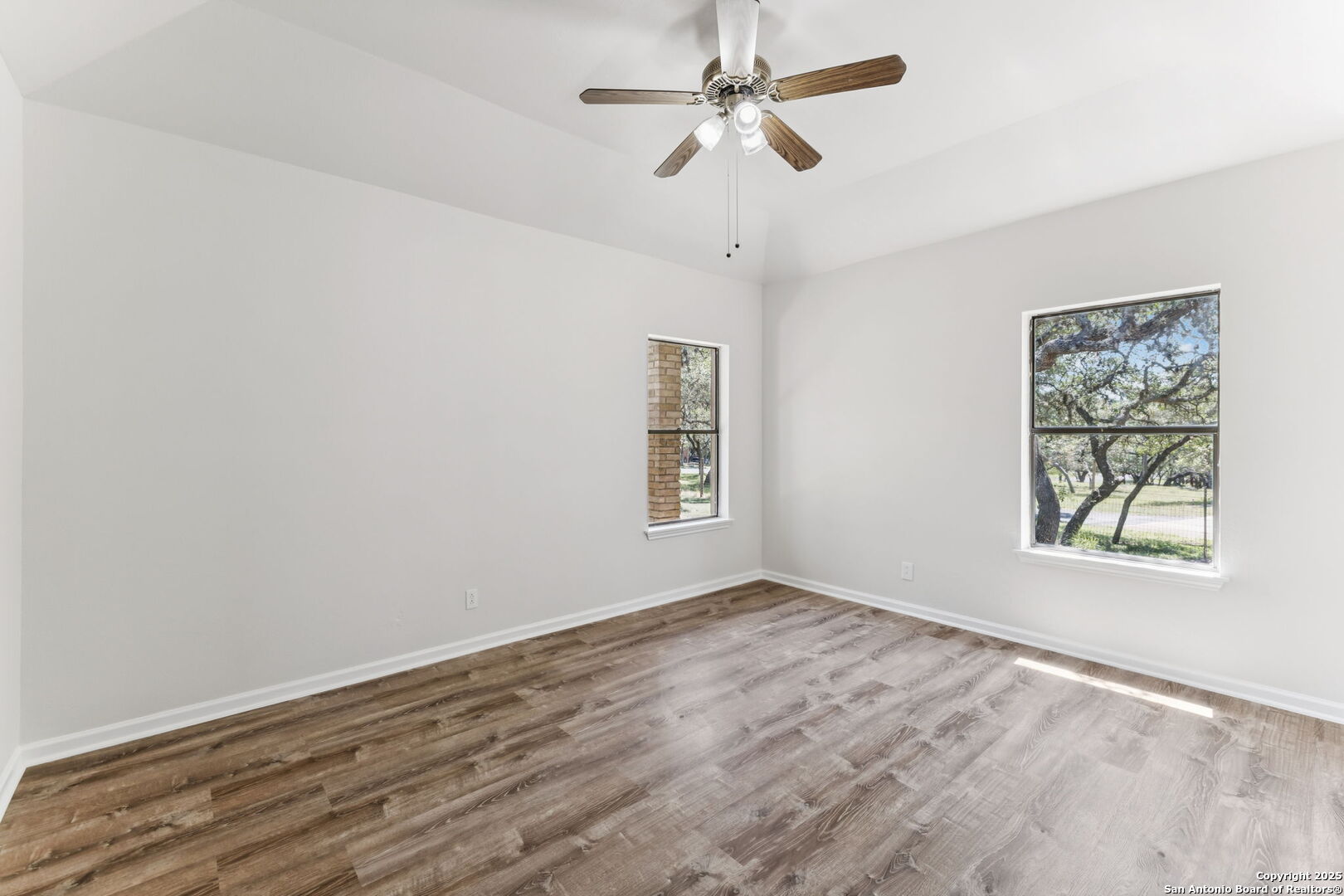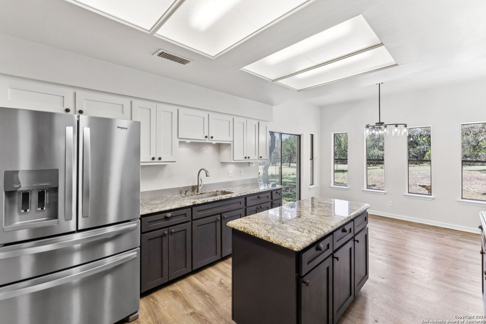 Your private Texas oasis awaits-1.14 acres of fenced, gated serenity dotted with over 70 majestic oak trees. Room to build your dream workshop, a pool, or create the ultimate outdoor playground. A private well with a 5-ring cistern delivers top-quality water, so you're set for whatever comes next. Step outside onto the expansive deck with fire pit and ambient lighting-perfect for sunset drinks, starry nights, or weekend gatherings. The level lot, concrete driveway, and outdoor spaces are ready for action, entertaining, and creating memories. Inside, vaulted beamed ceilings and a brick wood-burning fireplace give the living area a warm, airy, and welcoming vibe. The kitchen is built to impress: massive granite island, built-in appliances, smooth cooktop with vent hood, soft-close cabinetry, and a walk-in pantry. Sunlit breakfast area opens to the outdoors, while a flexible space can serve as formal dining, office, or game zone. Two bright secondary bedrooms, a spacious owner's suite with en suite bath and walk-in closet, and a climate-controlled utility room make this home functional and comfortable. All of this with easy access to Hwy 46 & 281-versatile, private, and ready for your Texas lifestyle.