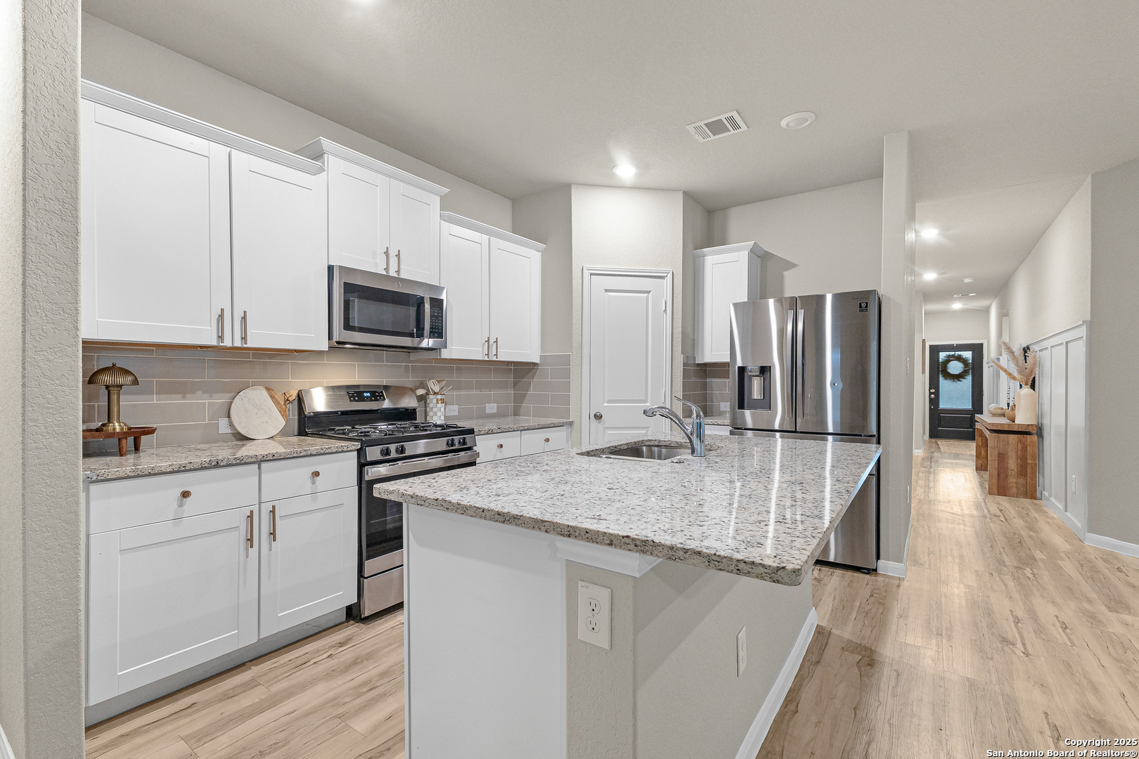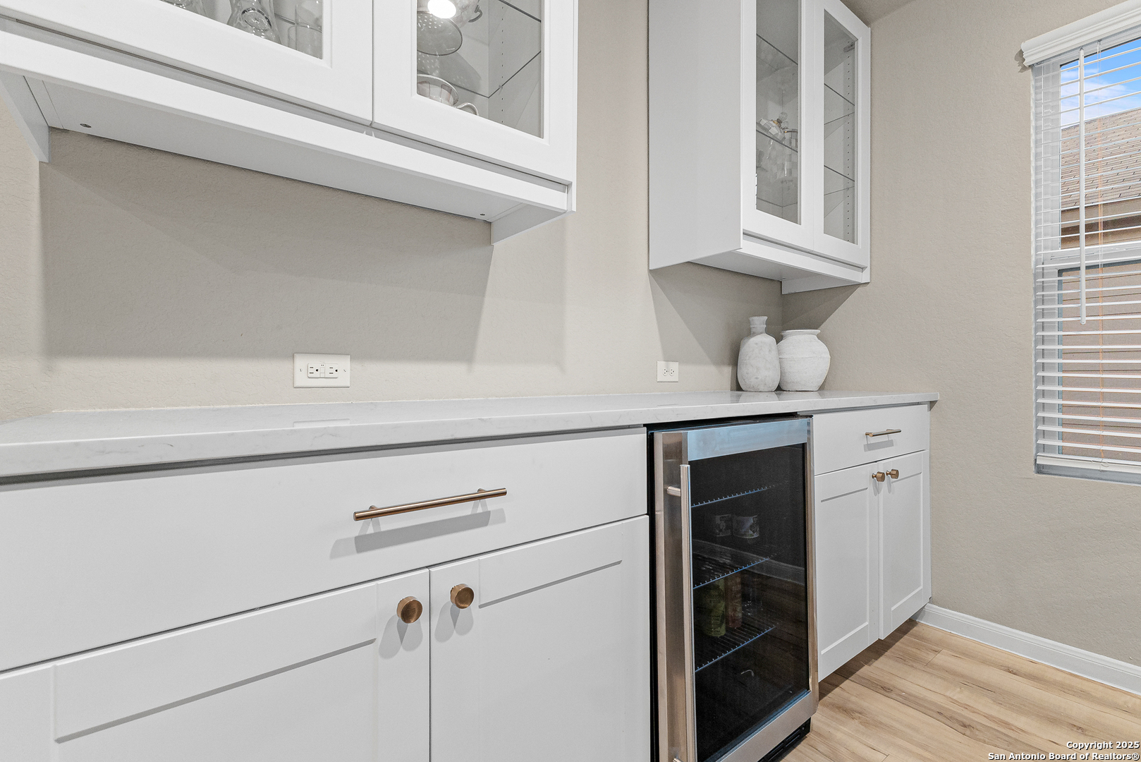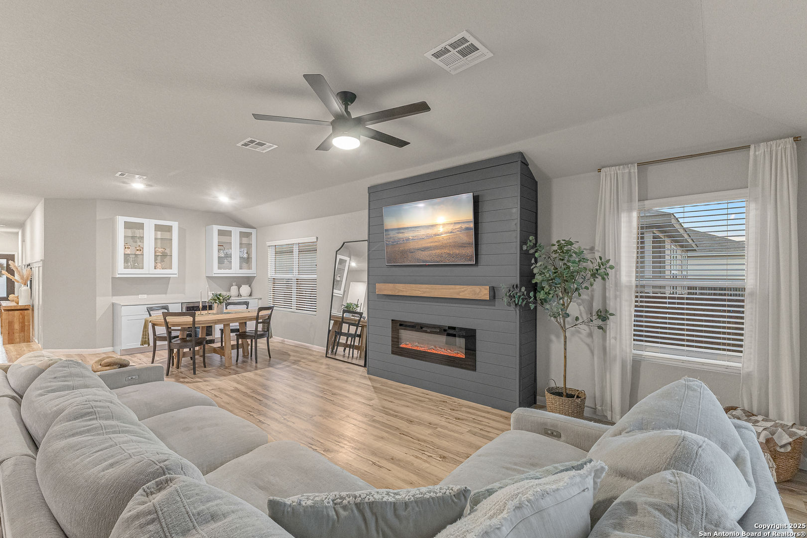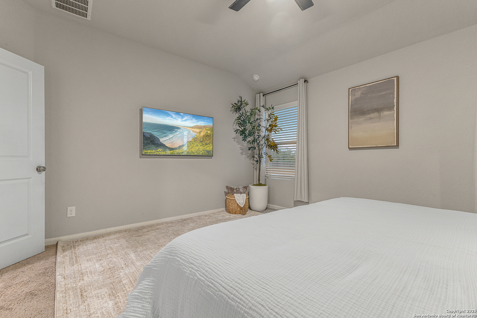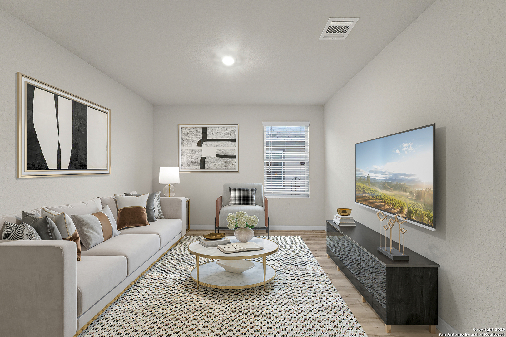 Beautiful 4-bedroom, 2-bath home with a 2-car garage situated on an oversized lot. The inviting front porch opens into a thoughtfully designed floor plan that seamlessly blends comfort and functionality. This home offers two spacious living rooms, providing flexibility for entertainment, work, or relaxation. The kitchen features gas cooking, granite countertops, a generous breakfast bar, and a spacious pantry-ideal for everyday living and hosting. A custom wine bar adds a sophisticated touch and enhances the home's entertainment appeal. Throughout the residence, you'll find upgraded ceiling fans, well-proportioned bedrooms, and excellent closet space. The primary suite is privately positioned away from the secondary bedrooms and includes dual vanities, a large walk-in shower, and an expansive walk-in closet. The backyard is truly exceptional, backing up to a greenbelt for added privacy, and offering a custom patio extension. Whether hosting gatherings or enjoying quiet evenings outdoors, this space provides endless versatility along with abundant yard space. Located in Comal ISD within the desirable Hidden Trails community, residents enjoy access to outstanding neighborhood amenities that elevate everyday living.