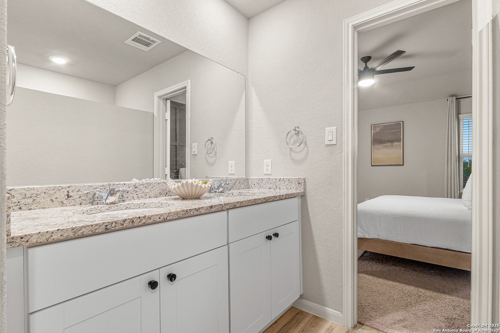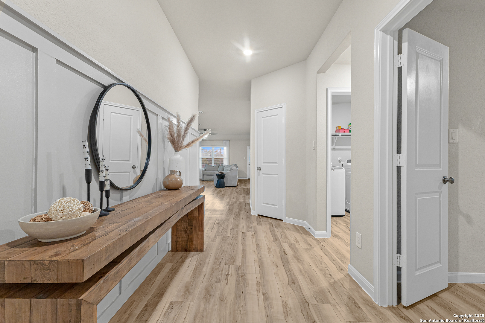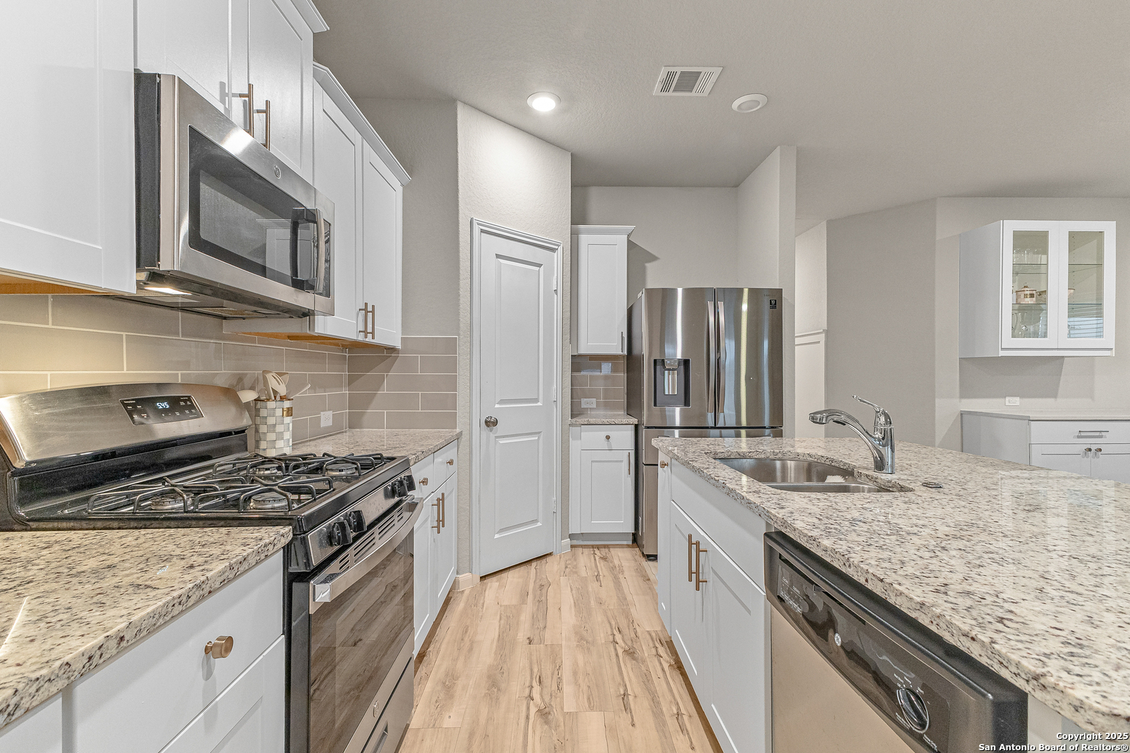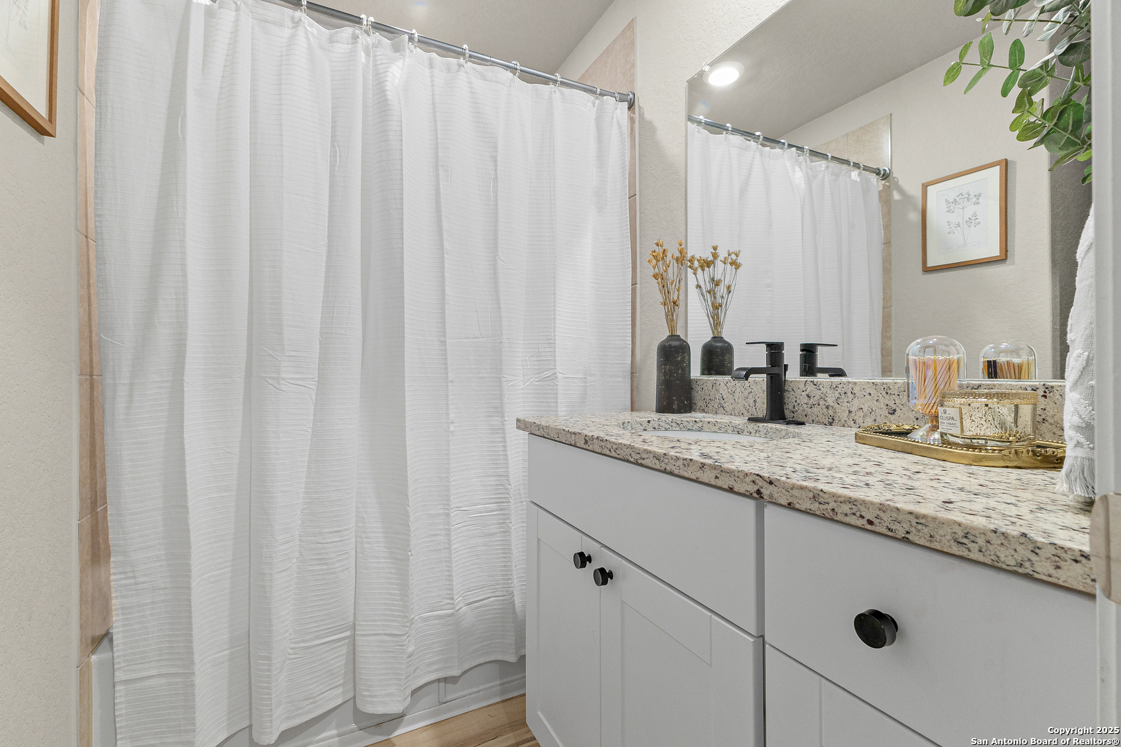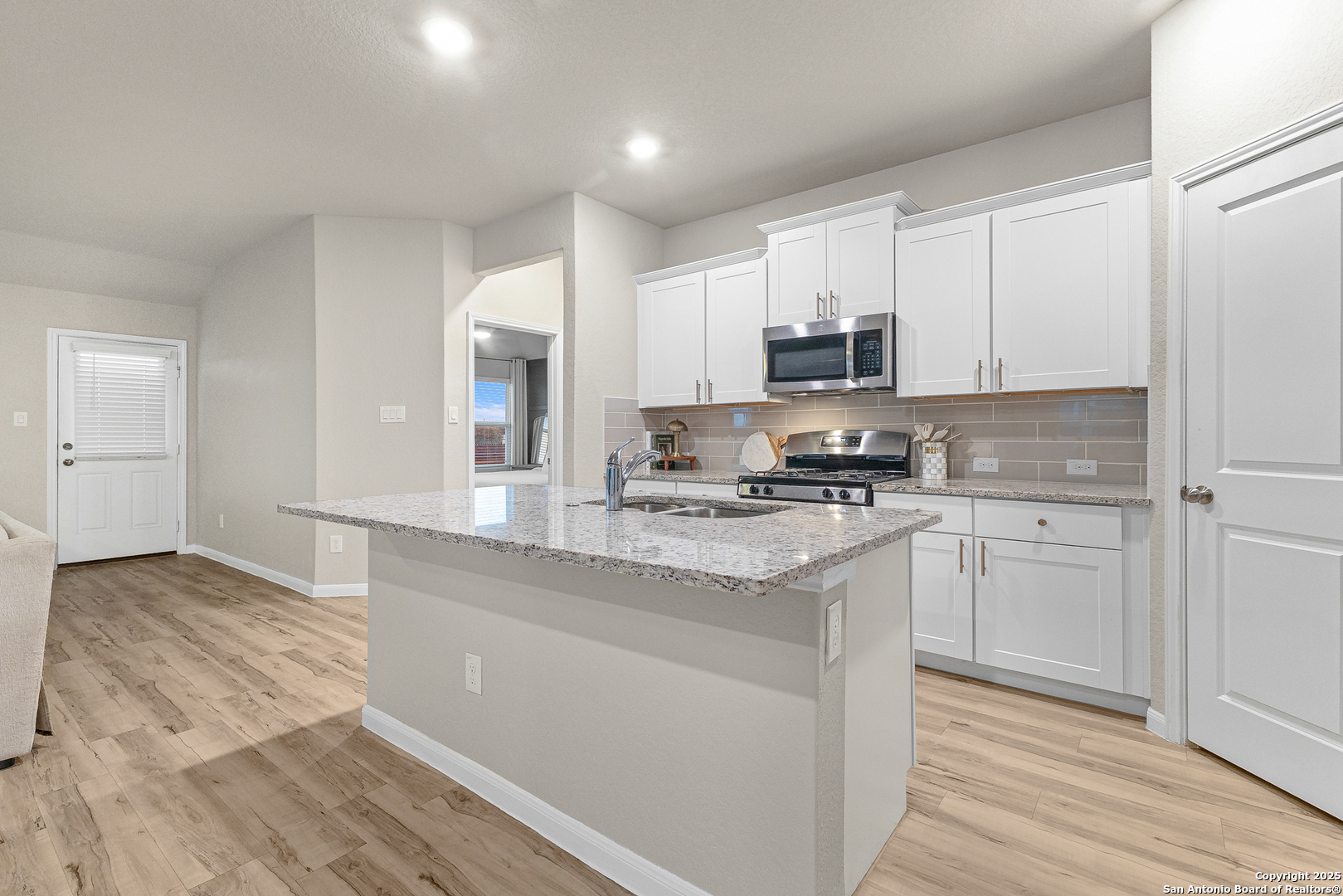 Beautiful 4-bedroom, 2-bath home with a 2-car garage situated on an oversized lot. The inviting front porch opens into a thoughtfully designed floor plan that seamlessly blends comfort and functionality. This home offers two spacious living rooms, providing flexibility for entertainment, work, or relaxation. The kitchen features gas cooking, granite countertops, a generous breakfast bar, and a spacious pantry-ideal for everyday living and hosting. A custom wine bar adds a sophisticated touch and enhances the home's entertainment appeal. Throughout the residence, you'll find upgraded ceiling fans, well-proportioned bedrooms, and excellent closet space. The primary suite is privately positioned away from the secondary bedrooms and includes dual vanities, a large walk-in shower, and an expansive walk-in closet. The backyard is truly exceptional, backing up to a greenbelt for added privacy, and offering a custom patio extension. Whether hosting gatherings or enjoying quiet evenings outdoors, this space provides endless versatility along with abundant yard space. Located in Comal ISD within the desirable Hidden Trails community, residents enjoy access to outstanding neighborhood amenities that elevate everyday living.
