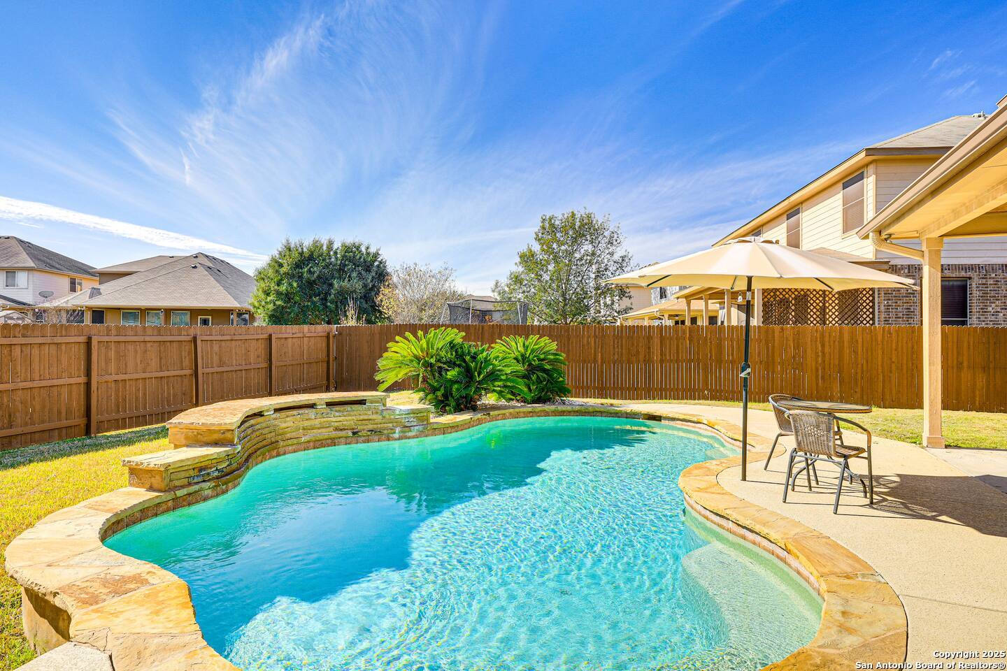 Experience Luxury Living in Cibolo! Discover comfort, style, and convenience in this beautiful 5-bedroom, 3-bath home located in the heart of Cibolo. This property comes fully furnished, allowing for a smooth and effortless move-in. Enjoy an open-concept floor plan filled with natural light, a modern kitchen with high-end finishes, and spacious living areas perfect for relaxing or entertaining. The primary suite offers a spa-like retreat, while a secondary bedroom on the main floor provides flexibility for guests, in-laws, or a private office. Step outside to your backyard oasis, featuring a sparkling pool, ample lounge space, and an ideal setting for outdoor dining or soaking up the Texas sun. Located in a quiet, well-maintained community with easy access to I-35, Randolph AFB, shopping, dining, and top-rated schools, this home perfectly blends luxury and convenience.