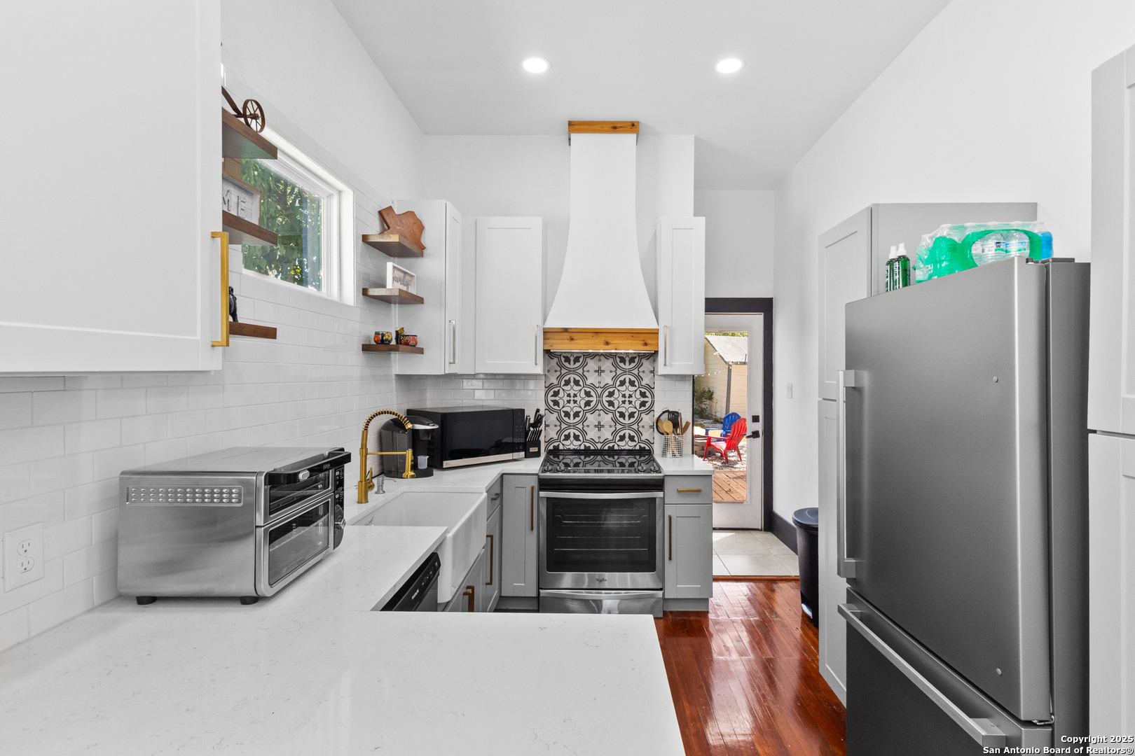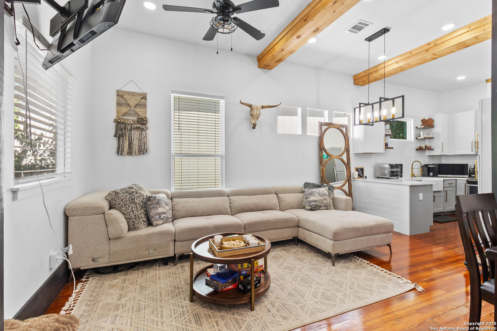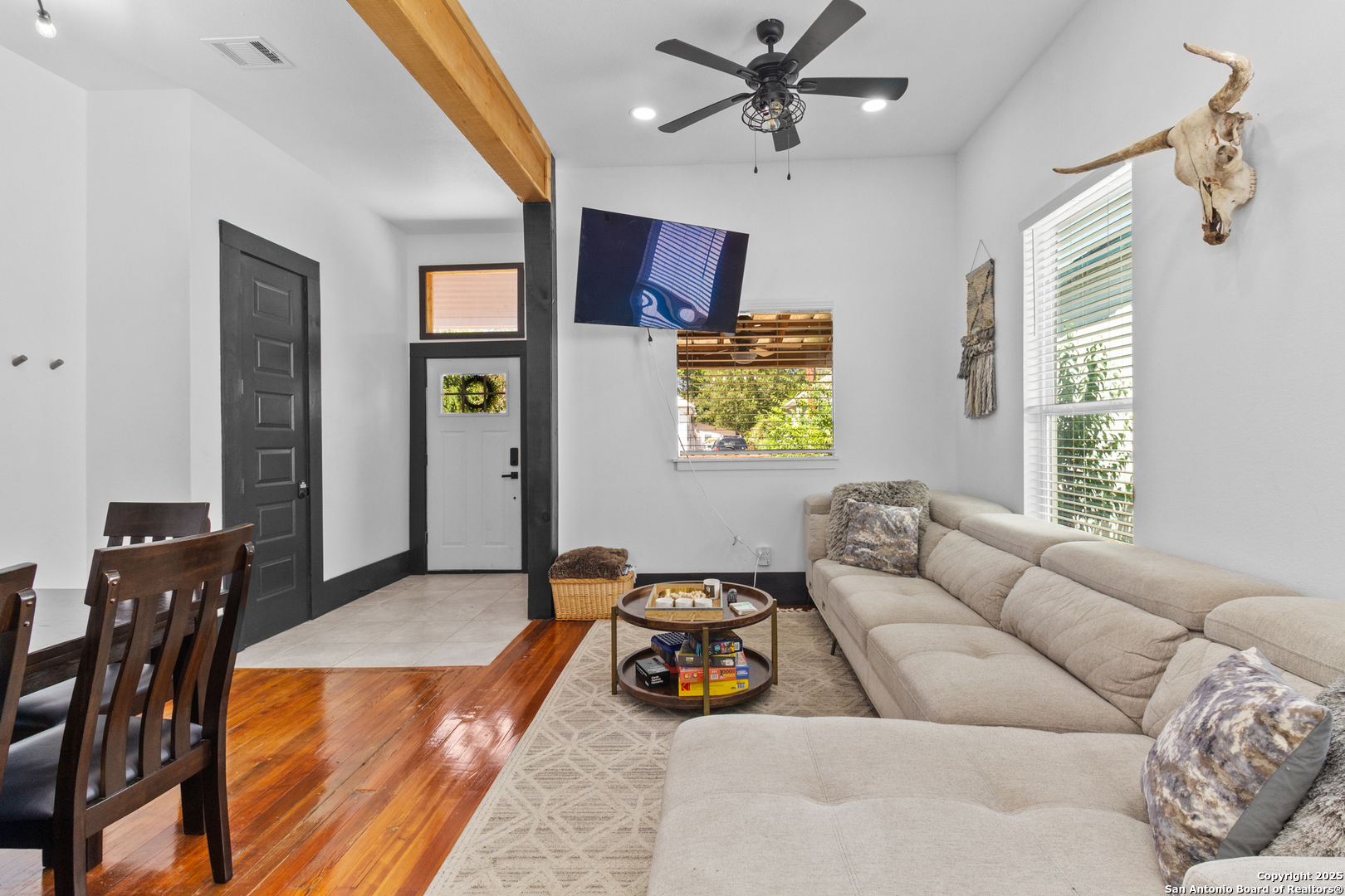 Step into a home that redefines modern living. From the moment you see the stunning new front porch and vibrant red door, you'll know you've found something special. This is where classic charm meets sleek, contemporary style. Inside, exposed wooden beams and rich wood floors create a warm, inviting atmosphere, while the renovated kitchen-with its beautiful farmhouse sink and bold backsplash-is a true showstopper. The updated bathrooms feature striking black-and-white tile that perfectly complements the fresh, clean aesthetic. The best part? The spacious backyard with a new deck, ready for summer barbecues and peaceful evenings under the stars.