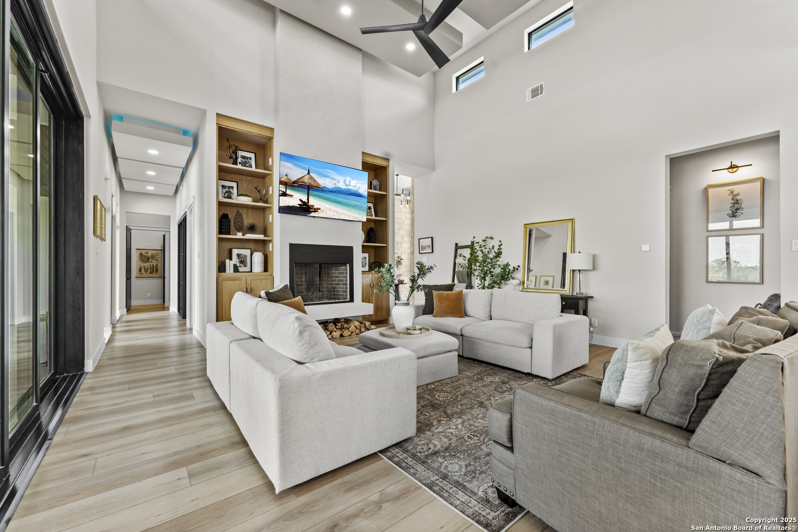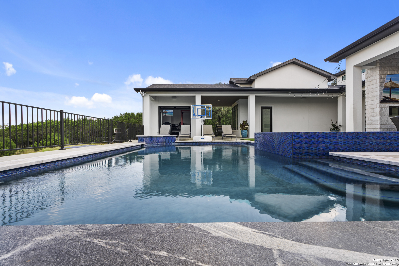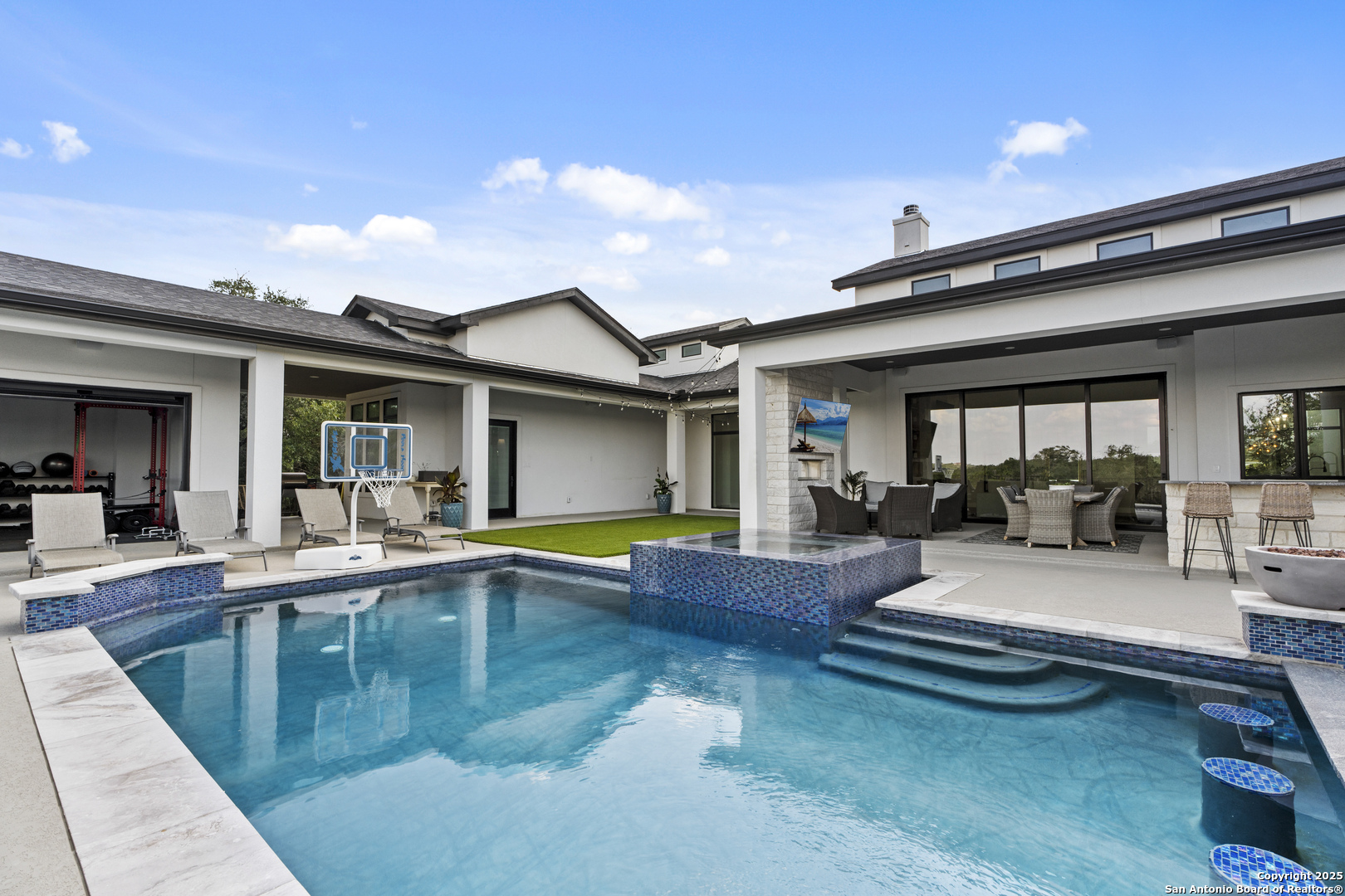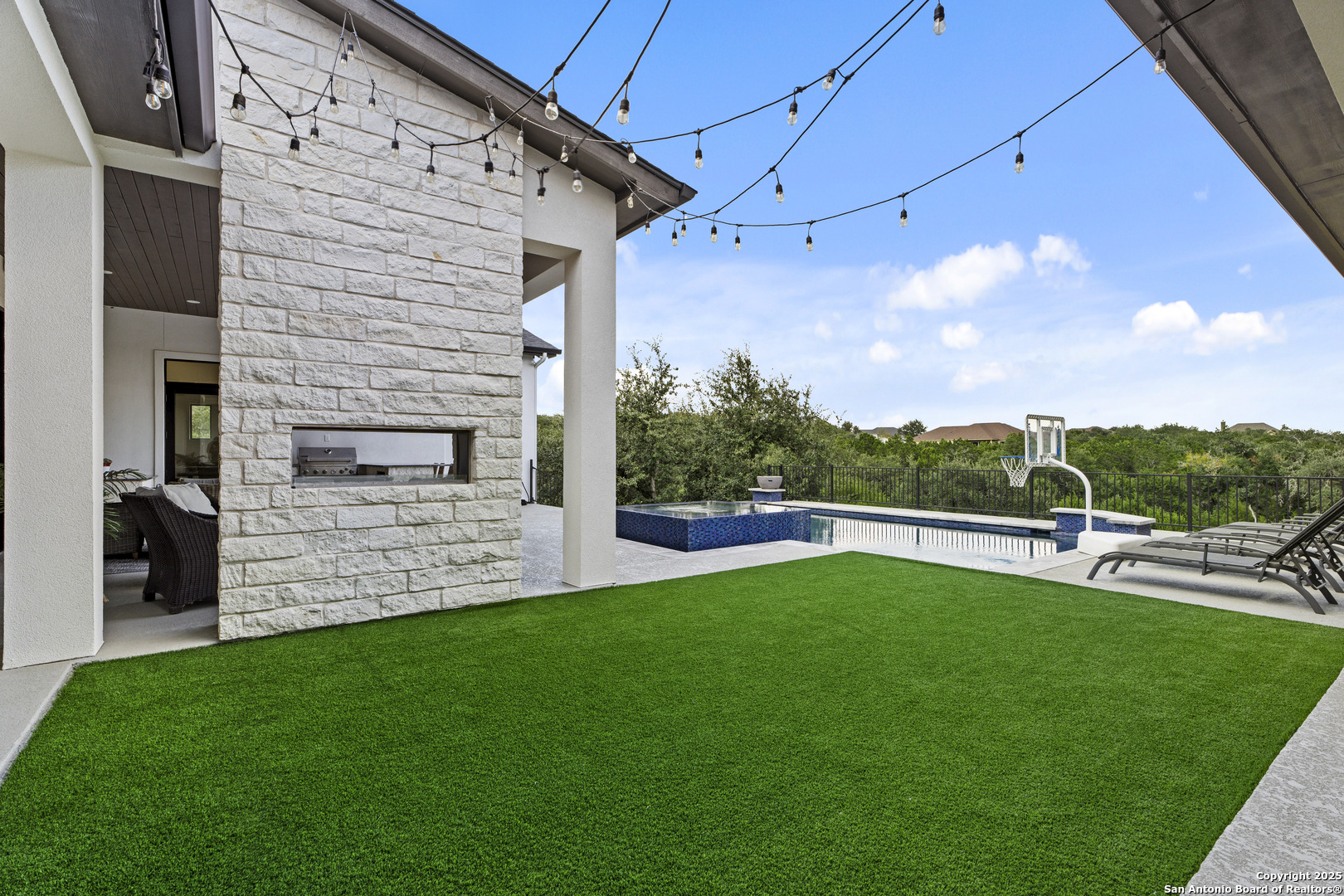 Welcome to 318 Upland Court in the sought-after Mountain Springs Ranch community. This exceptional home features 4 spacious bedrooms, 4.5 luxurious bathrooms, and a layout designed for both elegance and comfort. The front exterior makes a striking impression with a beautifully landscaped yard, wrap-around extended driveway, and 3-car garage. Step inside through a stone-accented entry into a grand foyer with soaring ceilings and expansive windows that fill the space with natural light. The open floor plan includes a custom kitchen with luxury cabinetry, a large waterfall island, abundant storage, and a sleek center fireplace, all complemented by unique accent walls and upscale finishes throughout the entire home. A private office with tall double doors offers a refined workspace, while the primary suite serves as a tranquil retreat with a spa-style bathroom, soaking tub, and oversized shower. The home also features a dedicated movie theater and media room, perfect for entertaining. Outside, enjoy a private backyard oasis complete with a built-in outdoor kitchen, low-maintenance turf, a basketball court, scenic views, and a luxury pool designed for both relaxation and entertaining. Located in a community with walking trails, a pool, park, playground, and BBQ areas, this home offers an elevated lifestyle with thoughtful details in every corner.