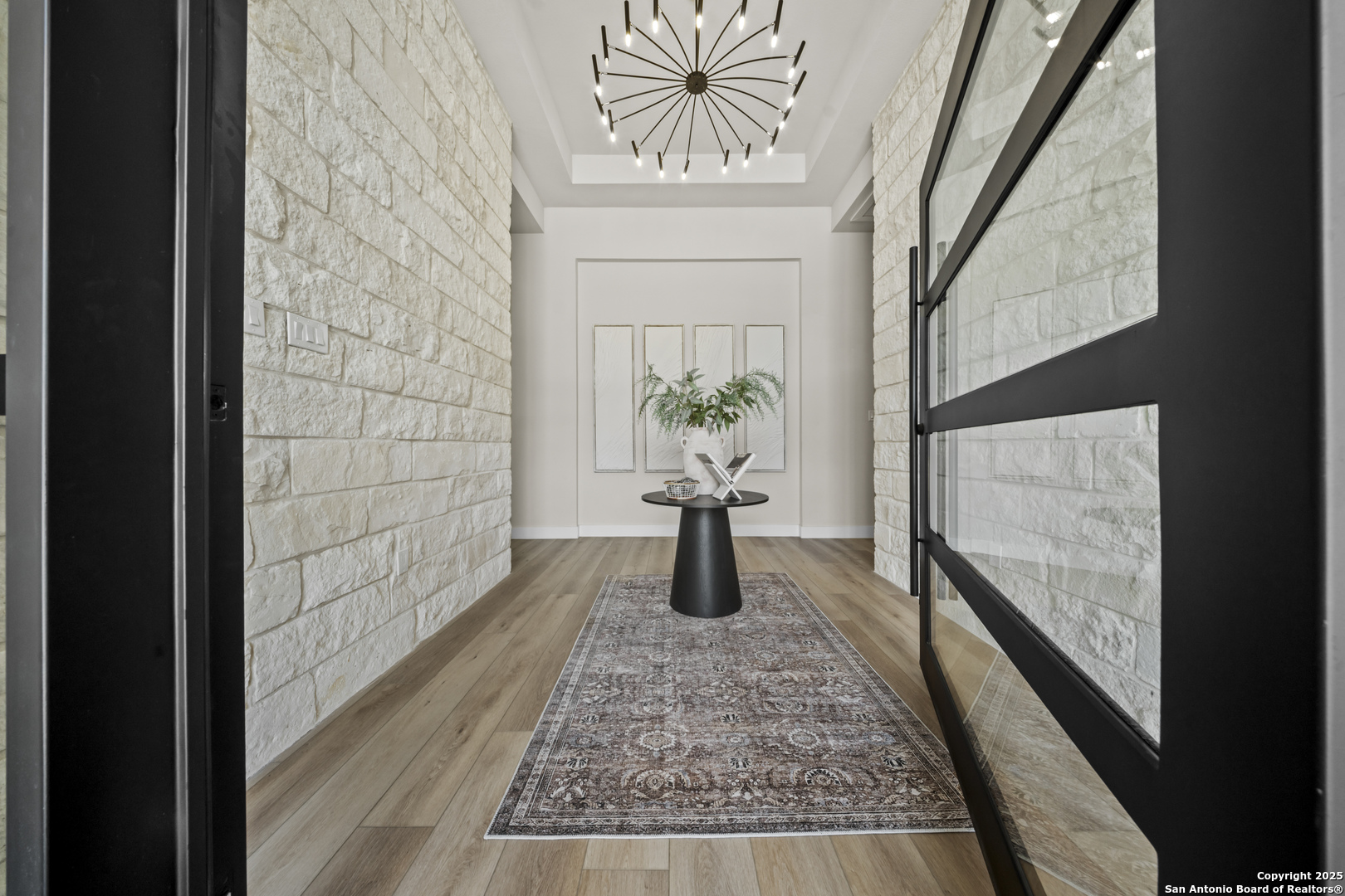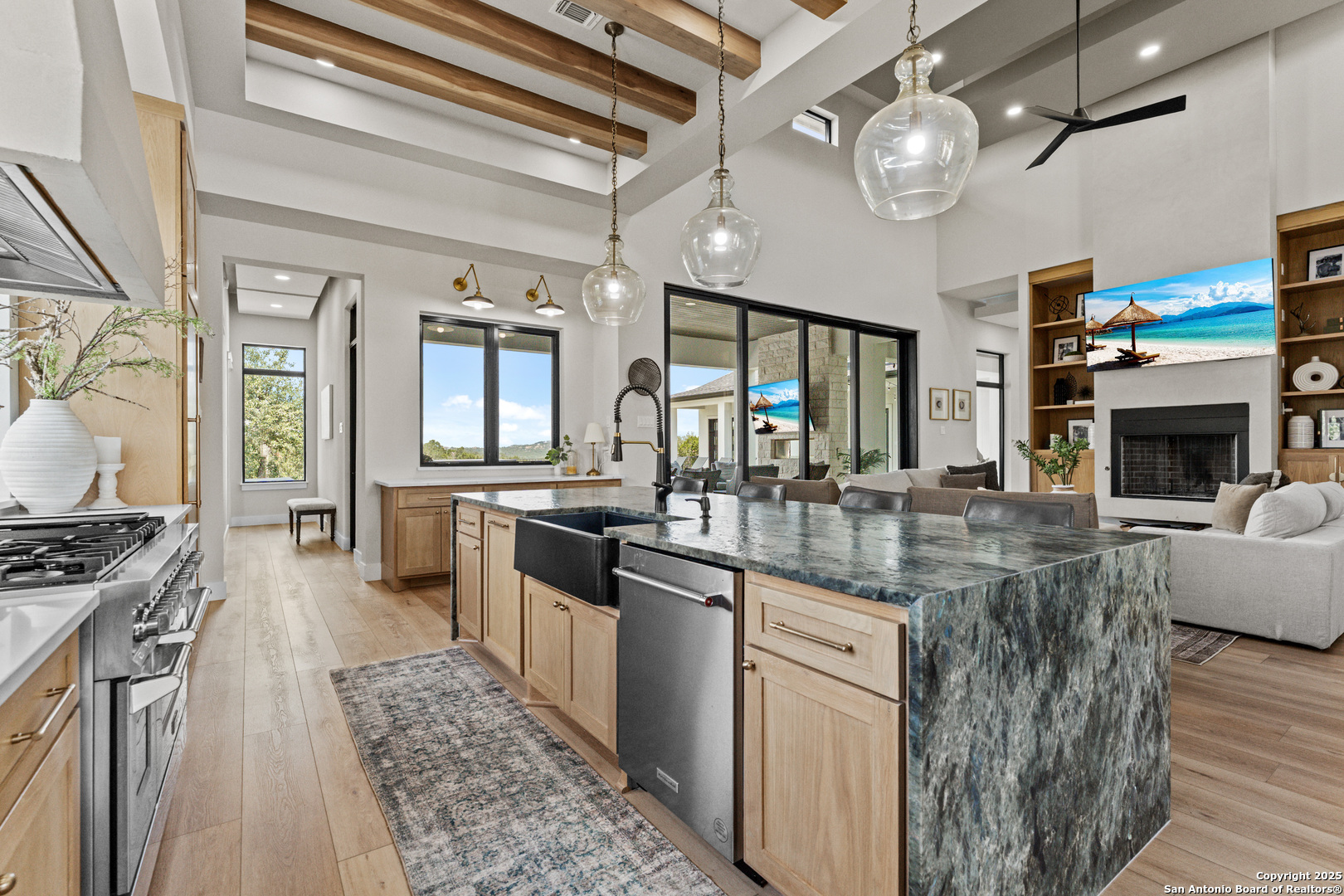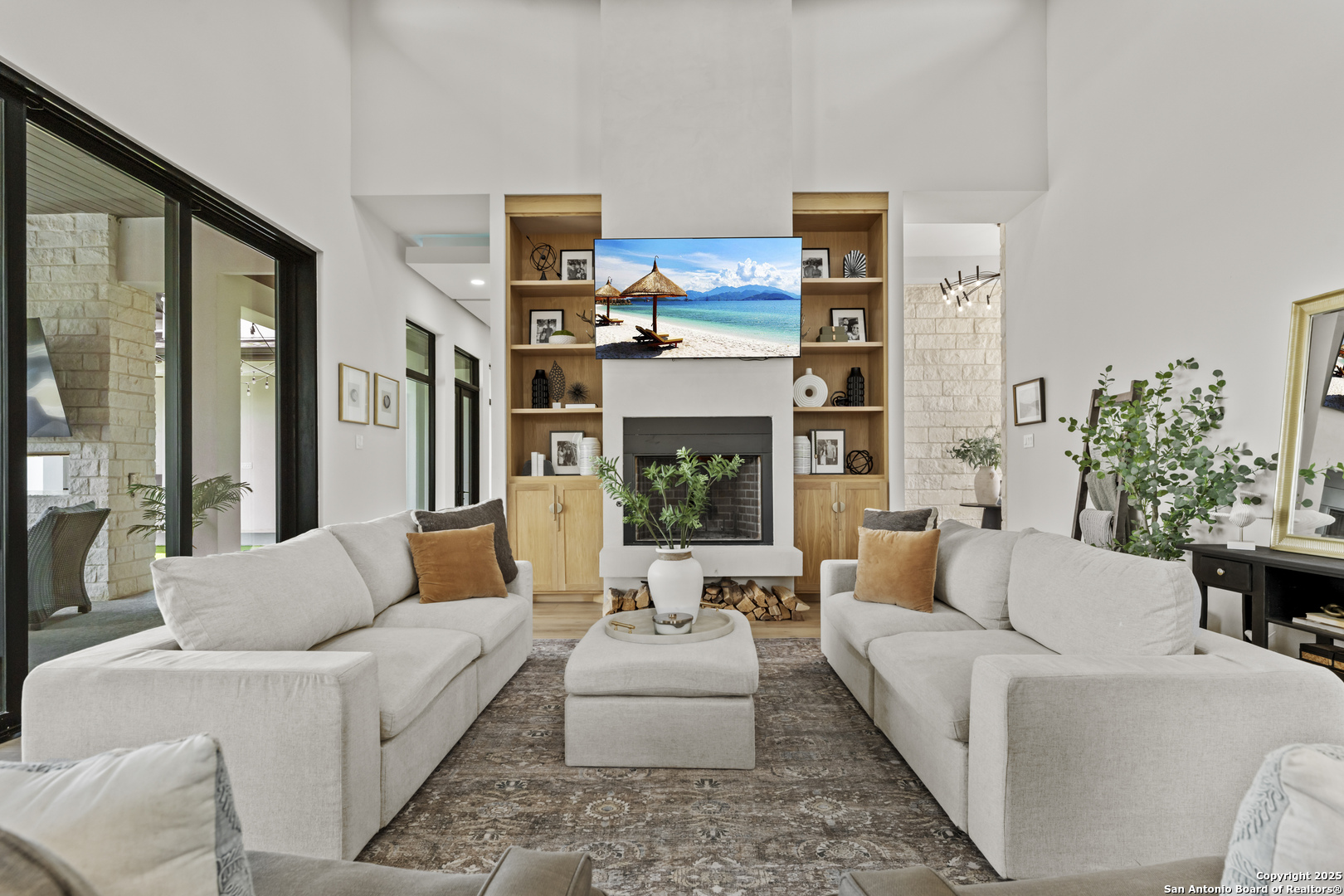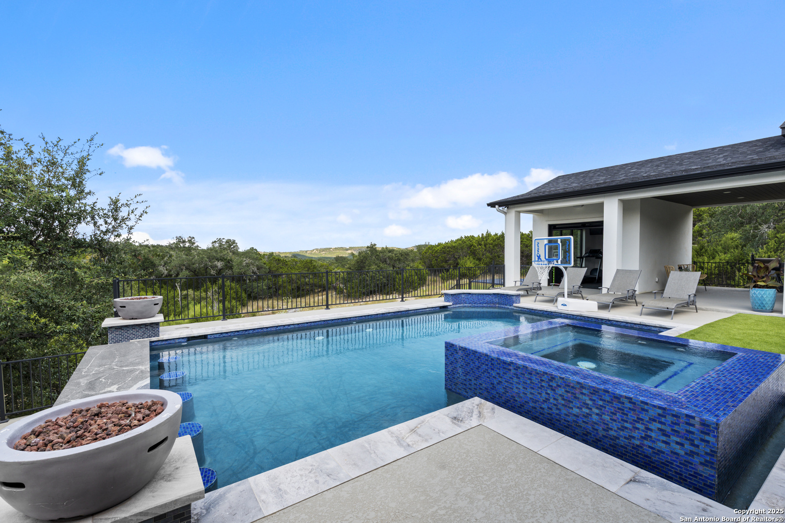 Welcome to 318 Upland Court in the sought-after Mountain Springs Ranch community. This exceptional home features 4 spacious bedrooms, 4.5 luxurious bathrooms, and a layout designed for both elegance and comfort. The front exterior makes a striking impression with a beautifully landscaped yard, wrap-around extended driveway, and 3-car garage. Step inside through a stone-accented entry into a grand foyer with soaring ceilings and expansive windows that fill the space with natural light. The open floor plan includes a custom kitchen with luxury cabinetry, a large waterfall island, abundant storage, and a sleek center fireplace, all complemented by unique accent walls and upscale finishes throughout the entire home. A private office with tall double doors offers a refined workspace, while the primary suite serves as a tranquil retreat with a spa-style bathroom, soaking tub, and oversized shower. The home also features a dedicated movie theater and media room, perfect for entertaining. Outside, enjoy a private backyard oasis complete with a built-in outdoor kitchen, low-maintenance turf, a basketball court, scenic views, and a luxury pool designed for both relaxation and entertaining. Located in a community with walking trails, a pool, park, playground, and BBQ areas, this home offers an elevated lifestyle with thoughtful details in every corner.