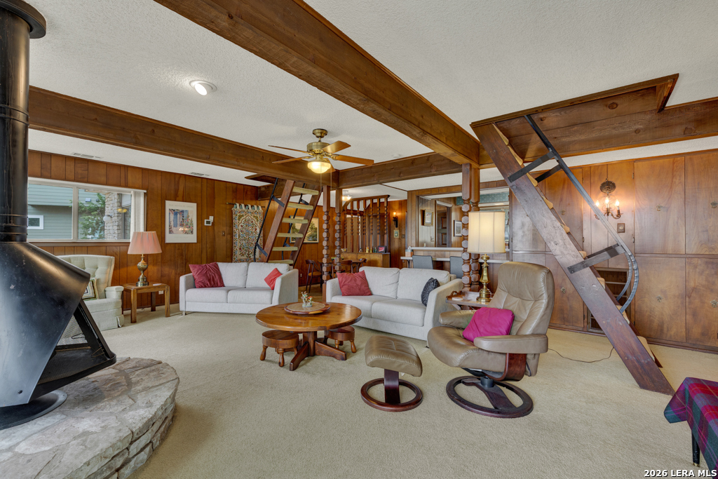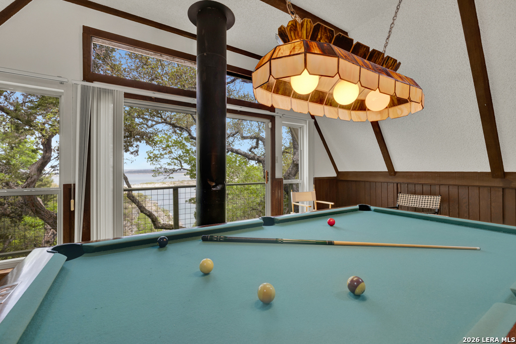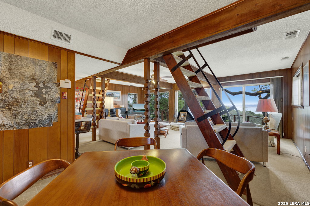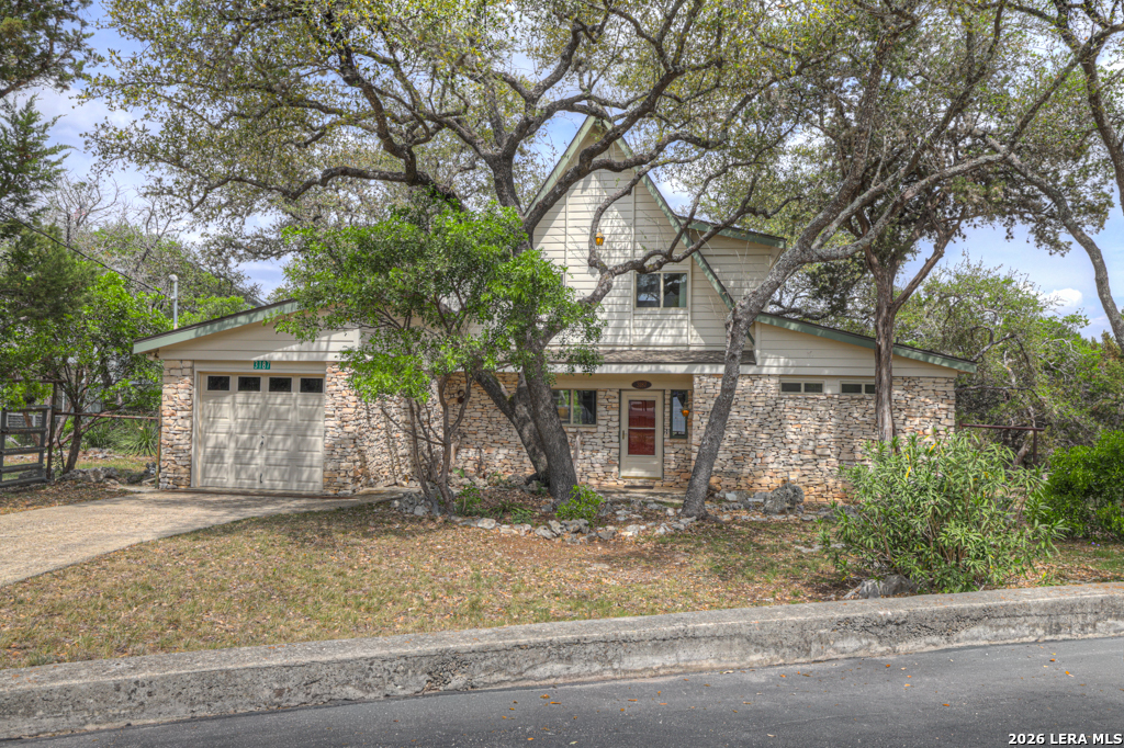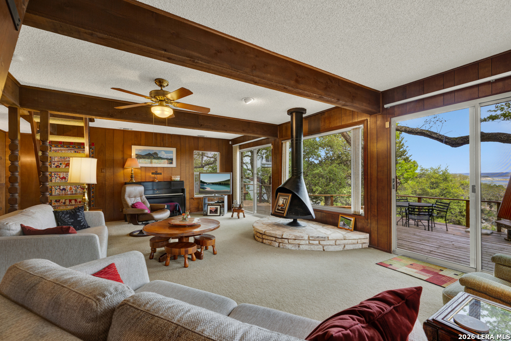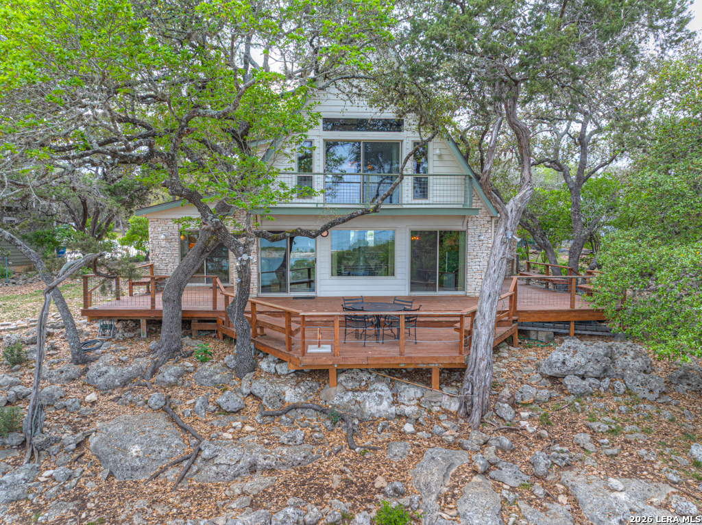 Nestled along the highly sought-after waterfront of Party Cove in Canyon Lake, this unique property offers the perfect blend of laid-back lake living and opportunity for future expansion. Situated on a large lot, there is ample space to build, add on, or create your ideal outdoor setup, complete with dedicated boat parking behind a separate fenced area on the side. Additionally, there is a parking pad off the street, convenient for guest parking. Inside, the home embraces its original Mid-Century Modern charm, full of character and nostalgic appeal. The living room is the heart of the home, featuring expansive lake views and a wood-burning stove that adds warmth without obstructing the scenery. The primary bedroom is thoughtfully located on the first floor, offering easy accessibility and privacy. Upstairs, you'll find a versatile game room with a pool table. This level includes two additional bedrooms, a full bathroom, and access to a private balcony, perfect for enjoying peaceful mornings or views over the water. The backyard is designed for entertaining and relaxation, boasting a spacious wraparound deck with plenty of room for gatherings. Surrounded by the natural beauty of the Texas Hill Country, the property is frequented by local wildlife, including deer, foxes and squirrels, creating a serene and picturesque setting. Additional highlights include a roof replacement completed in 2024, providing peace of mind for years to come. Ideally located, this home offers a convenient commute to nearby towns while still delivering the tranquility and escape of true lake life. Whether you're looking for a weekend retreat, investment opportunity, or full-time residence, this waterfront gem is full of potential and charm.