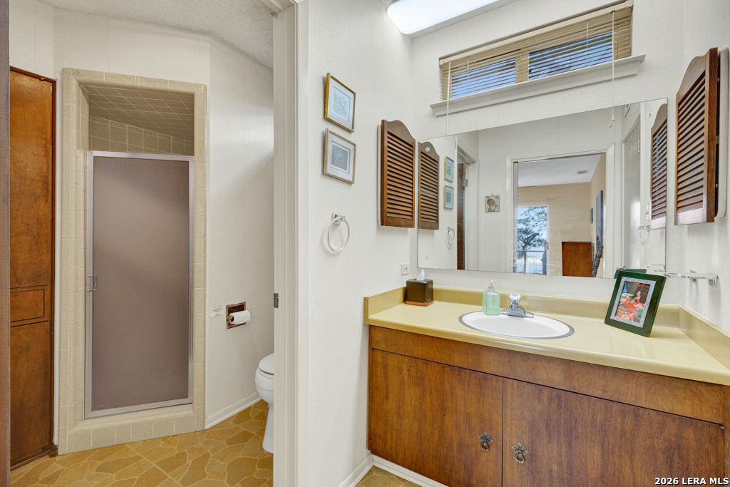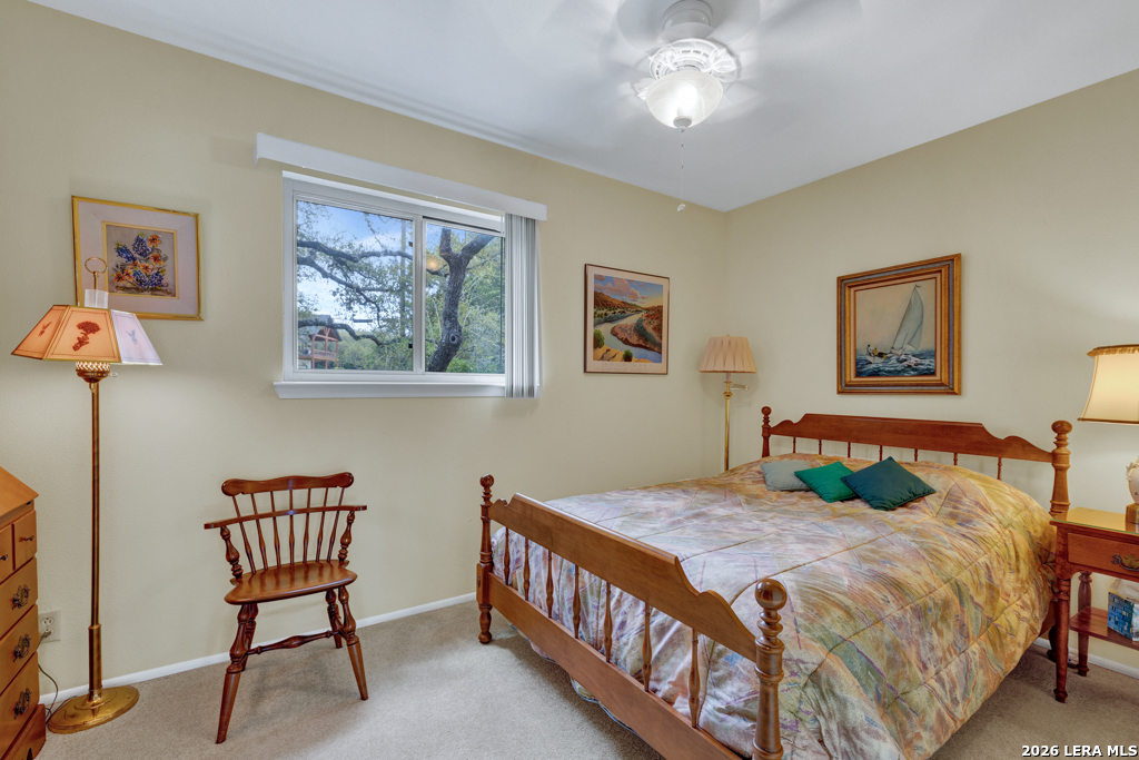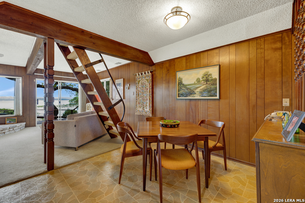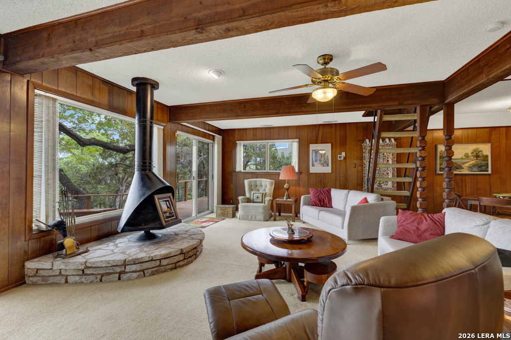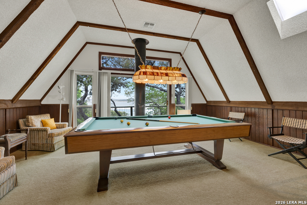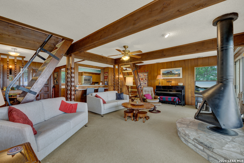 Nestled along the highly sought-after waterfront of Party Cove in Canyon Lake, this unique property offers the perfect blend of laid-back lake living and opportunity for future expansion. Situated on a large lot, there is ample space to build, add on, or create your ideal outdoor setup, complete with dedicated boat parking behind a separate fenced area on the side. Additionally, there is a parking pad off the street, convenient for guest parking. Inside, the home embraces its original Mid-Century Modern charm, full of character and nostalgic appeal. The living room is the heart of the home, featuring expansive lake views and a wood-burning stove that adds warmth without obstructing the scenery. The primary bedroom is thoughtfully located on the first floor, offering easy accessibility and privacy. Upstairs, you'll find a versatile game room with a pool table. This level includes two additional bedrooms, a full bathroom, and access to a private balcony, perfect for enjoying peaceful mornings or views over the water. The backyard is designed for entertaining and relaxation, boasting a spacious wraparound deck with plenty of room for gatherings. Surrounded by the natural beauty of the Texas Hill Country, the property is frequented by local wildlife, including deer, foxes and squirrels, creating a serene and picturesque setting. Additional highlights include a roof replacement completed in 2024, providing peace of mind for years to come. Ideally located, this home offers a convenient commute to nearby towns while still delivering the tranquility and escape of true lake life. Whether you're looking for a weekend retreat, investment opportunity, or full-time residence, this waterfront gem is full of potential and charm.