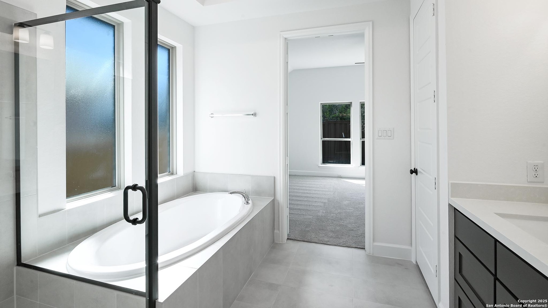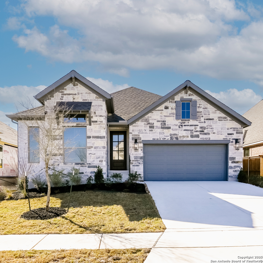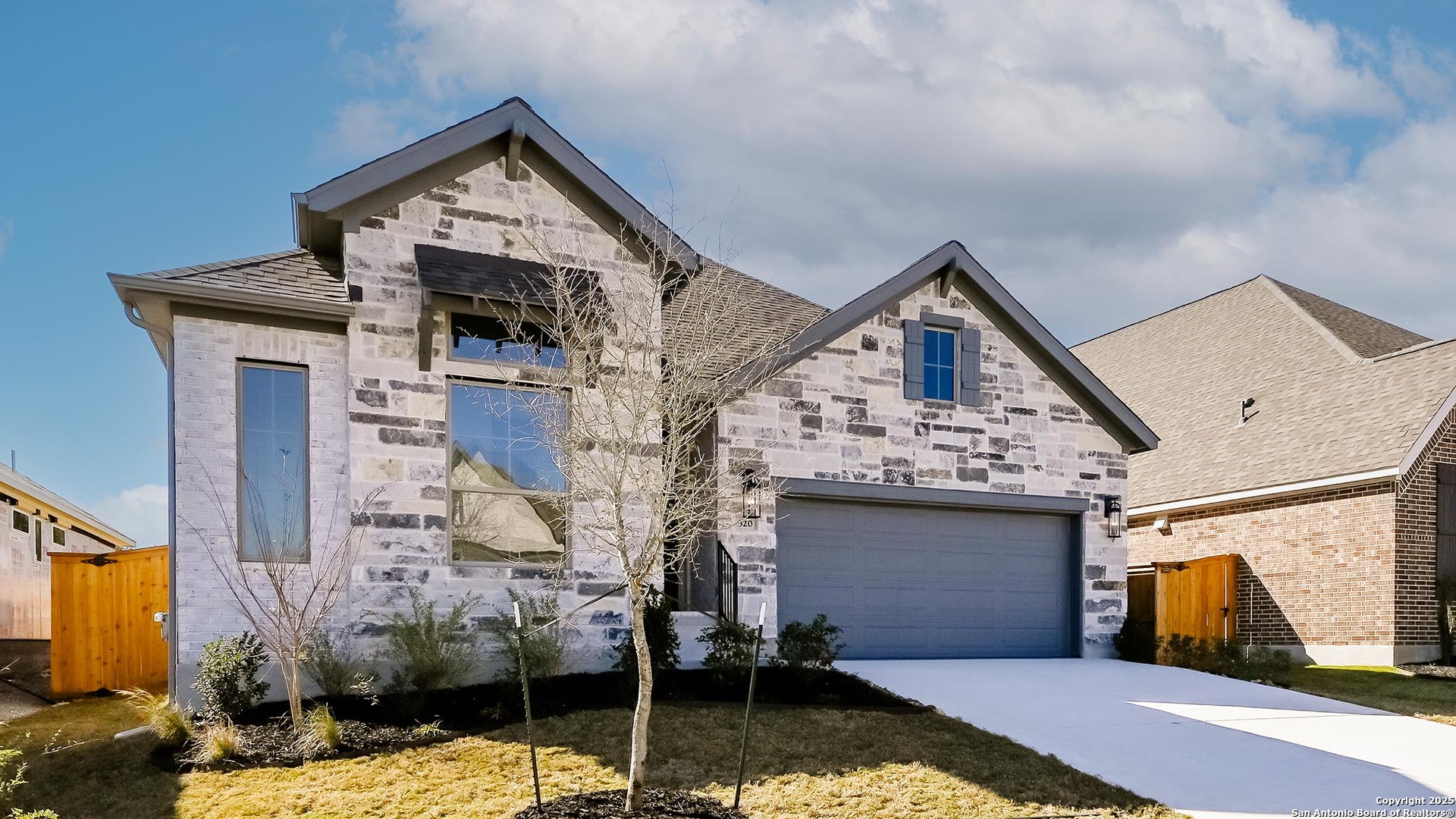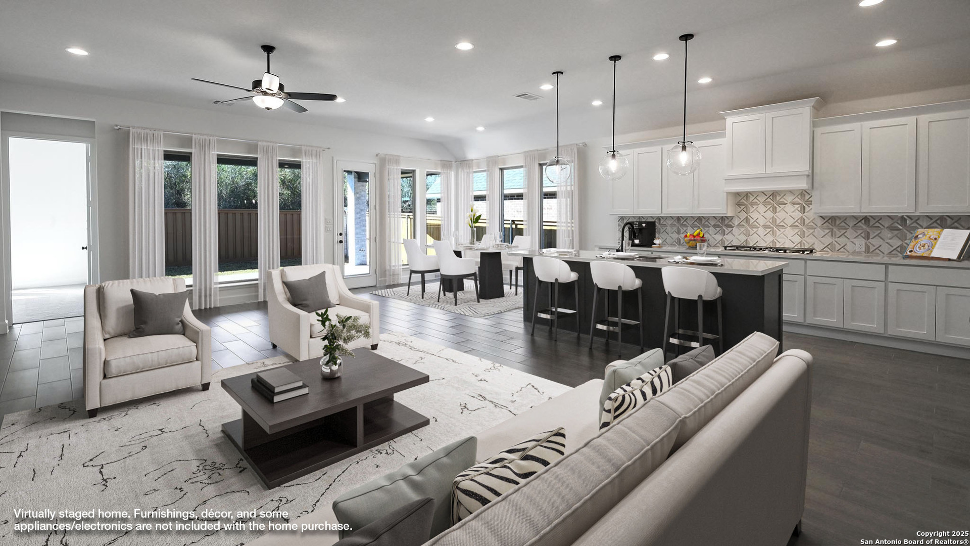 READY FOR MOVE IN!! Home office with French doors off extended entry with 12-foot ceiling. Spacious family room with wall of windows opens to kitchen and dining area. Kitchen offers walk-in pantry, 5-burner gas cooktop and generous island with built-in seating space. Private primary suite includes bedroom with wall of windows. Double doors lead to primary bath with dual vanities, corner garden tub, separate glass-enclosed shower and large walk-in closet. This open one-story design features a guest suite with full bath. Abundant closet space throughout. Extended covered backyard patio. Mud room off three-car garage.