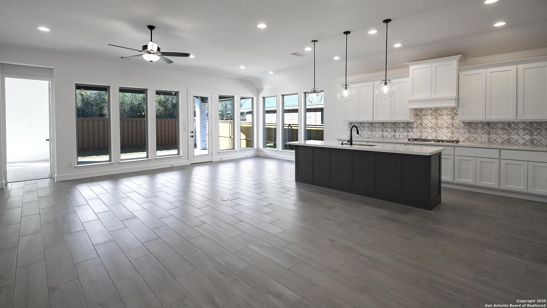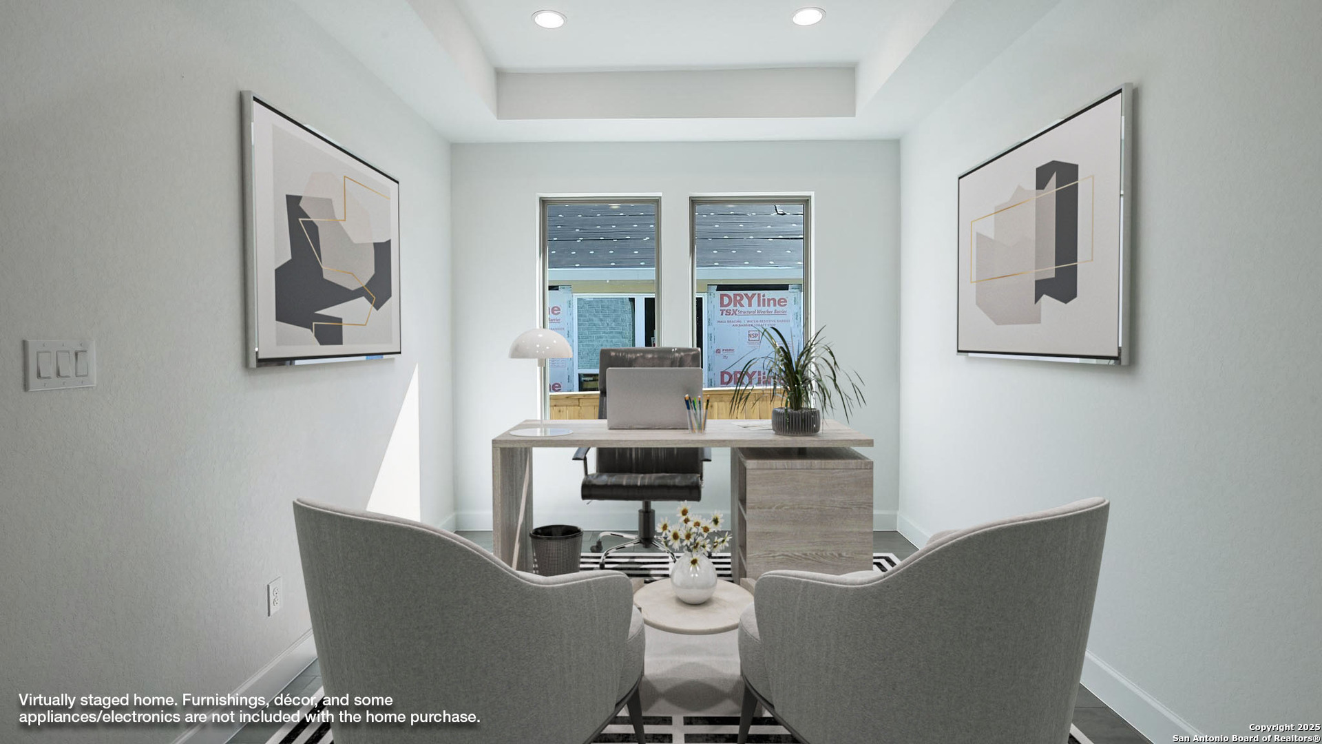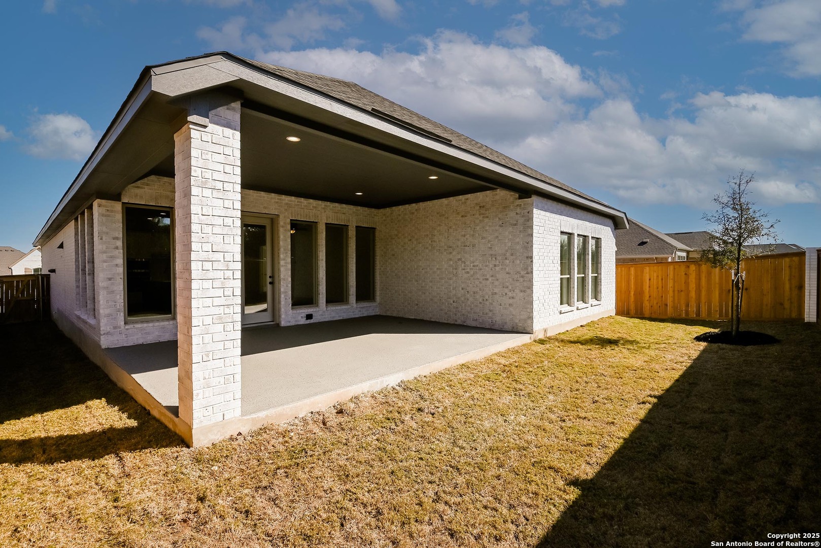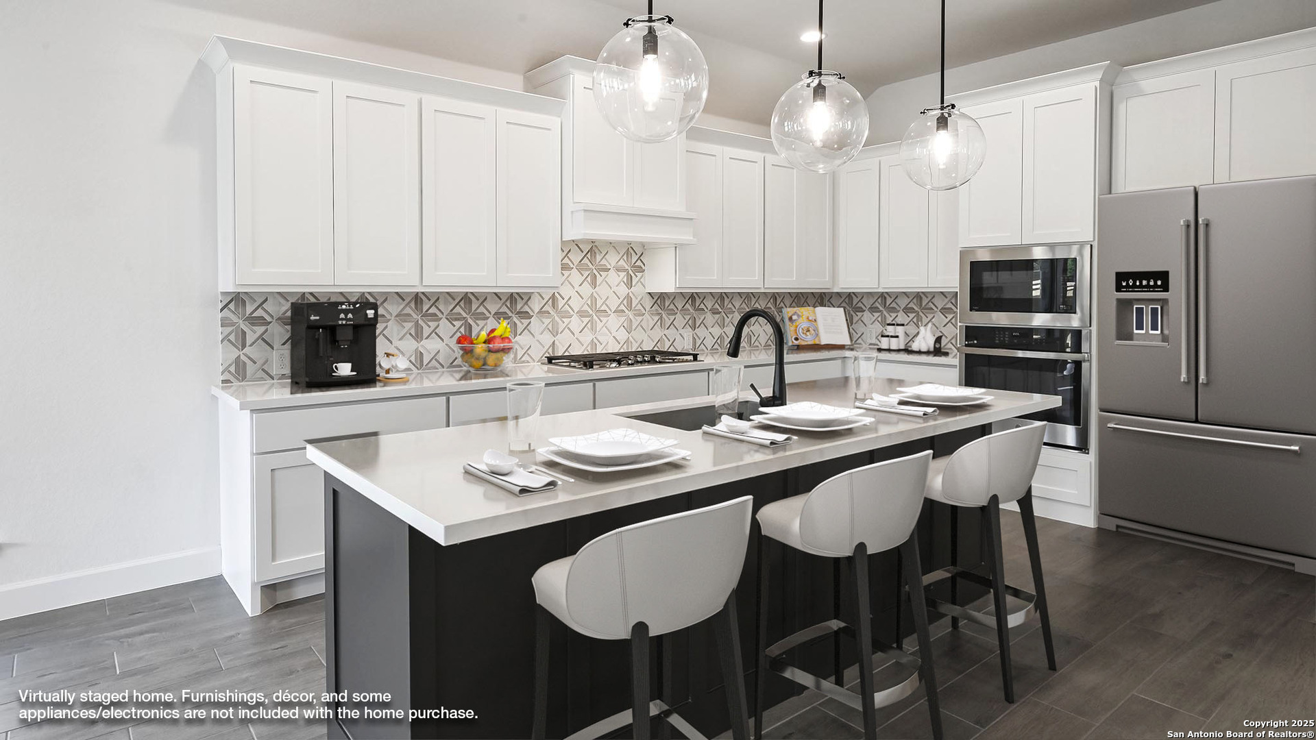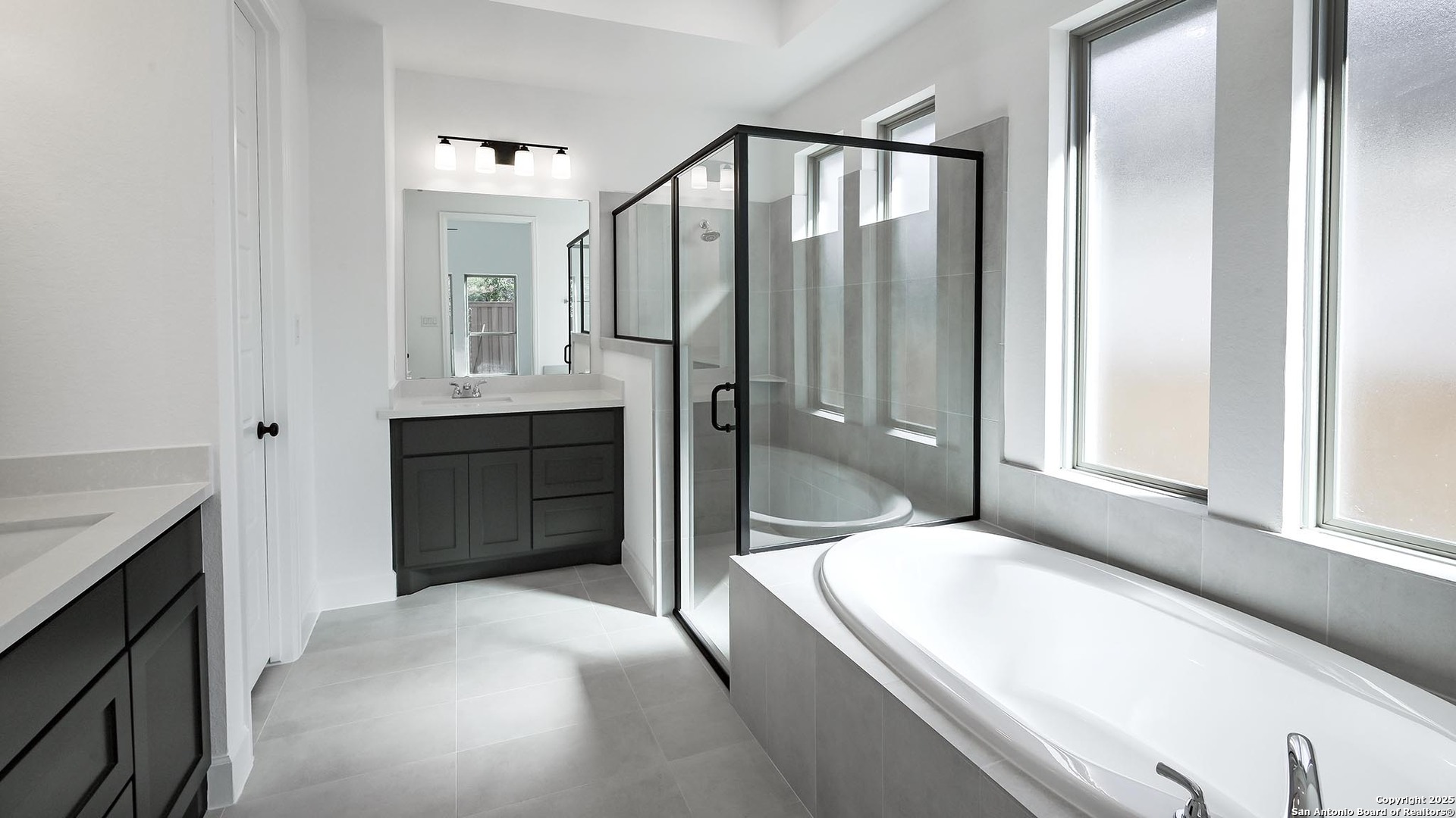 READY FOR MOVE IN!! Home office with French doors off extended entry with 12-foot ceiling. Spacious family room with wall of windows opens to kitchen and dining area. Kitchen offers walk-in pantry, 5-burner gas cooktop and generous island with built-in seating space. Private primary suite includes bedroom with wall of windows. Double doors lead to primary bath with dual vanities, corner garden tub, separate glass-enclosed shower and large walk-in closet. This open one-story design features a guest suite with full bath. Abundant closet space throughout. Extended covered backyard patio. Mud room off three-car garage.