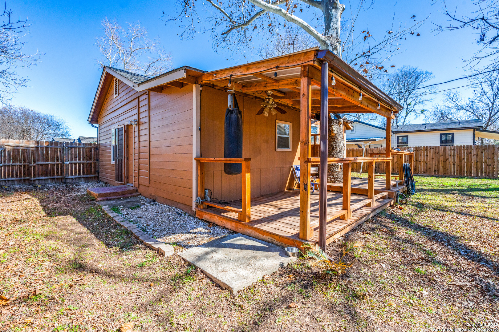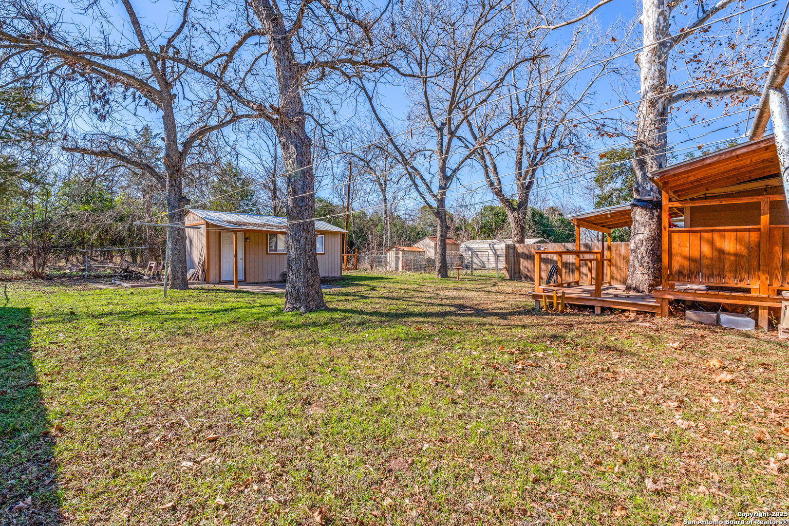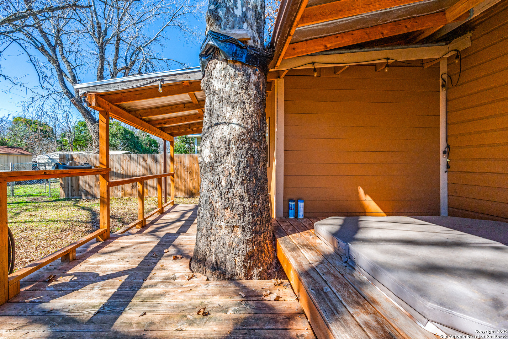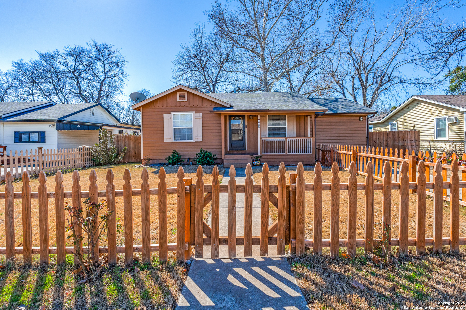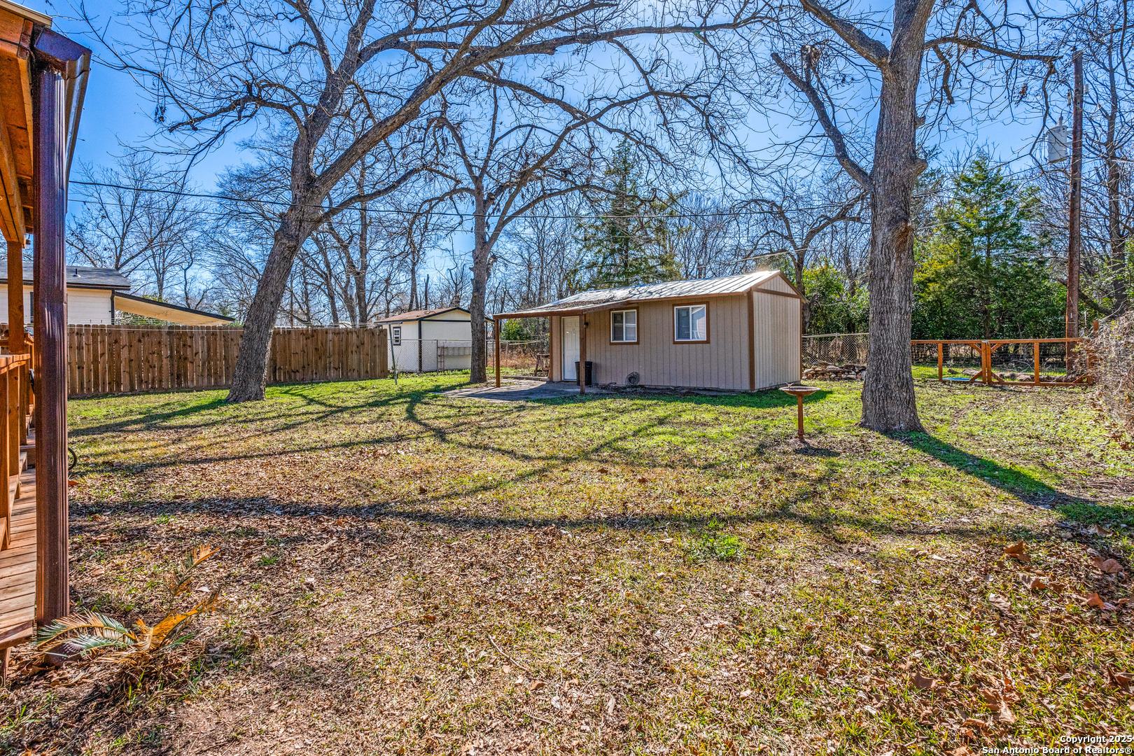 This gorgeous home is meticulously maintained. The updated features include fresh outdoor paint, front porch, front fence, privacy fence, rear deck with privacy heated hot tub (freeze protected), 25'x15' two-room storage shed, gutters, and lighted attic for storage. The entry fence gate welcomes you through a sidewalk surrounded with Bermuda grass and onto an updated front porch. The entry door leads into a wooden floor living room, the type of flooring throughout the entire home. Additional storage space in the laundry room with plumbing to add-on an enclosed bathroom and plenty of storage space in the attic and backyard shed. Convenient to IH35, SH123 and SH80, minutes away from major shopping, dining and entertainment. This is more than just a home with an updated patio deck, privacy hot tub, mature trees, and backyard green space for entertainment. Don't miss your chance to own this extraordinary property.