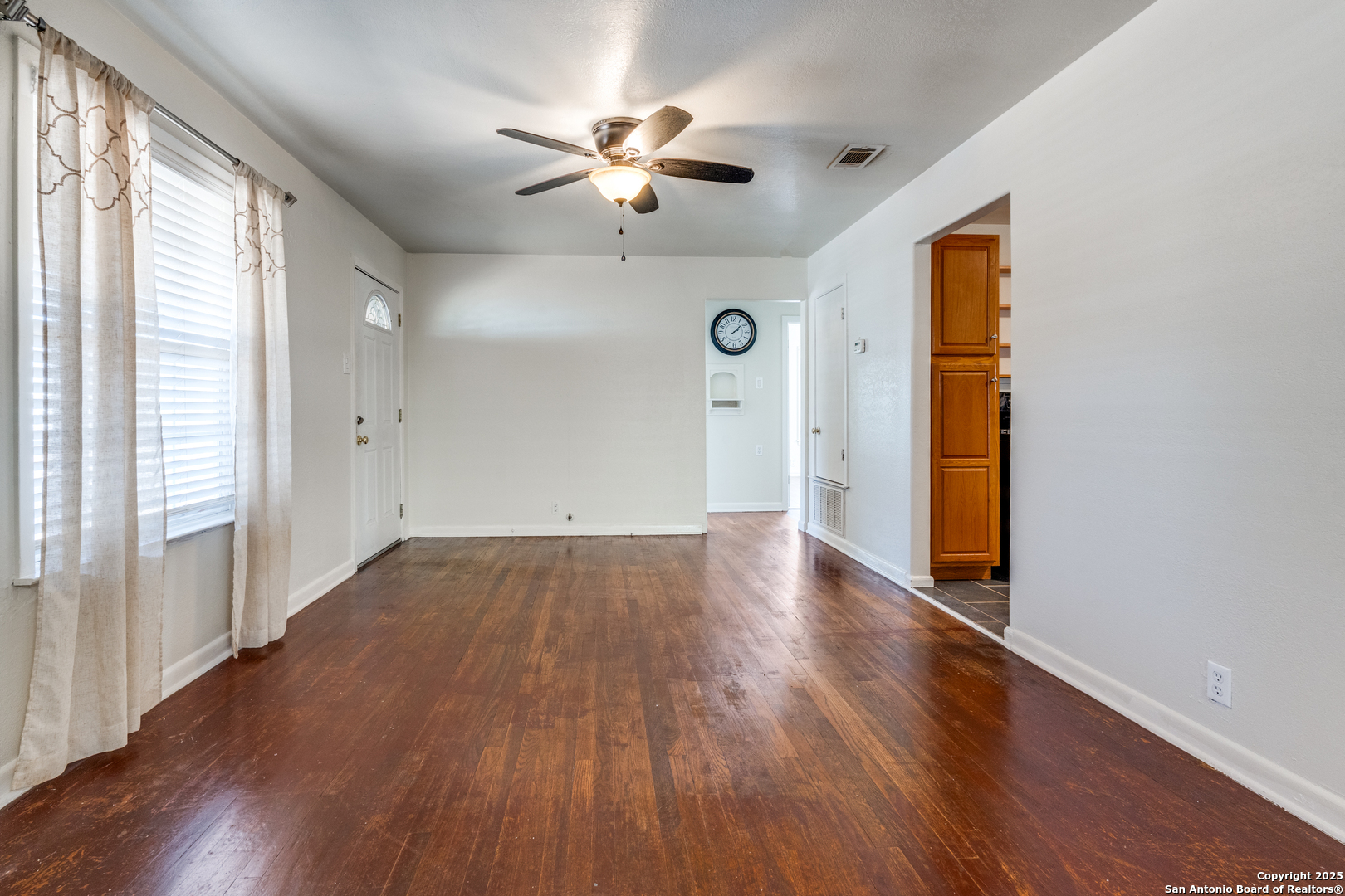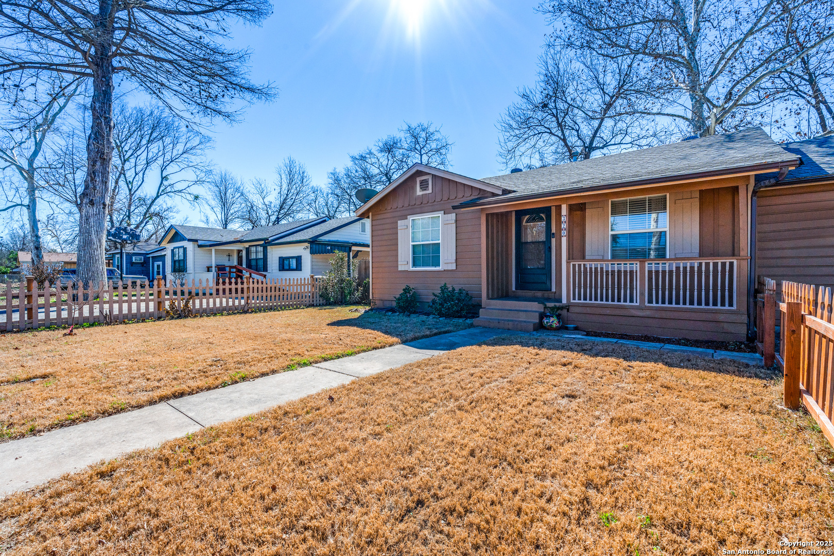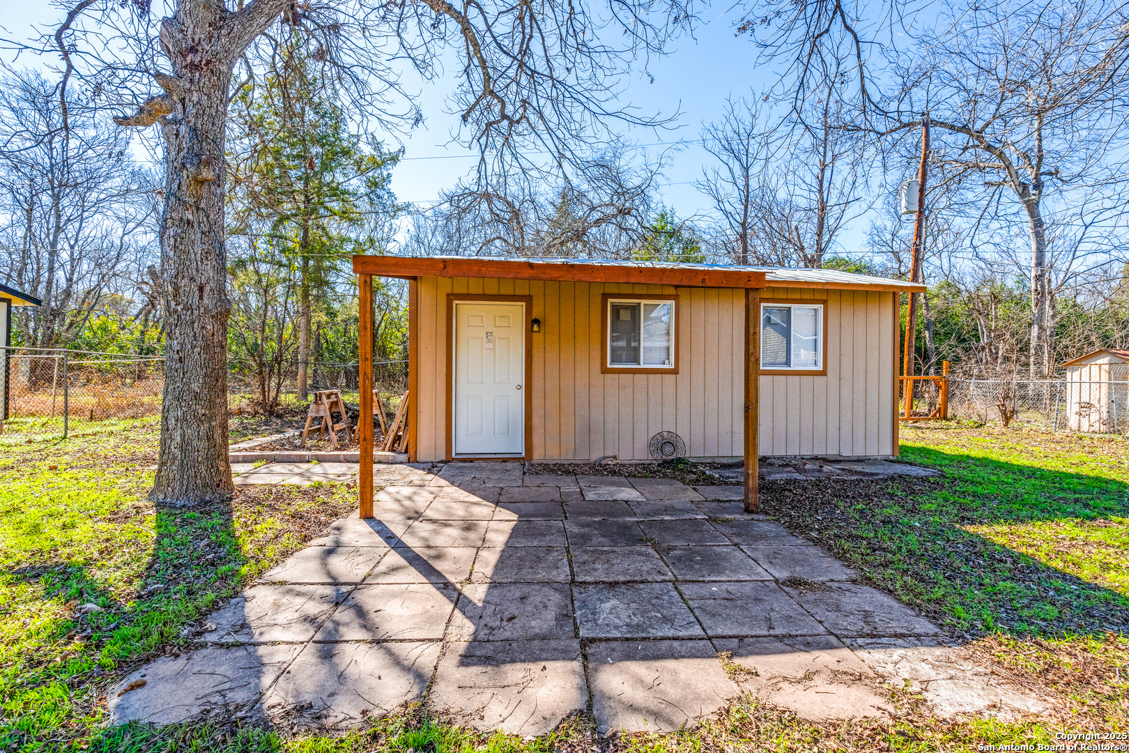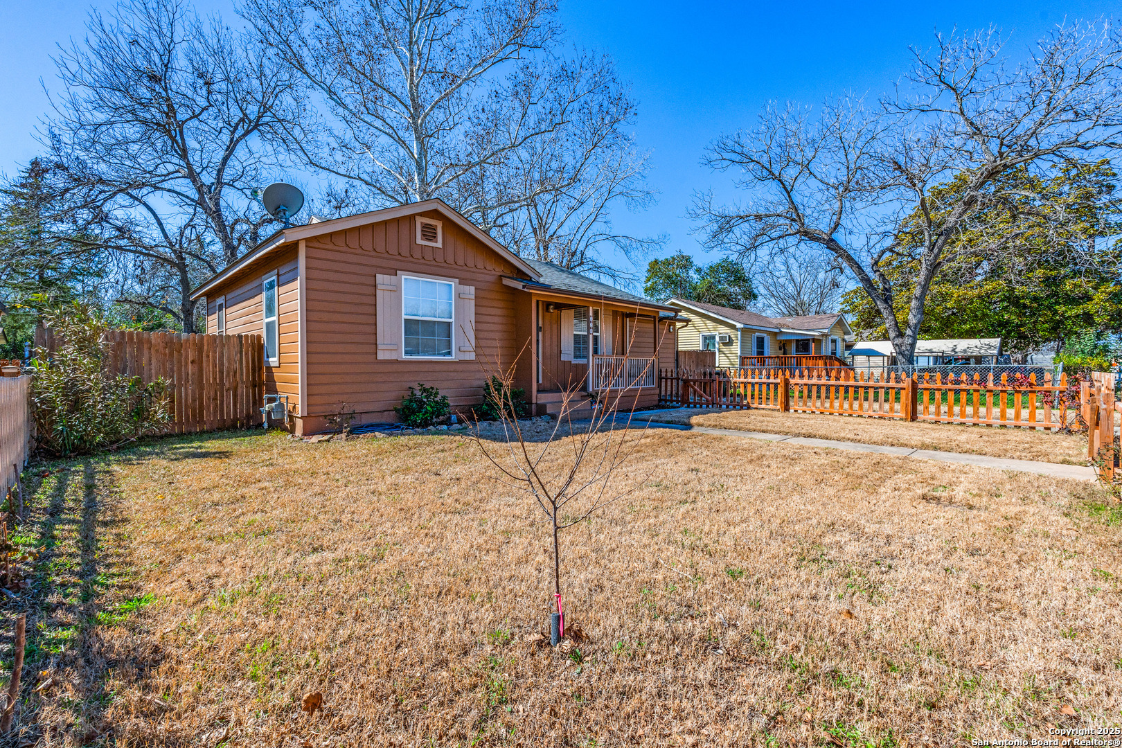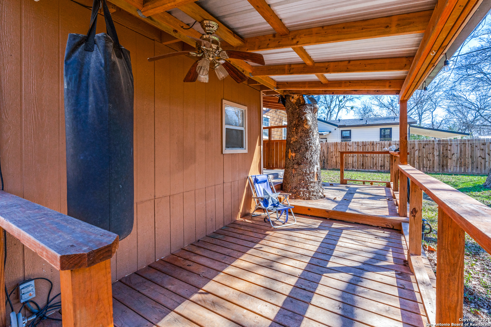This gorgeous home is meticulously maintained. The updated features include fresh outdoor paint, front porch, front fence, privacy fence, rear deck with privacy heated hot tub (freeze protected), 25'x15' two-room storage shed, gutters, and lighted attic for storage. The entry fence gate welcomes you through a sidewalk surrounded with Bermuda grass and onto an updated front porch. The entry door leads into a wooden floor living room, the type of flooring throughout the entire home. Additional storage space in the laundry room with plumbing to add-on an enclosed bathroom and plenty of storage space in the attic and backyard shed. Convenient to IH35, SH123 and SH80, minutes away from major shopping, dining and entertainment. This is more than just a home with an updated patio deck, privacy hot tub, mature trees, and backyard green space for entertainment. Don't miss your chance to own this extraordinary property.