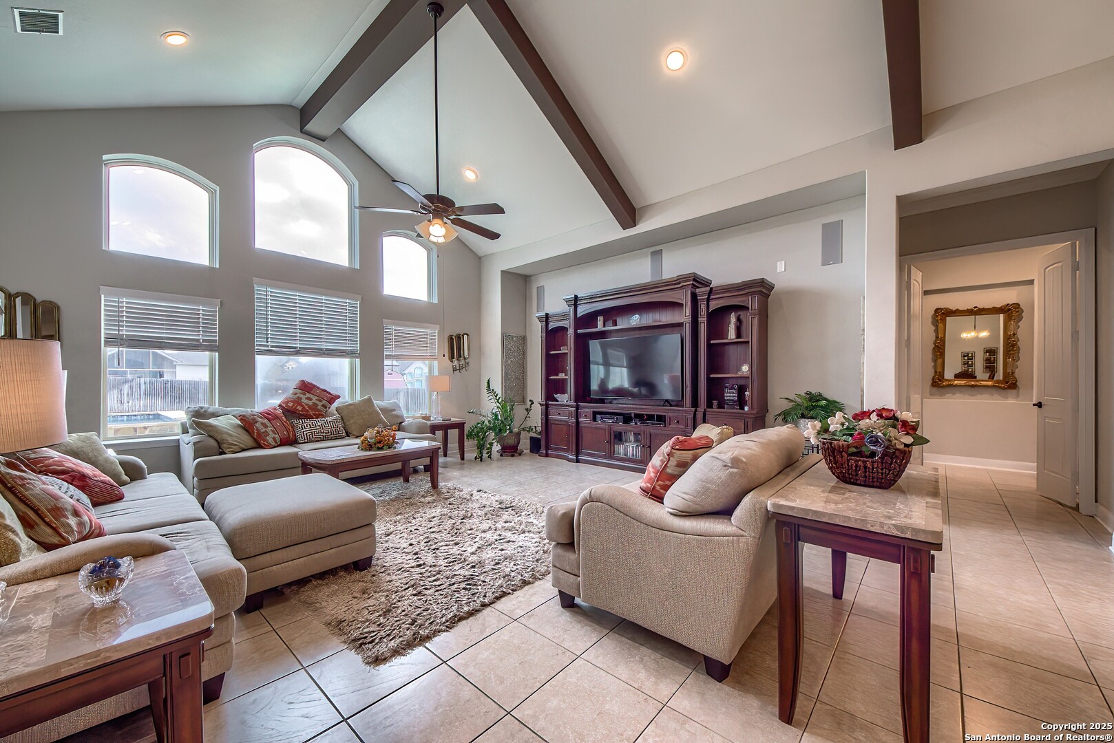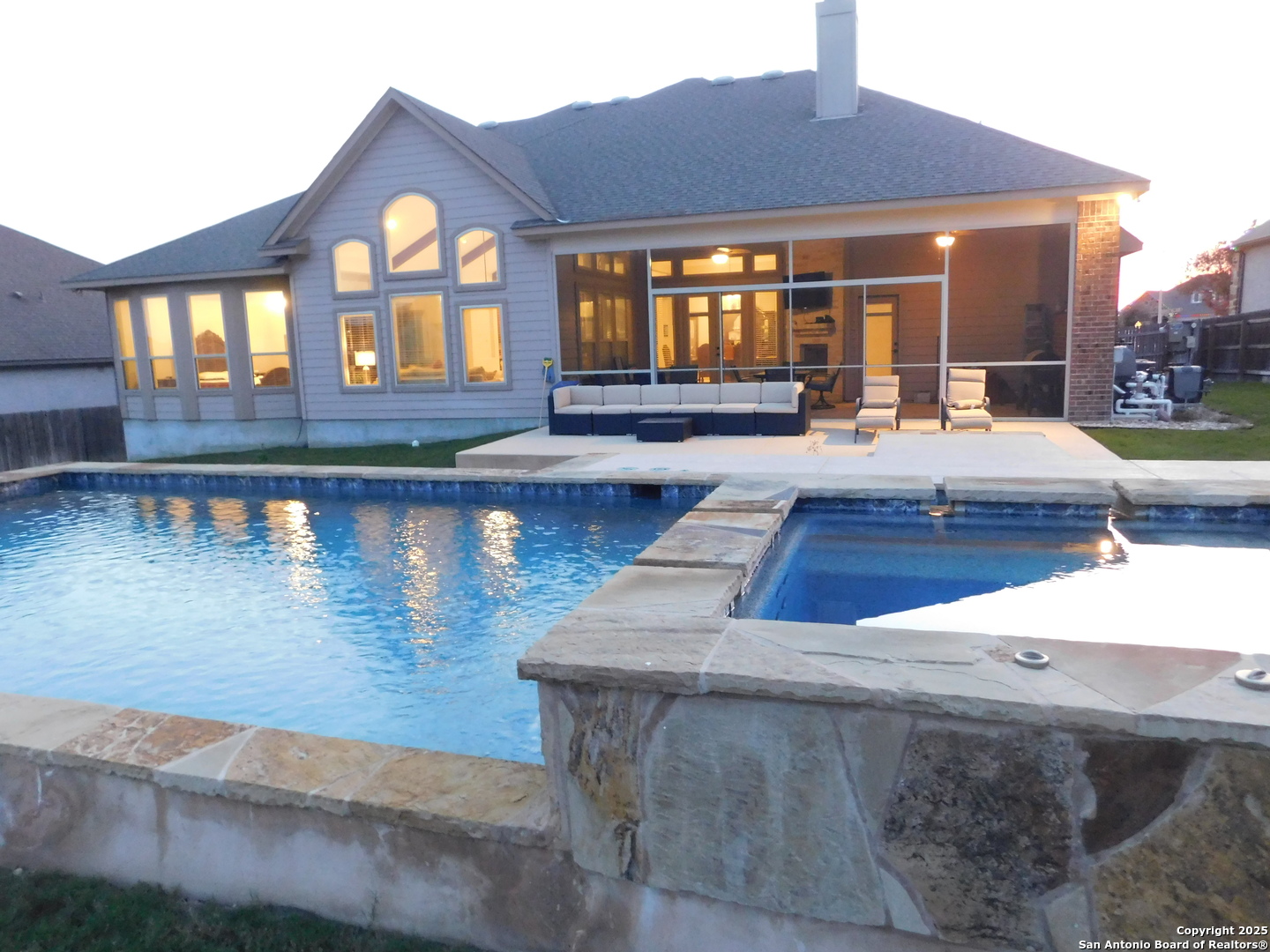 Elegant and meticulously maintained 4-bedroom, 3.5-bath home situated on an expansive 100-foot-wide lot of approximately 0.40 acres in the desirable Harvest Hills community. This stunning residence features soaring ceilings accented with wood beams and a thoughtfully designed open floor plan ideal for both everyday living and entertaining. The gourmet kitchen offers granite countertops, a large center island with breakfast bar, abundant cabinetry, and generous workspace for the home chef. The spacious primary suite serves as a private retreat, complete with an oversized walk-in closet and a spa-like bathroom featuring double vanities, an extra-large custom shower, and a jetted garden tub. A secondary bedroom includes an en-suite bath, while additional secondary bedrooms are generously sized with walk-in closets. Outdoor living is exceptional with a custom Keith Zars heated in-ground pool and spa, a huge screened-in patio with fireplace and TV mount, plus an extended patio perfect for entertaining year-round. Harvest Hills amenities include a fishing pond with pier, pool, tennis and basketball courts, boat and RV storage, and an FFA pen for applicable animals. Conveniently located just minutes from New Braunfels, Schertz, and Cibolo, with easy access to H-E-B, Randolph AFB, and nearby military bases. This home truly has it all-space, luxury, and an unbeatable location.