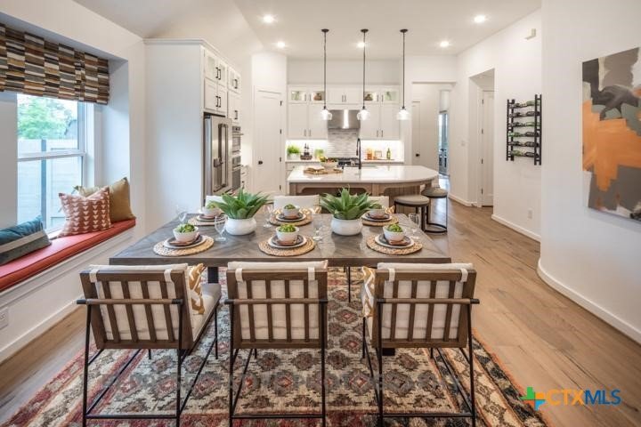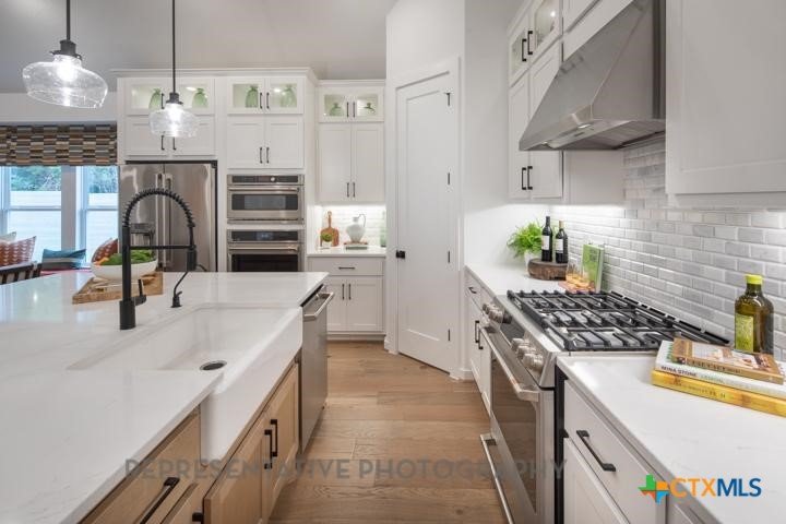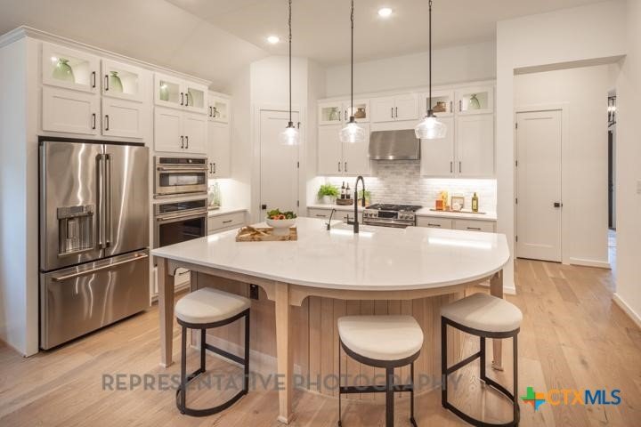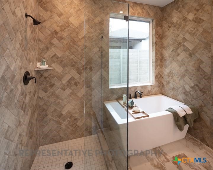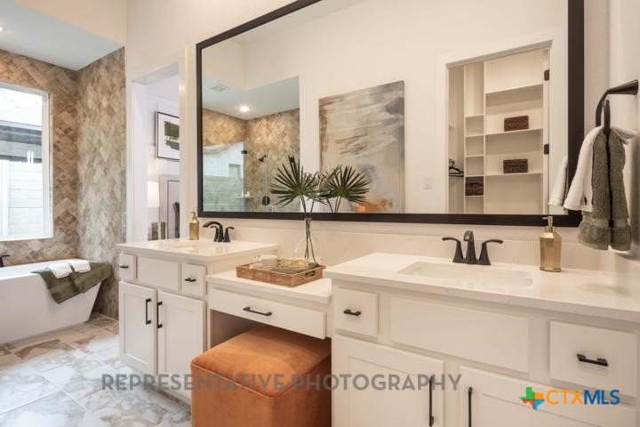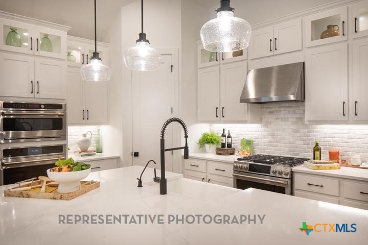 Popular Rover plan with four sides brick, 11’ ceilings and wood flooring in all common areas. Designer kitchen built in ss appliances, quartz countertops, under cabinet lighting and a filtered water loop. Primary bath has separate shower and rectangular freestanding tub. Tankless water heater and Smart Home technology. Gas drop at patio. Full sod and sprinkler system included!!!